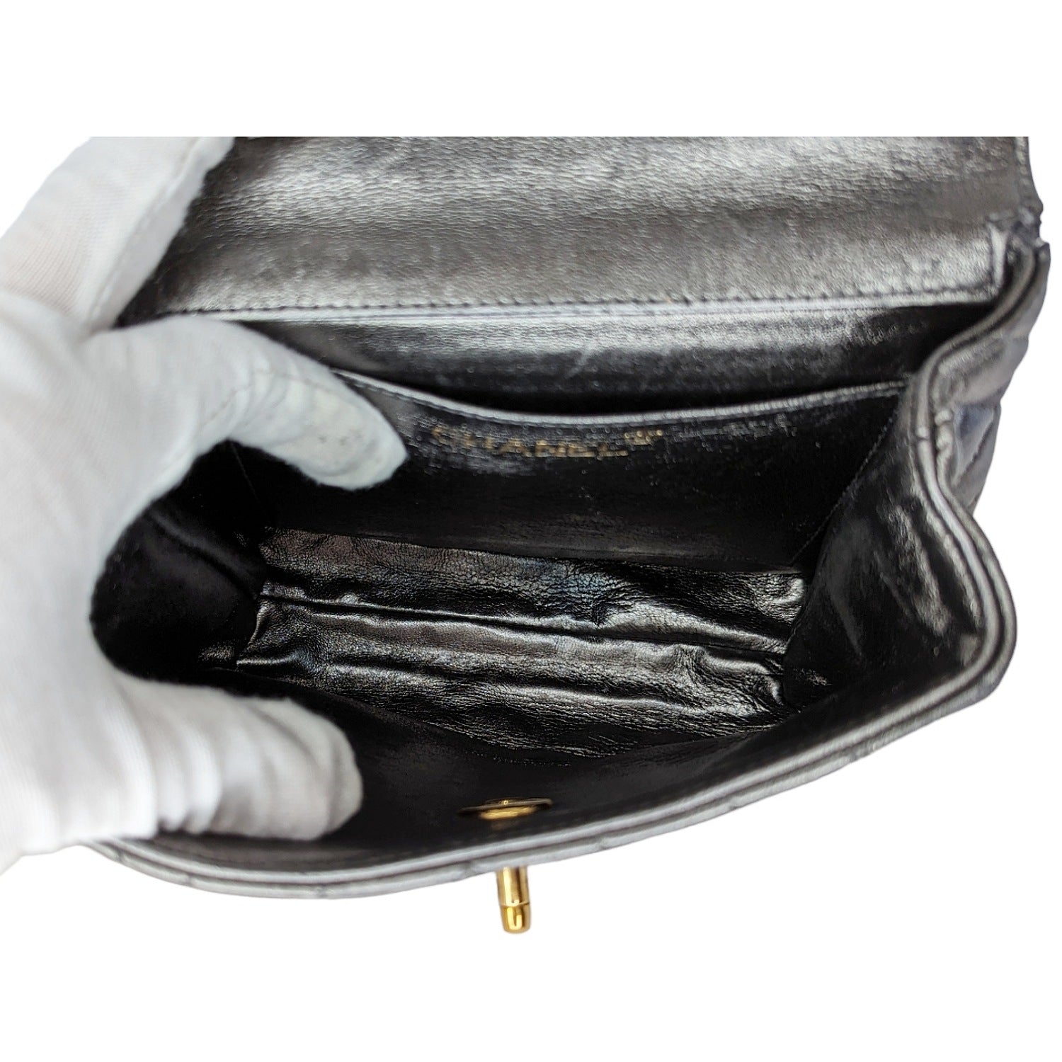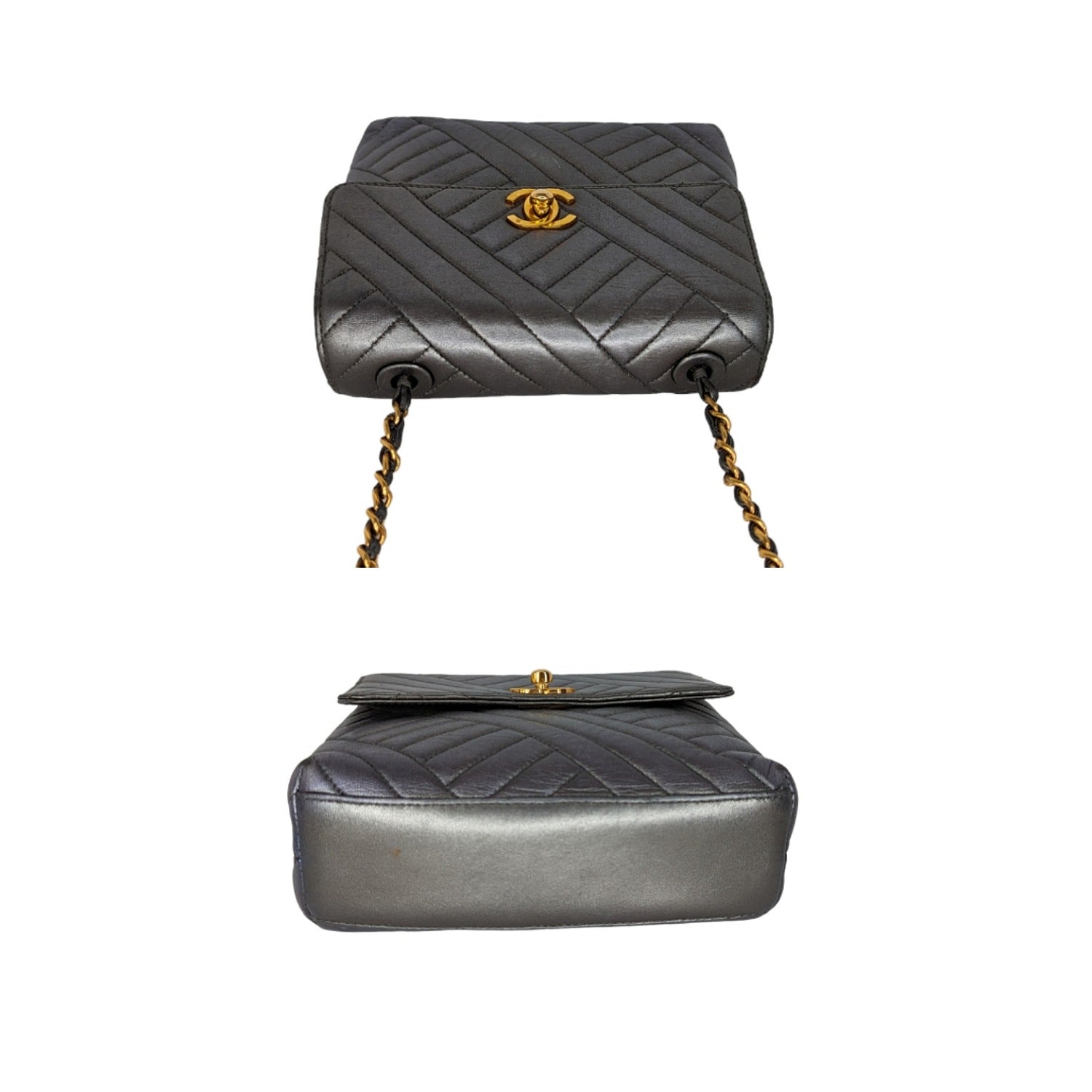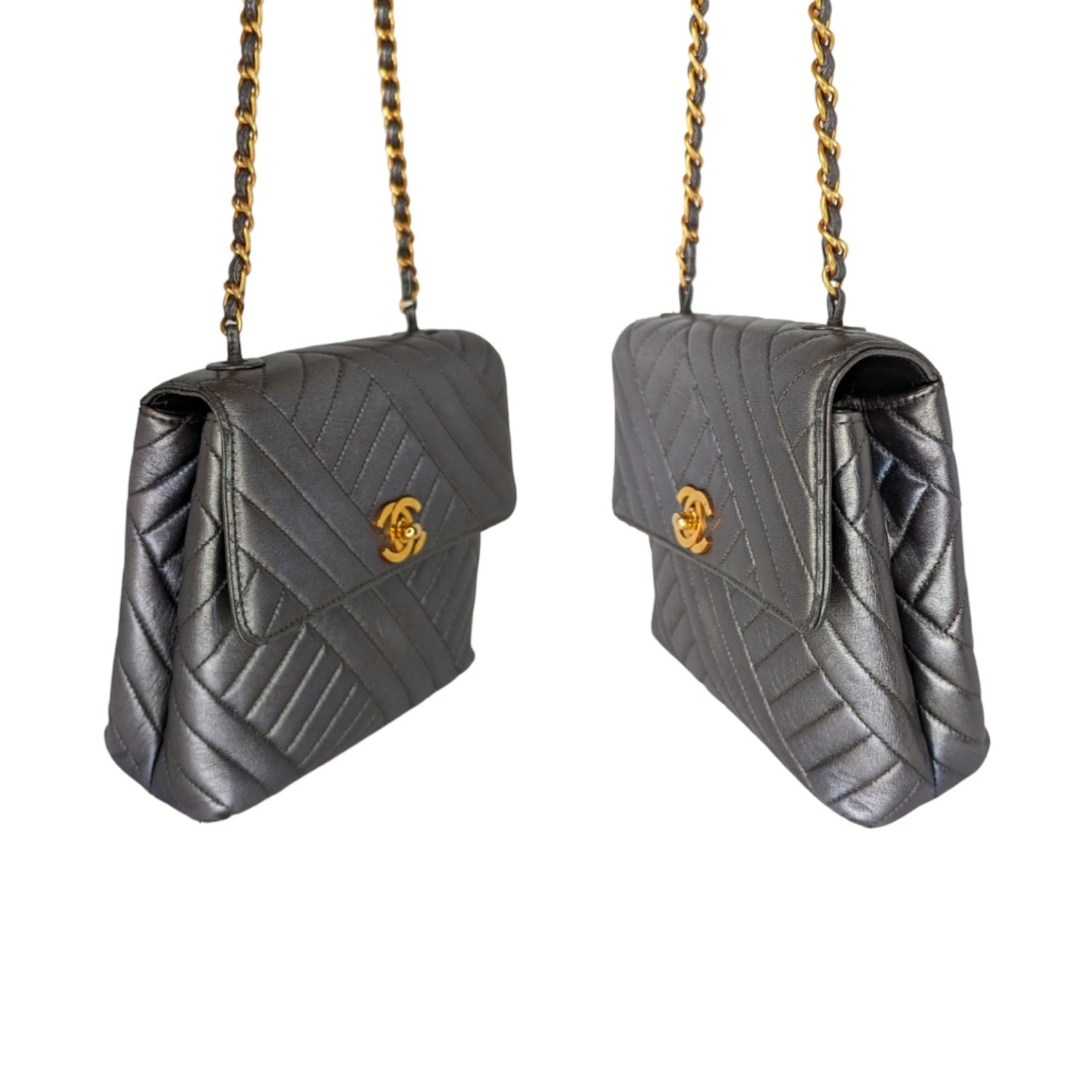 Beautiful Chanel bag Vintage crossbody bag. Crafted of metallic lambskin leather in dark gray, the CC turn-lock is in 24K gold plated, tonal interior leather housing a single flat pocket. The bag can be on the shoulder or across the body. The serial number is inside the bag and is intact.