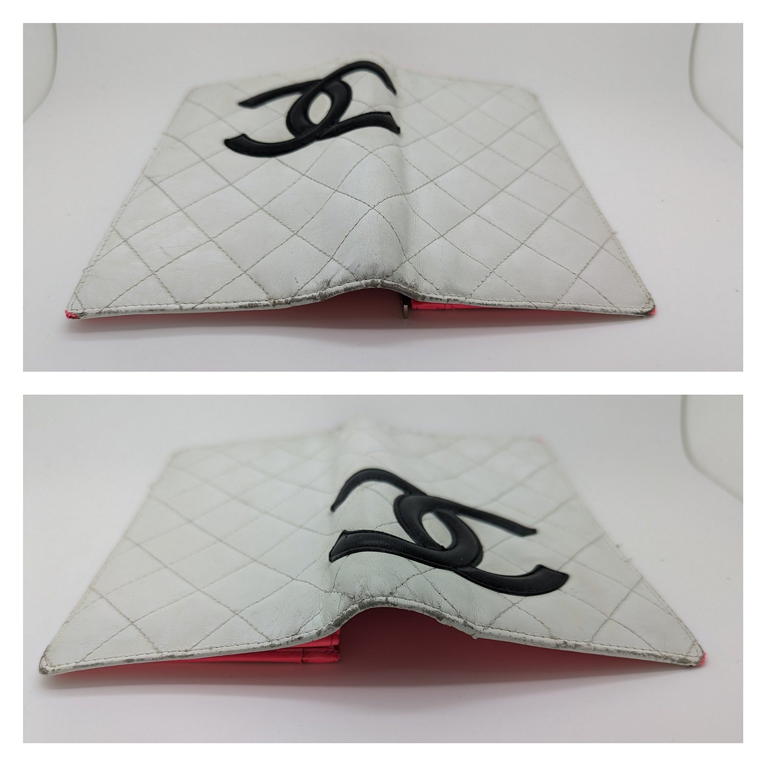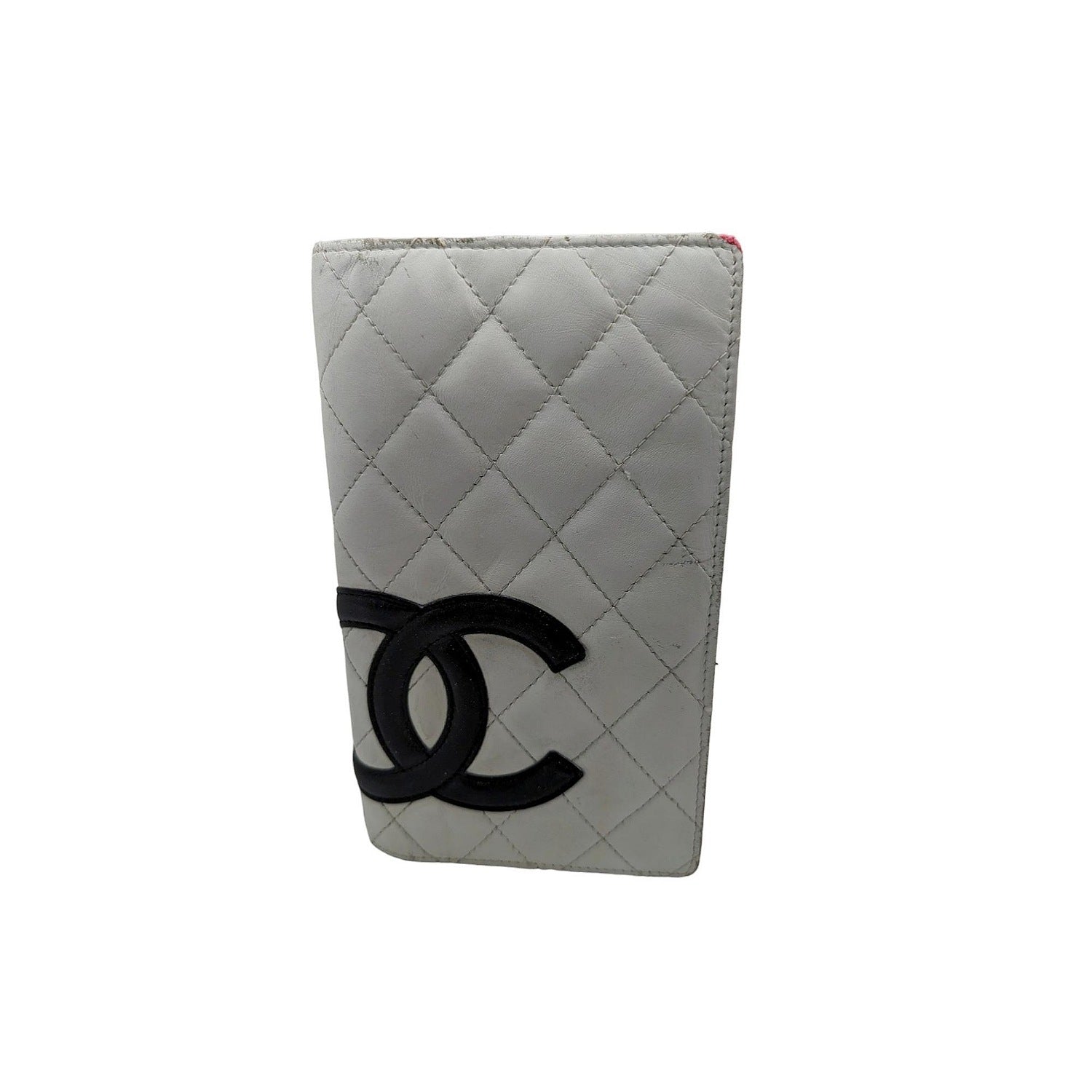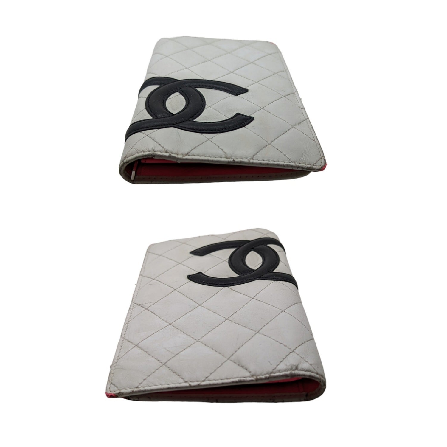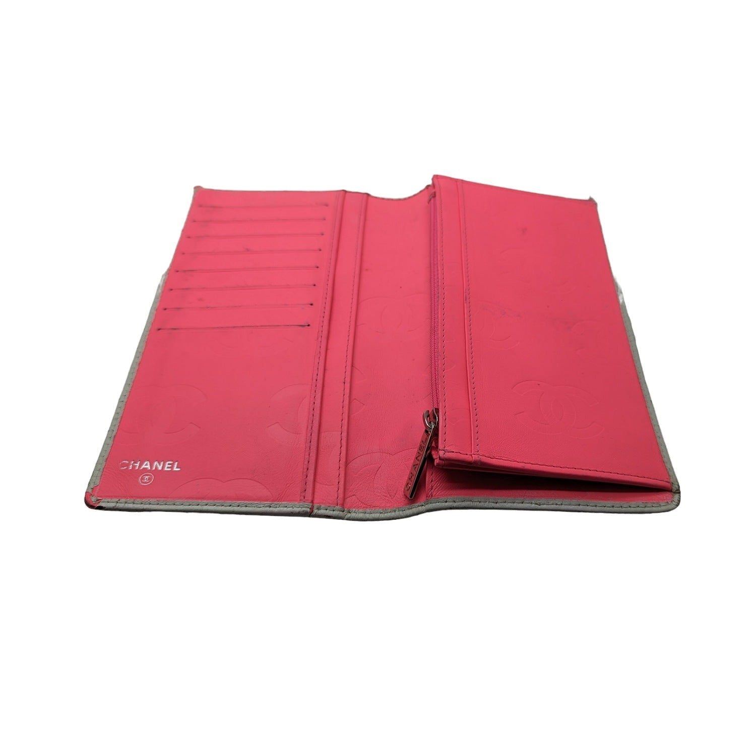 Chanel bag Continental Wallet by Karl Lagerfeld in white quilted leather with interlocking CC logo in black and silver-tone hardware, logo jacquard pink lining & three interior pockets with card slots. Made in Italy.