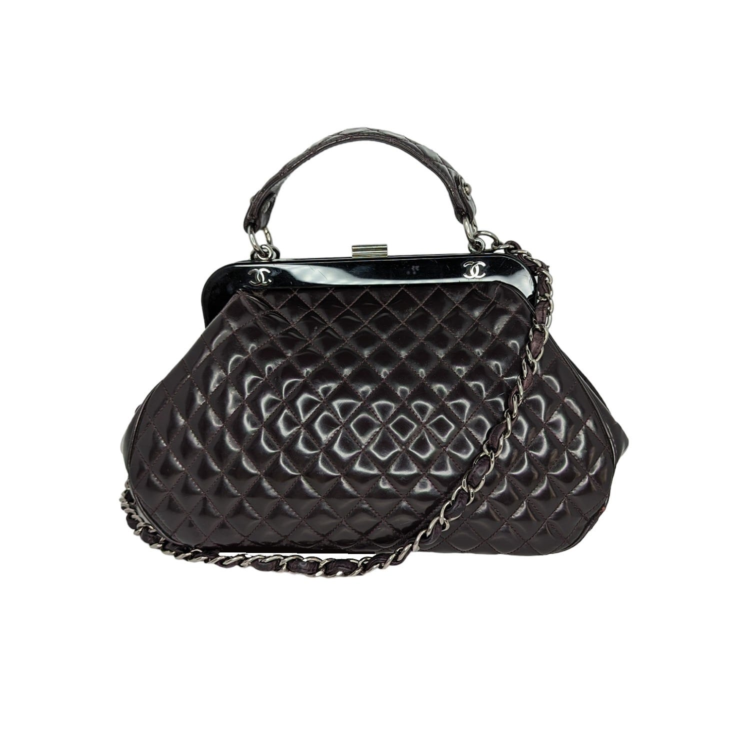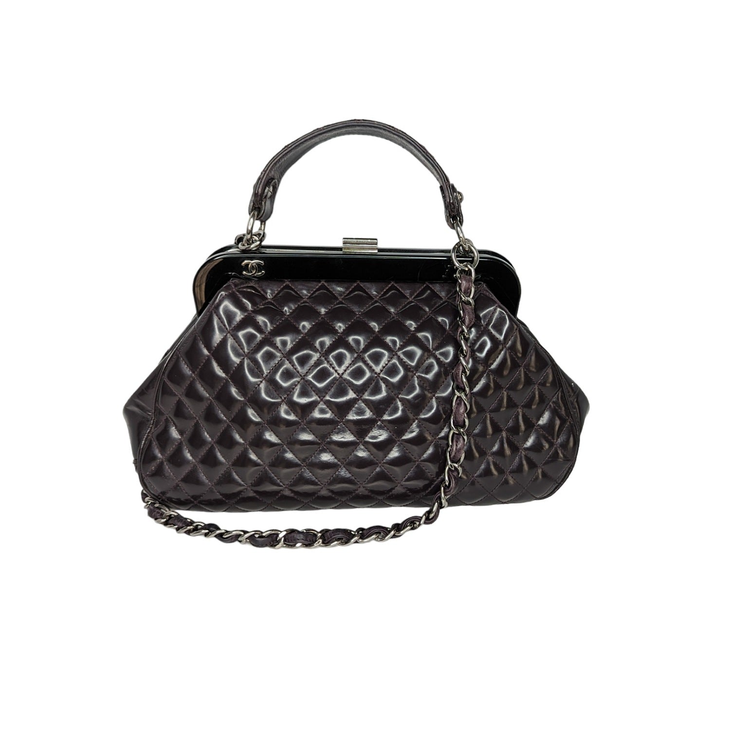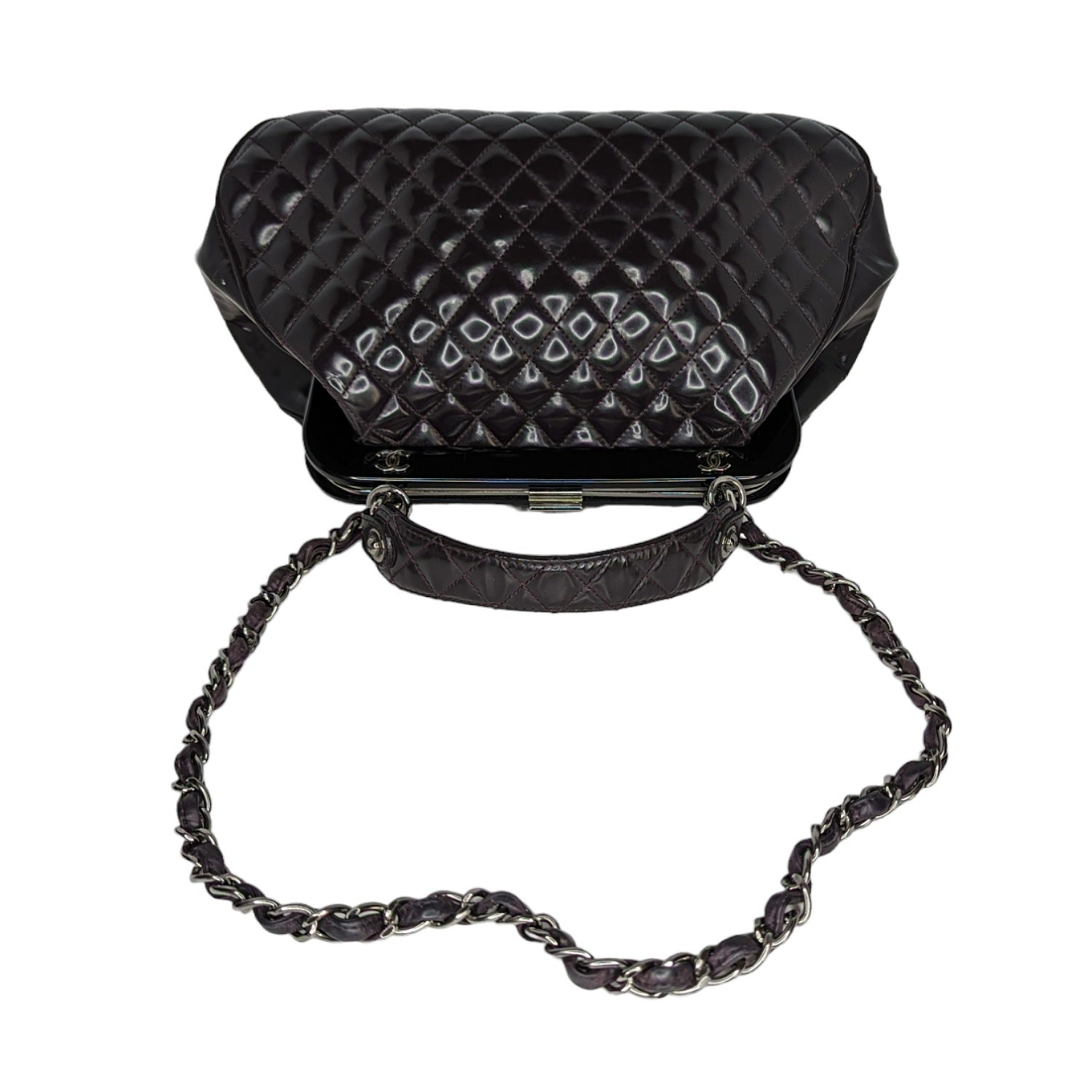 Eggplant quilted patent leather Chanel bag Mademoiselle Frame satchel with silver-tone hardware, single flat top handle, leather and chain-link shoulder strap, resin top frame featuring CC logo emblems, gray striped woven lining, dual pockets at interior walls; one with zip closure and push-lock closure at top frame.