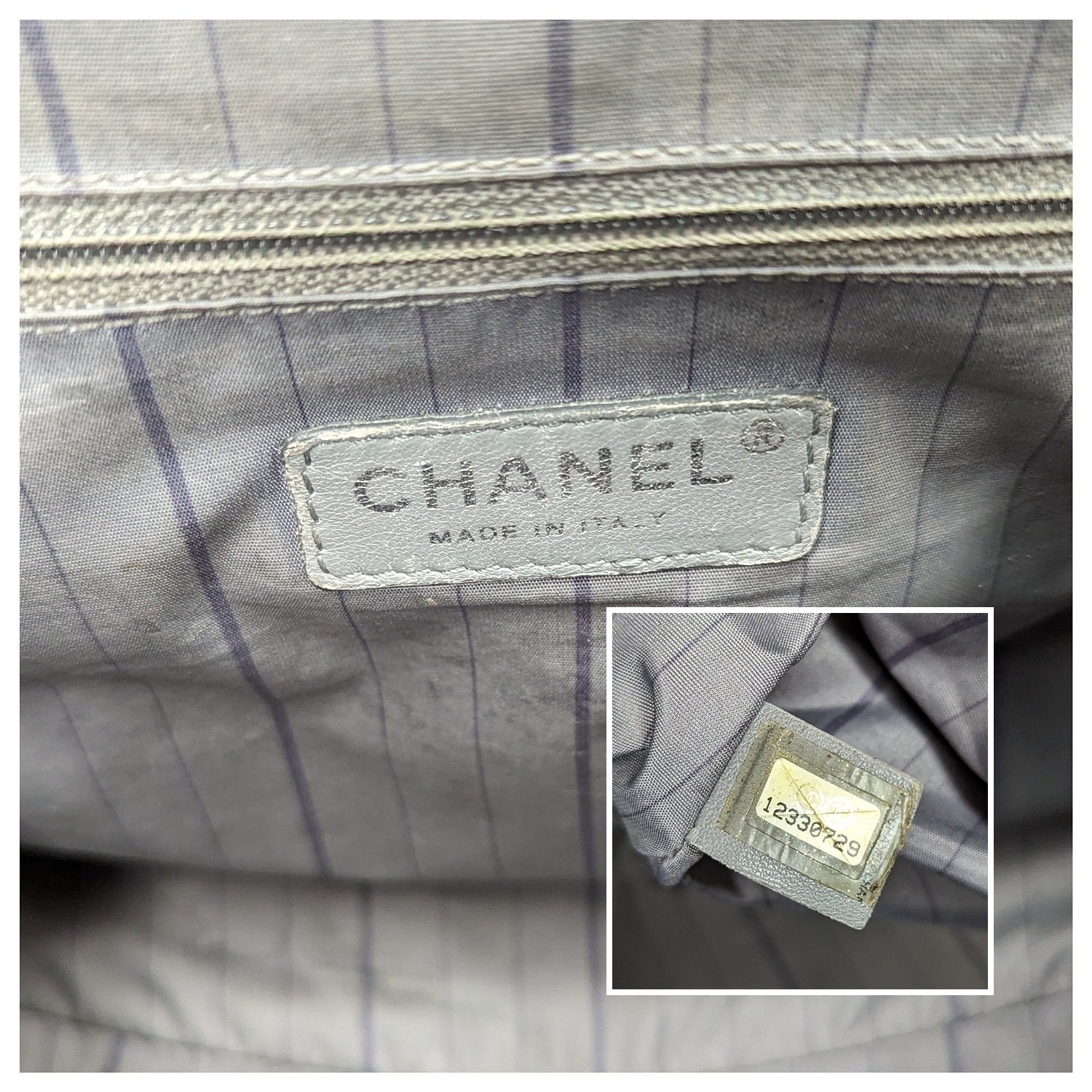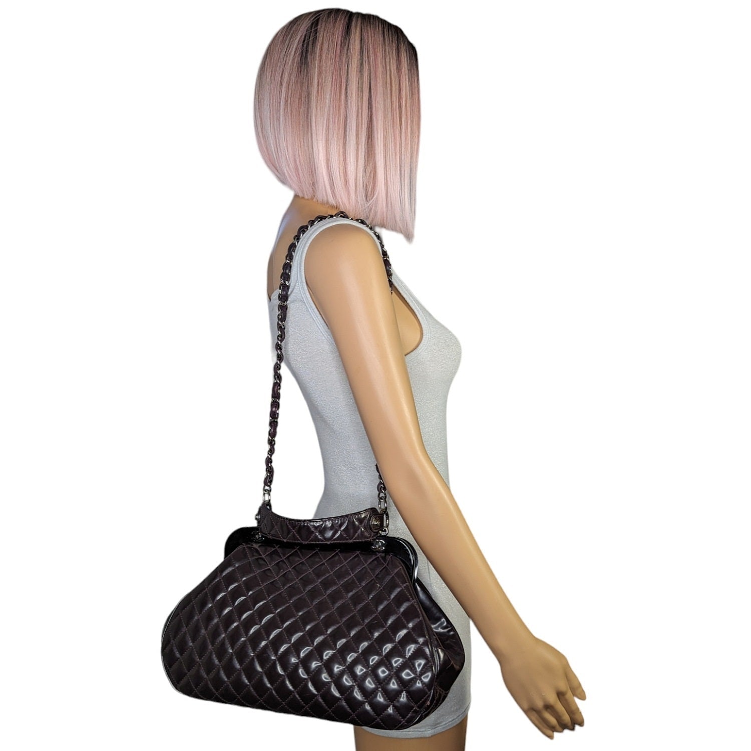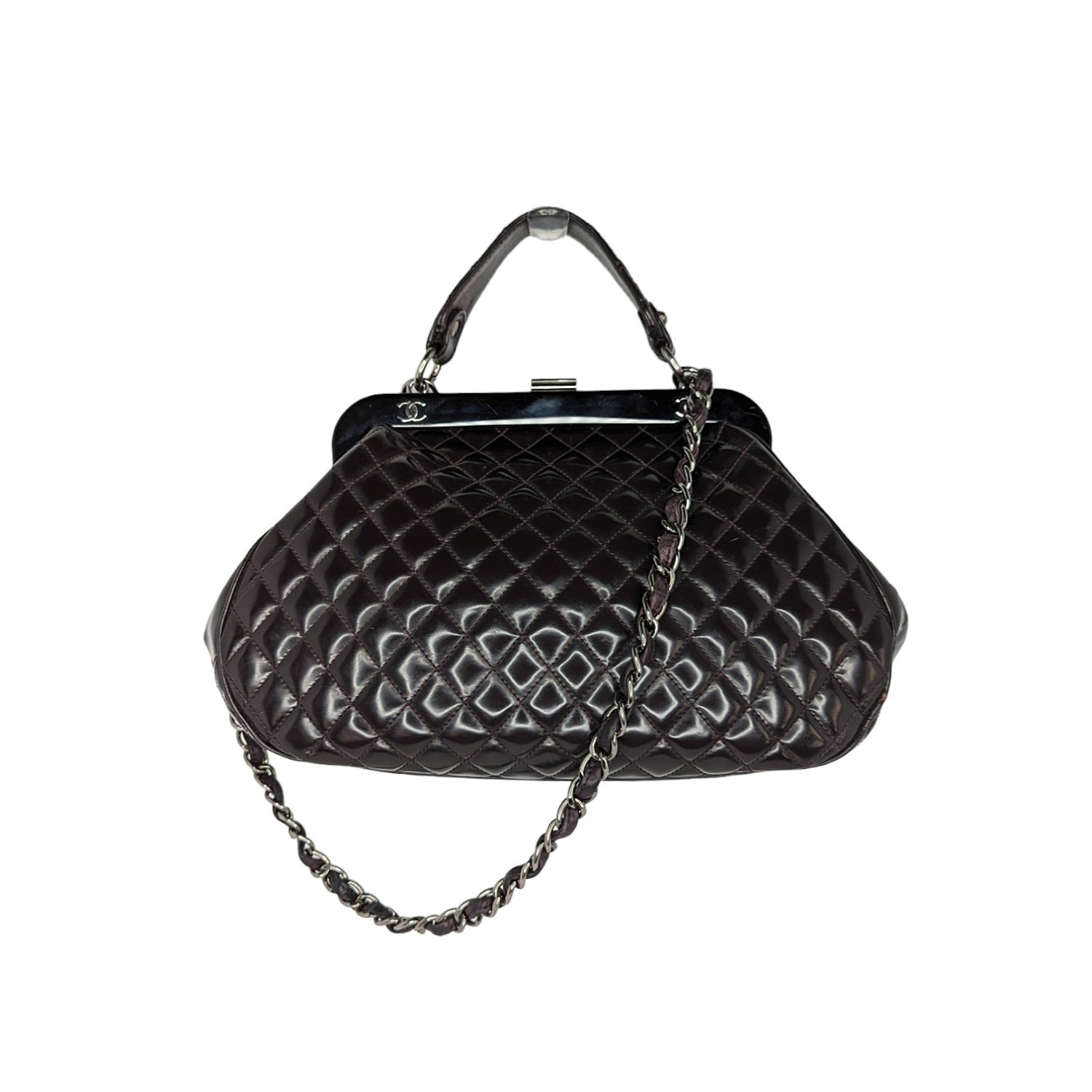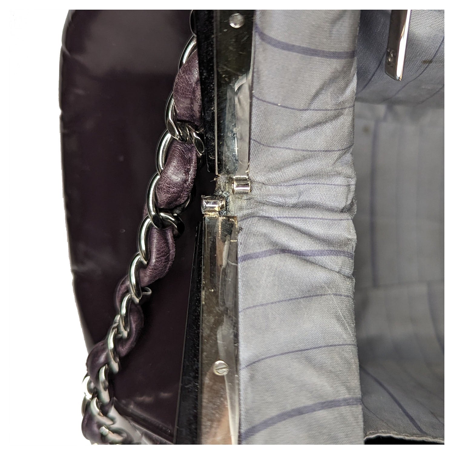 Eggplant quilted patent leather Chanel bag Mademoiselle Frame satchel with silver-tone hardware, single flat top handle, leather and chain-link shoulder strap, resin top frame featuring CC logo emblems, gray striped woven lining, dual pockets at interior walls; one with zip closure and push-lock closure at top frame.