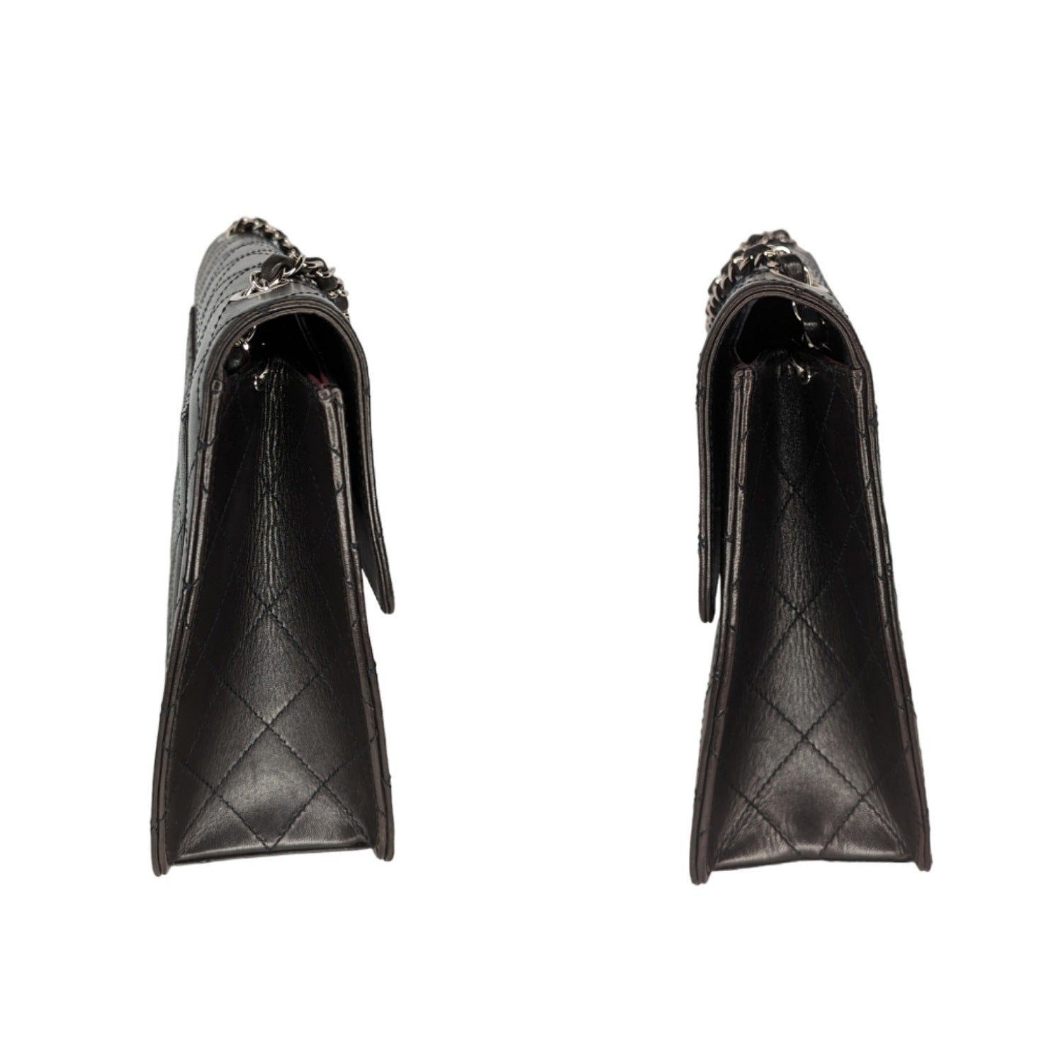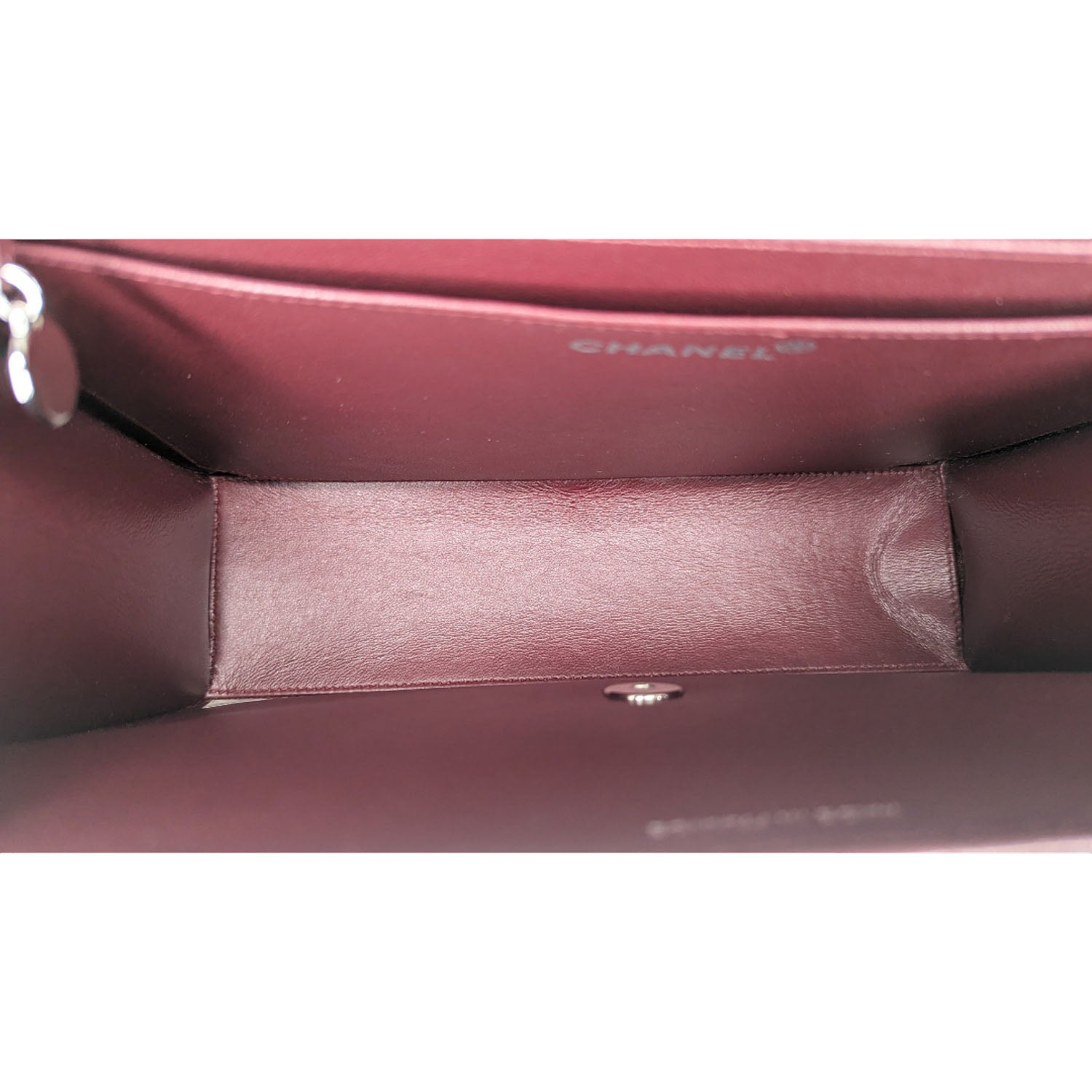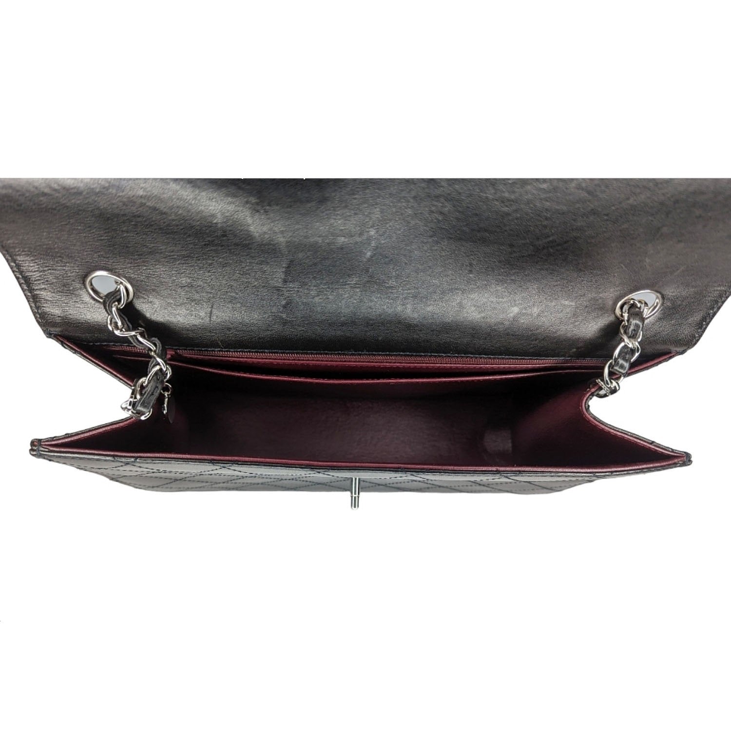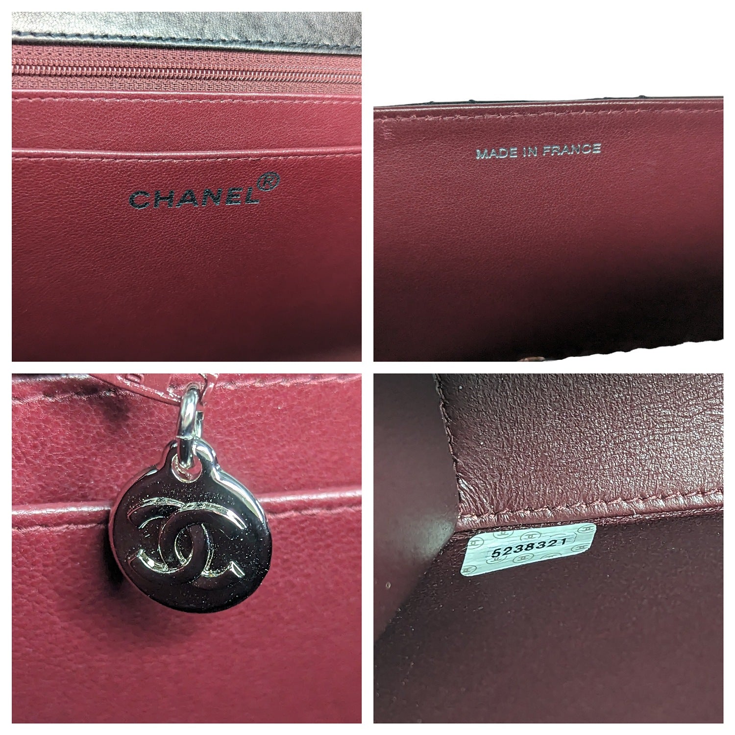 This classic bag is finely composed of luxurious diamond quilted lambskin leather. The bag features a silver chain link leather threaded shoulder strap and a silver Chanel bag CC turn lock. This opens the front flap to a leather interior with a zipper and patch pockets. Made in France.