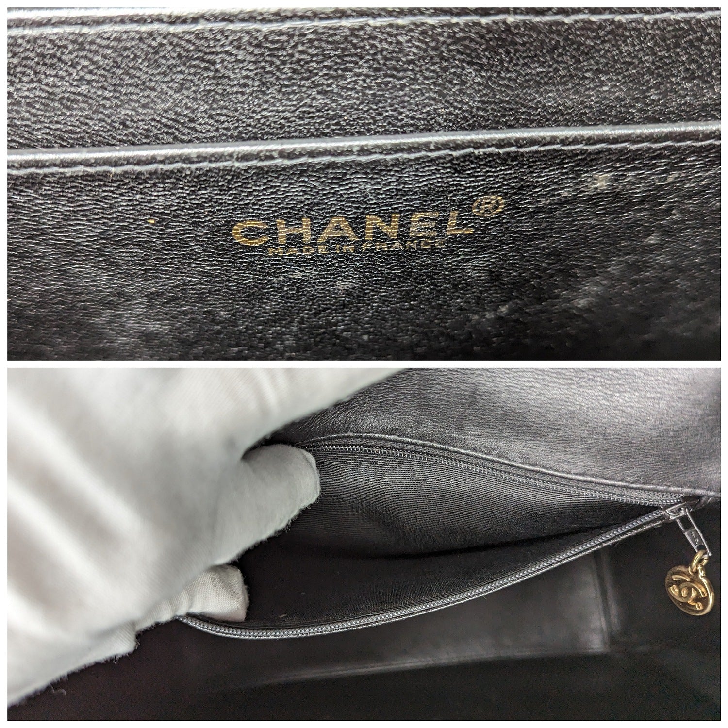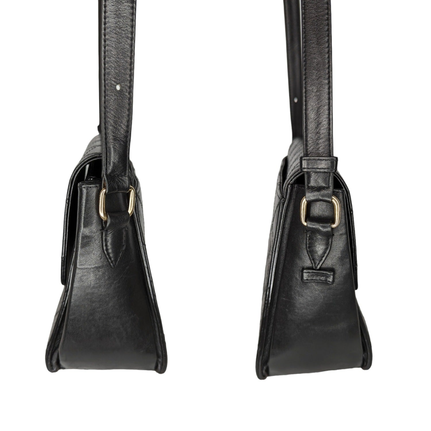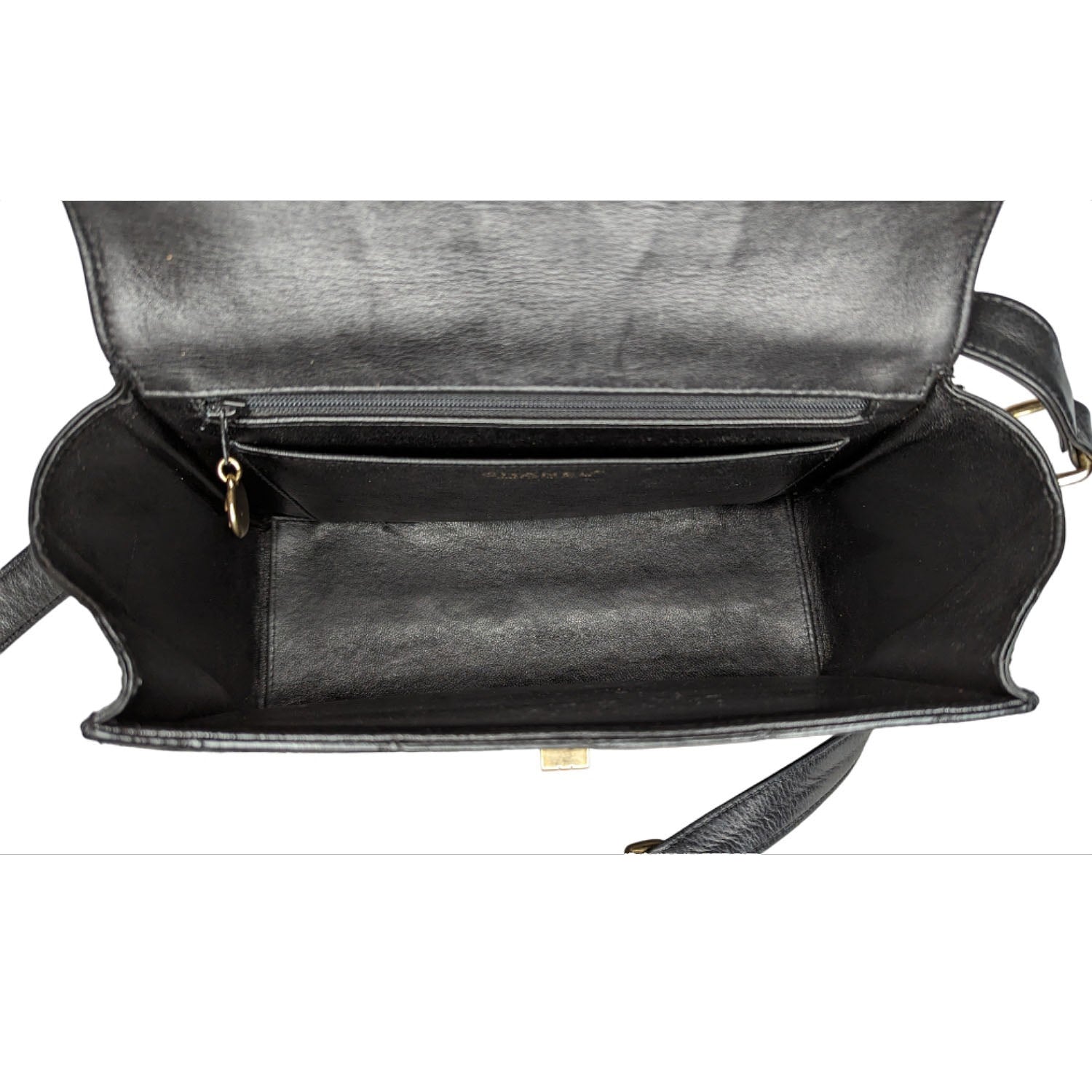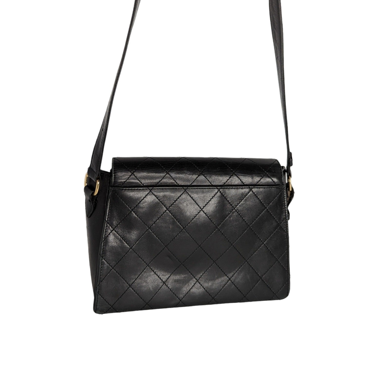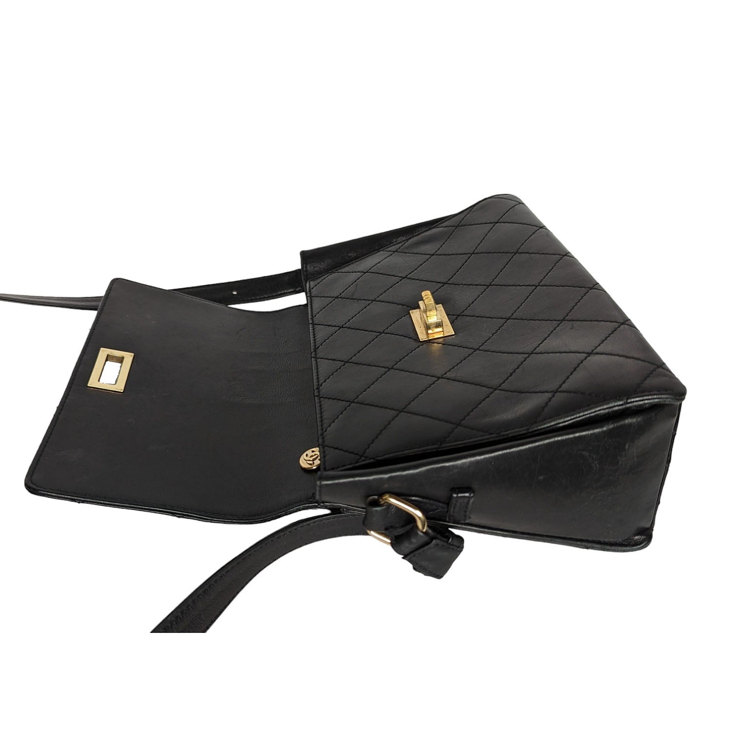 This stylish messenger bag is crafted of diamond quilted lambskin leather in black. The bag features an adjustable leather shoulder strap. The front flap has a gold plated Mademoiselle turn-lock and opens to a black leather interior with zipper and patch pockets.