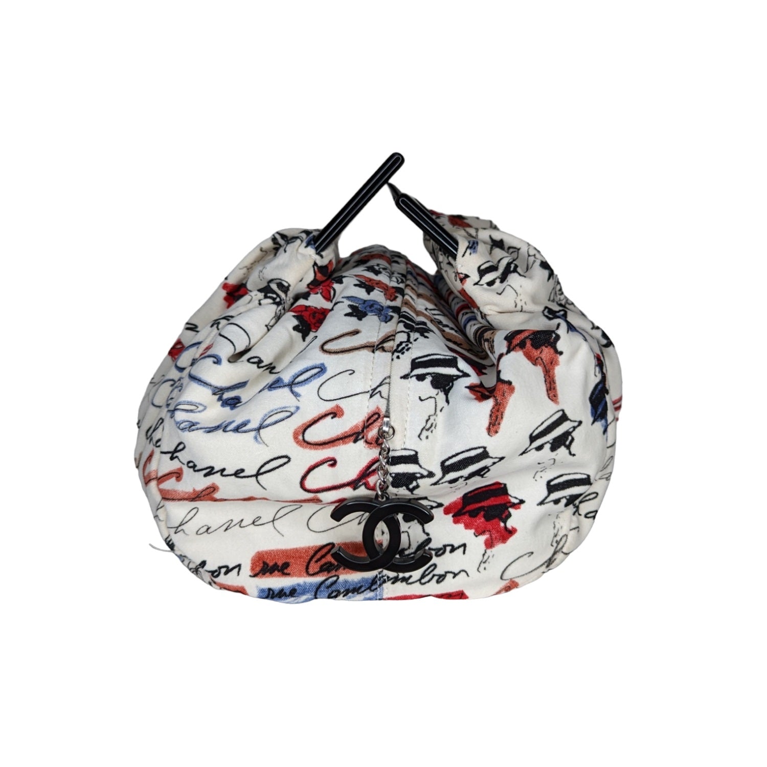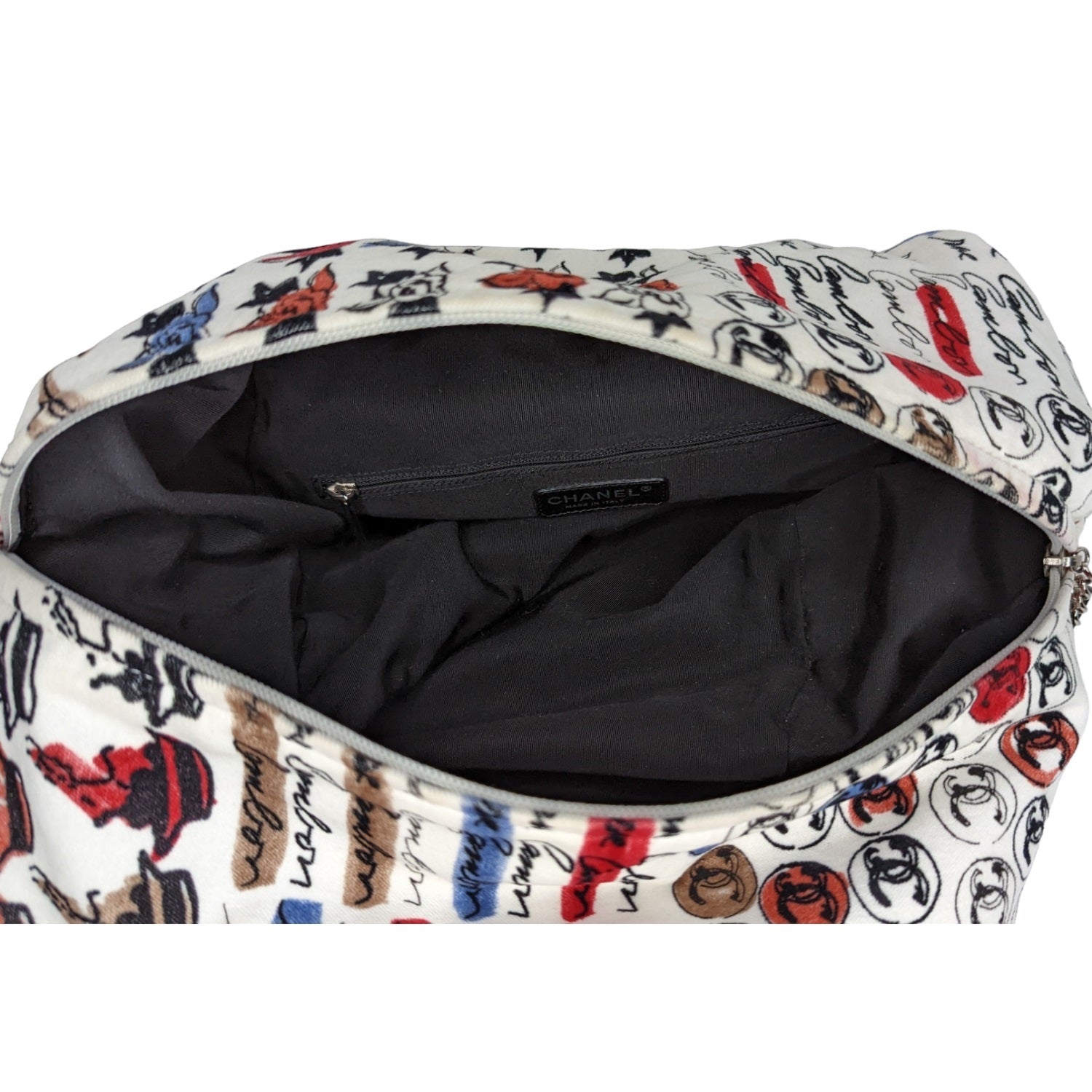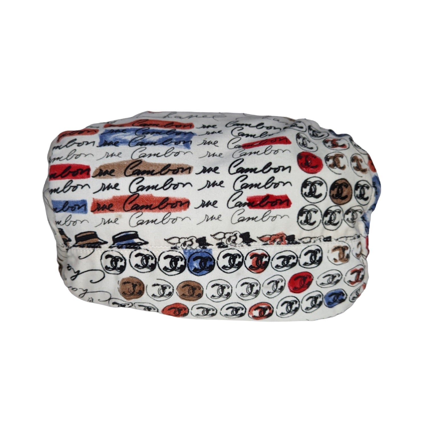 This stunning top handle bag is crafted of off-white velvet with multicolor Camellia Accent Flower Print. The handbag features black acrylic top handles and a black CC medallion zipper pull. The top zipper opens to black fabric interior with a zipper pocket.