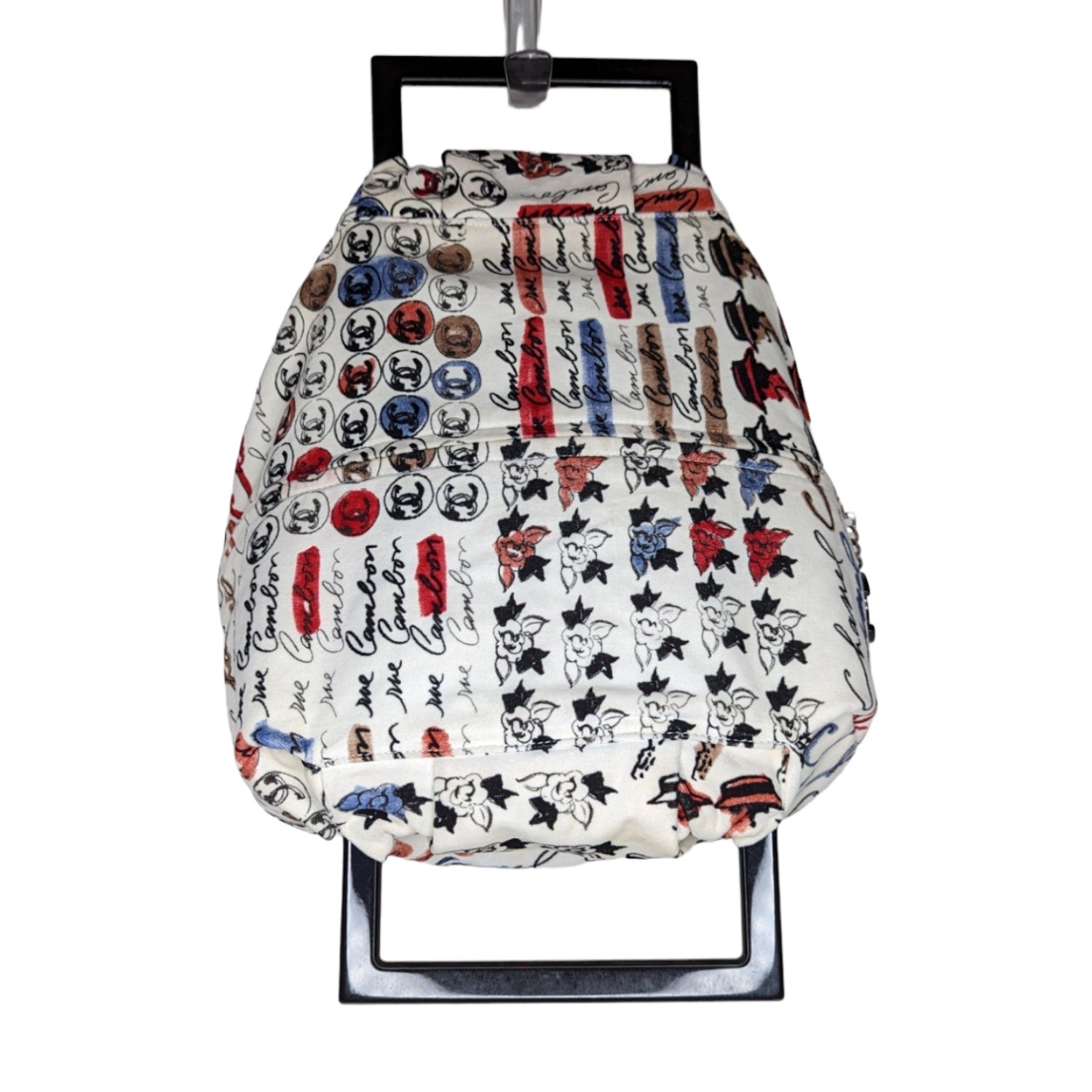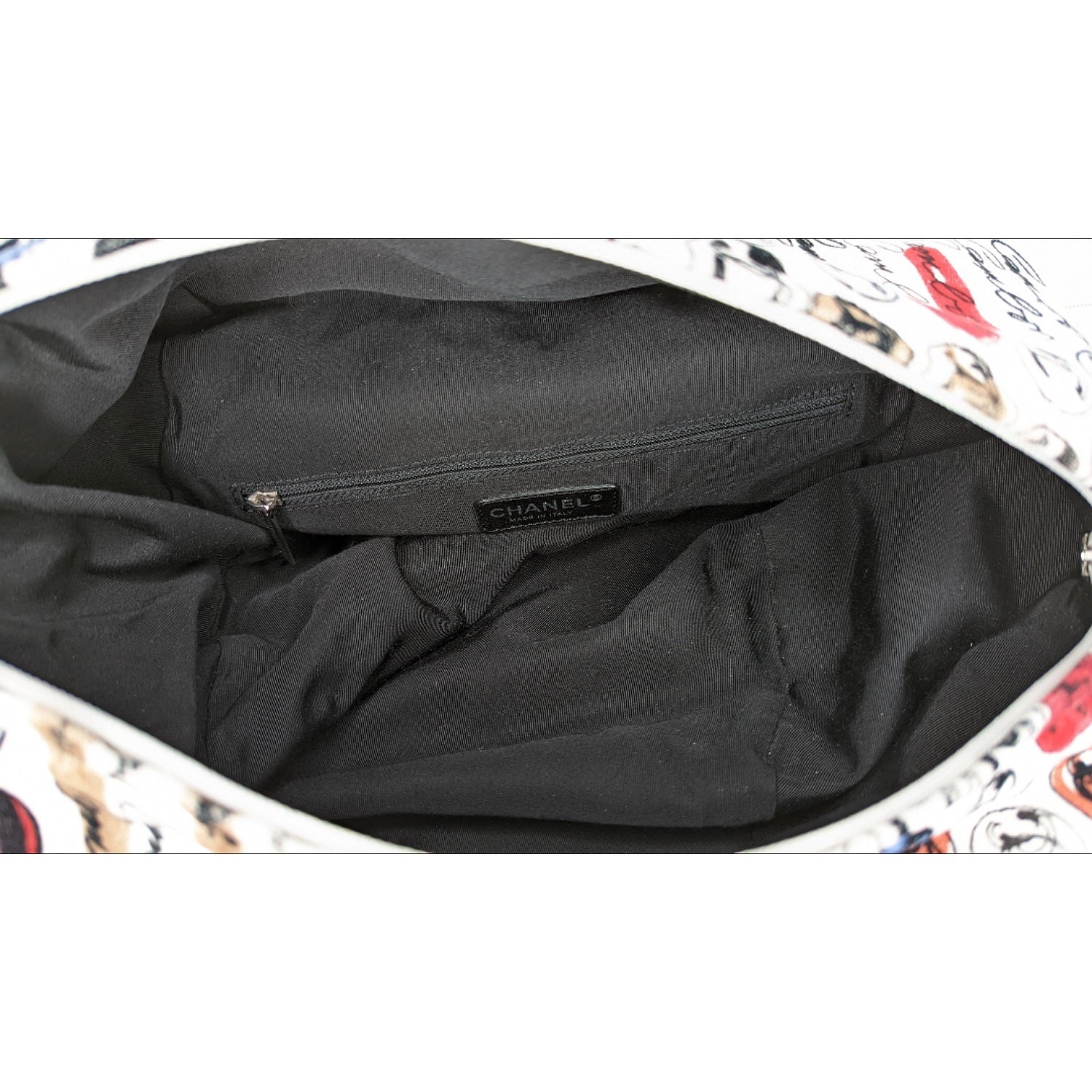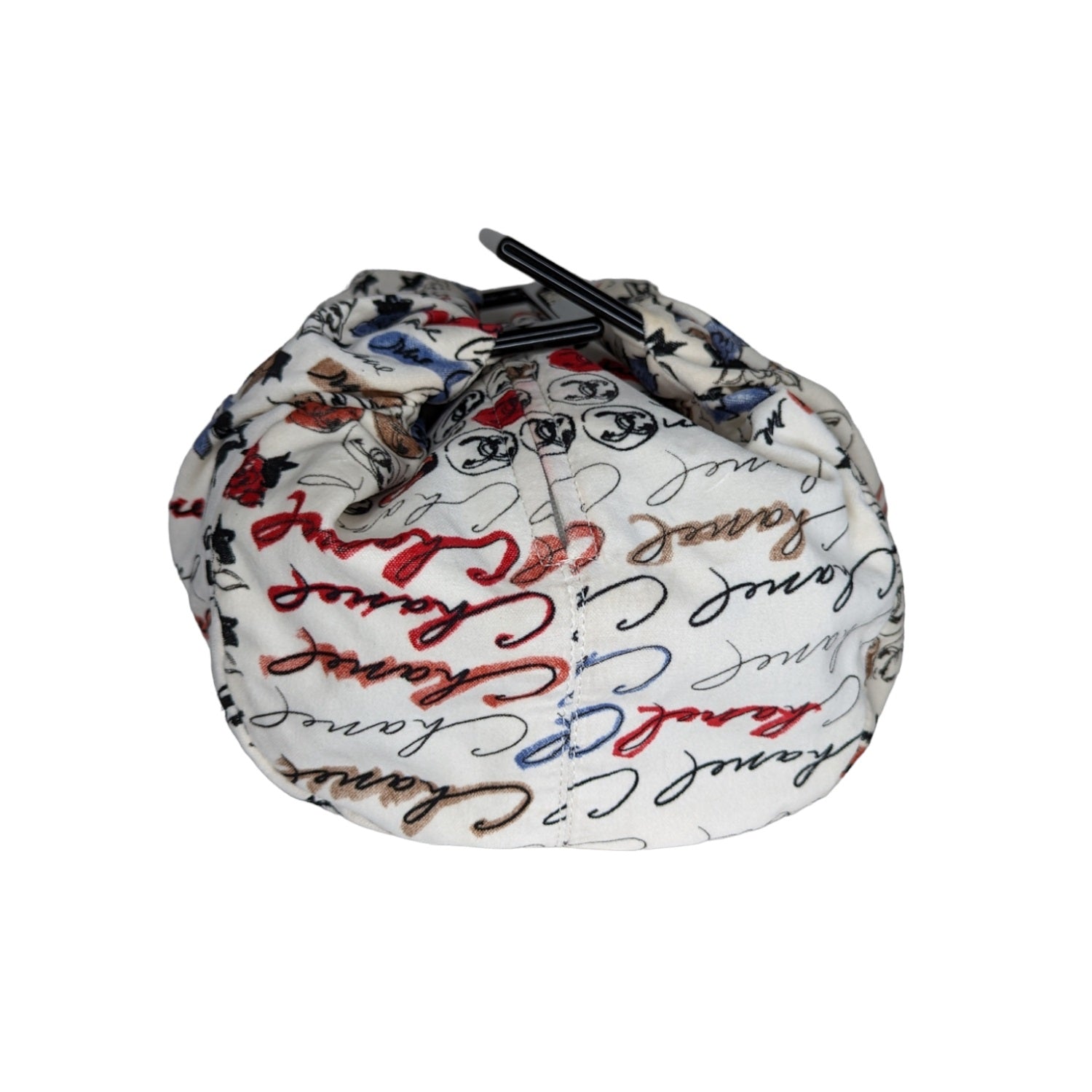 This stunning top handle bag is crafted of off-white velvet with multicolor Camellia Accent Flower Print. The handbag features black acrylic top handles and a black CC medallion zipper pull. The top zipper opens to black fabric interior with a zipper pocket.