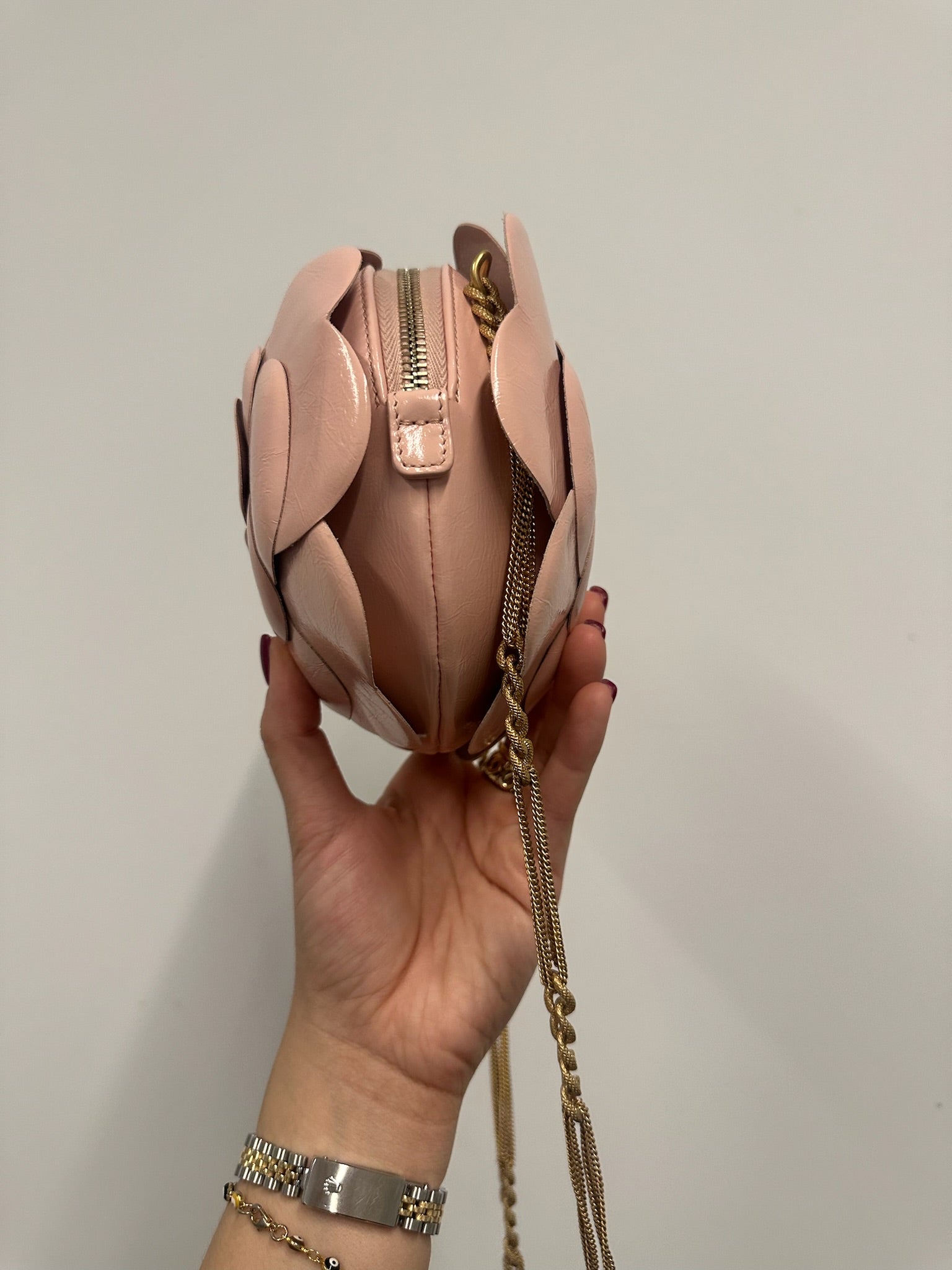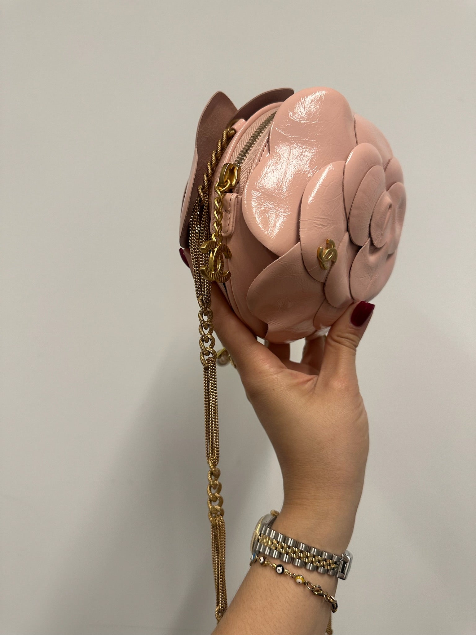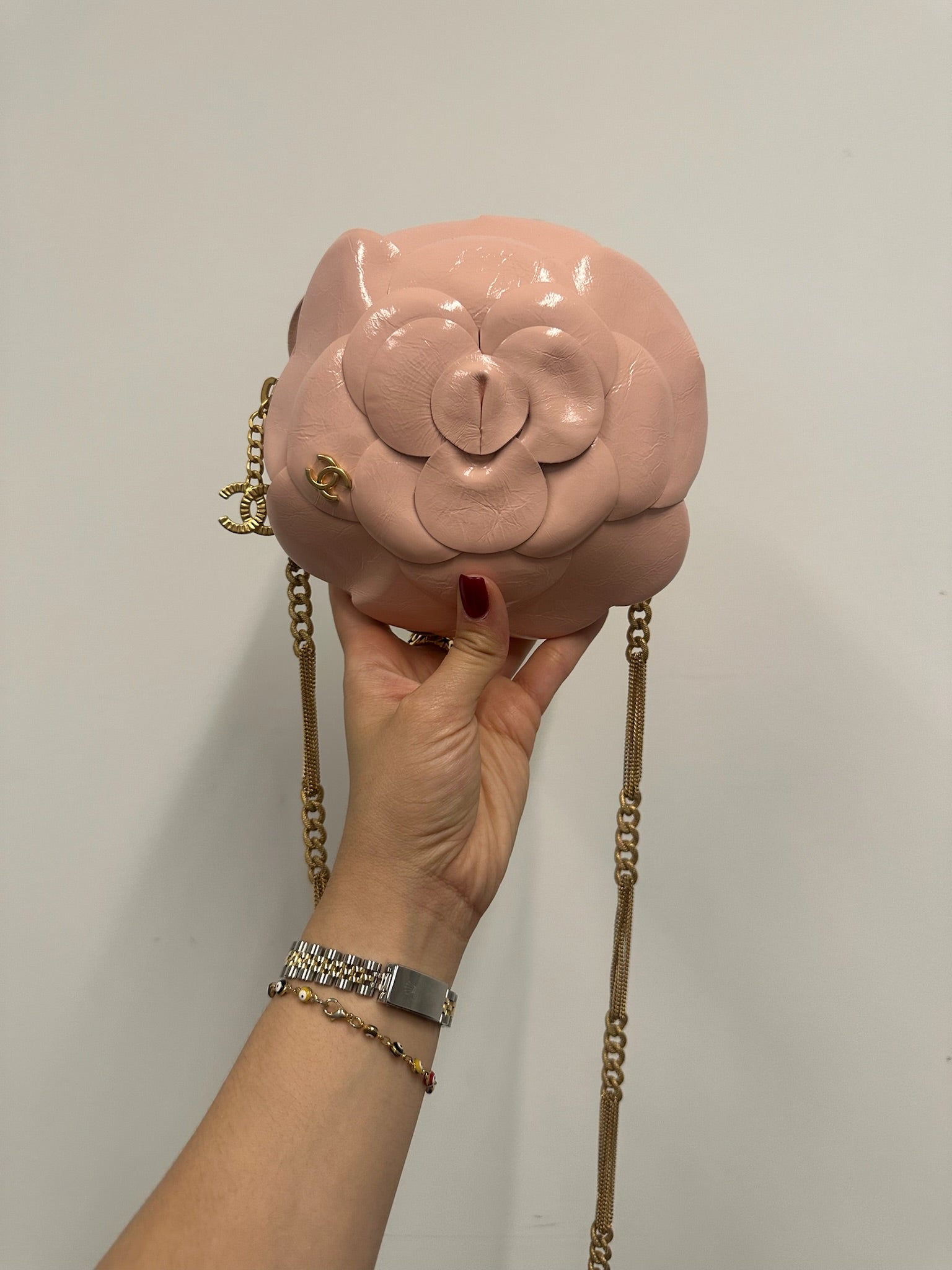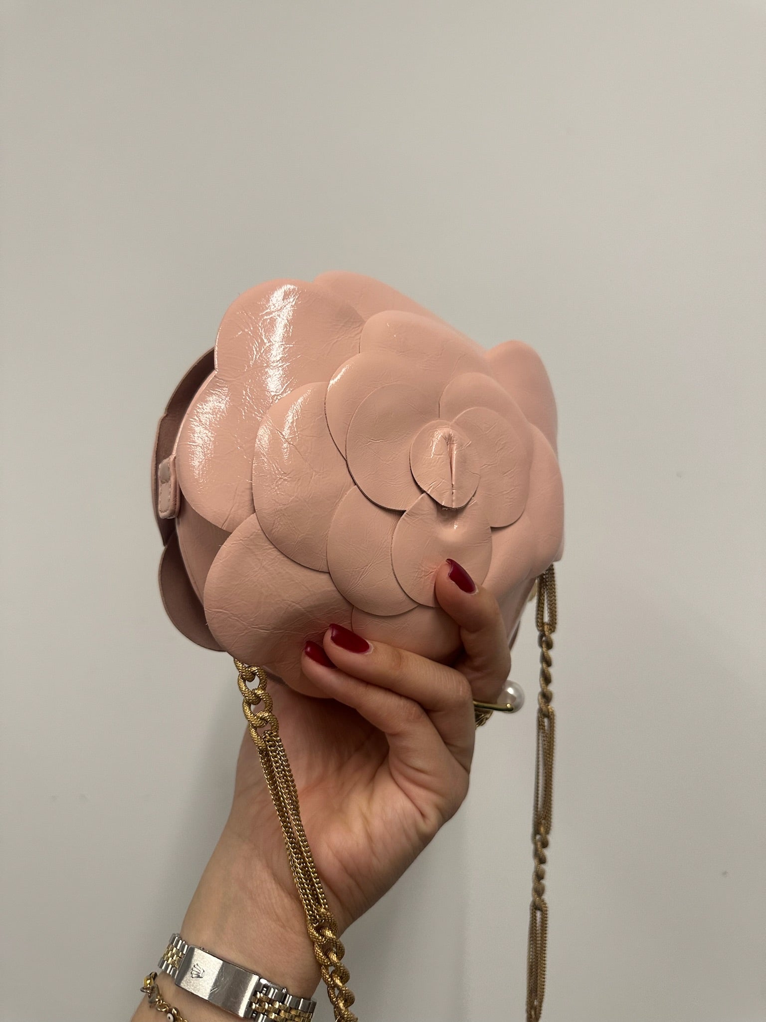 Add elegance and sophistication to your evening look with the CHANEL Camellia Evening Flower Crossbody Bag. The golden toned hardware adds a touch of glamour while keeping your essentials secure. Perfect for any special occasion, this bag is a must-have for any fashion-forward individual. Indulge in luxury with this exquisite accessory.