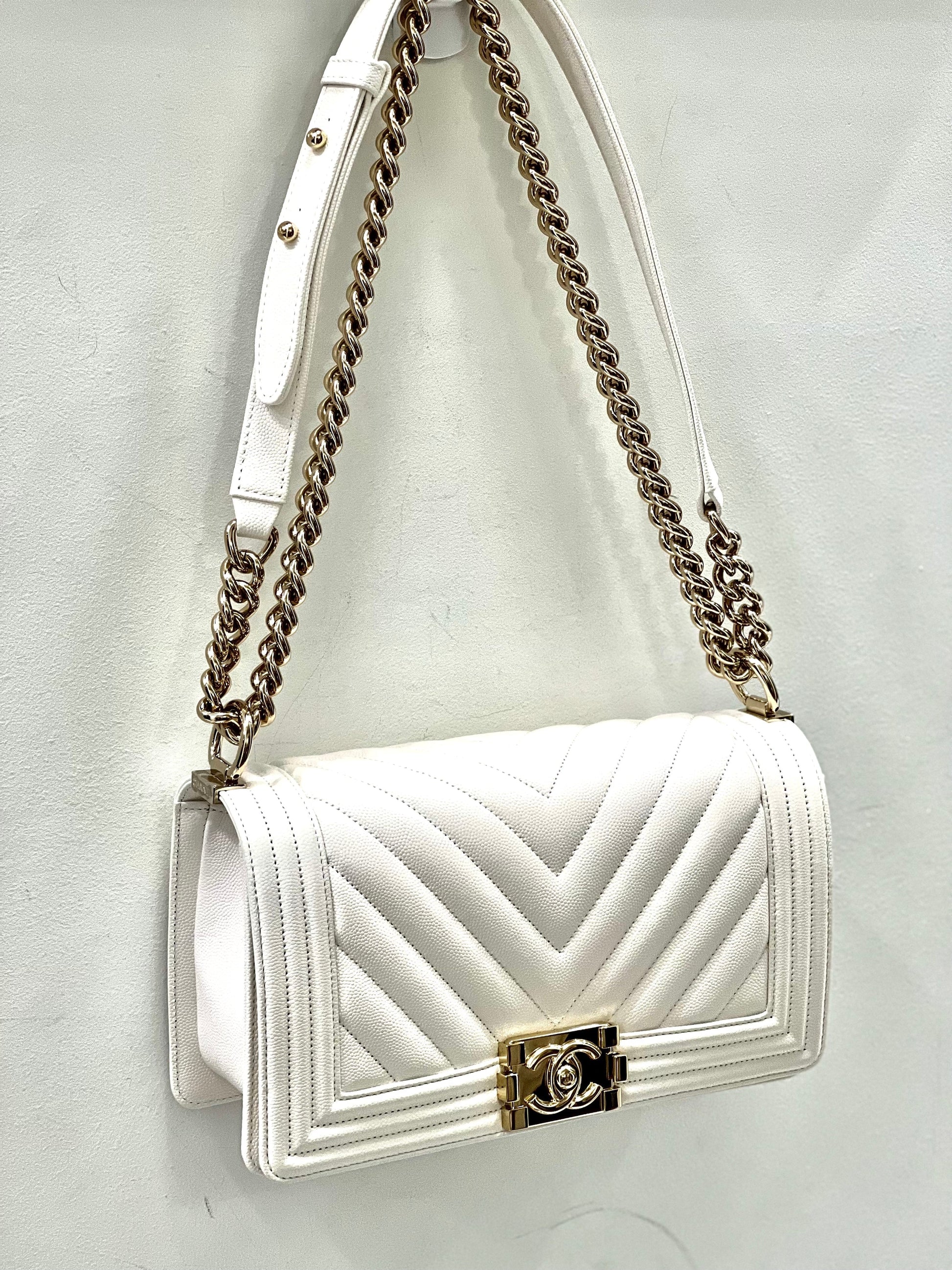This Classic shoulder bag is crafted of luxurious Chevron-quilted leather in off-white with a border of linear quilted leather. The bag features a gold chain-link shoulder strap with a shoulder pad and a unique front squared Chanel CC press lock.