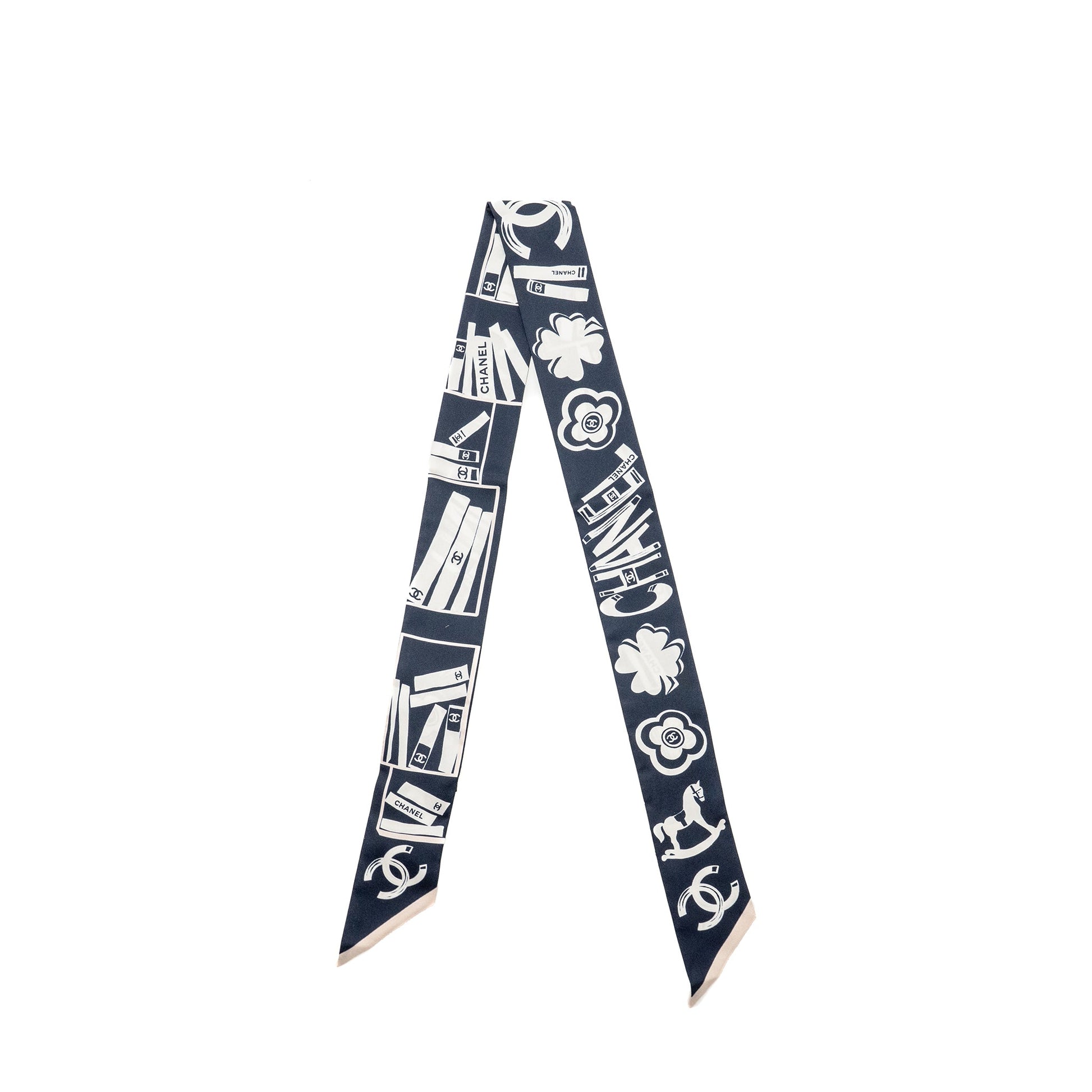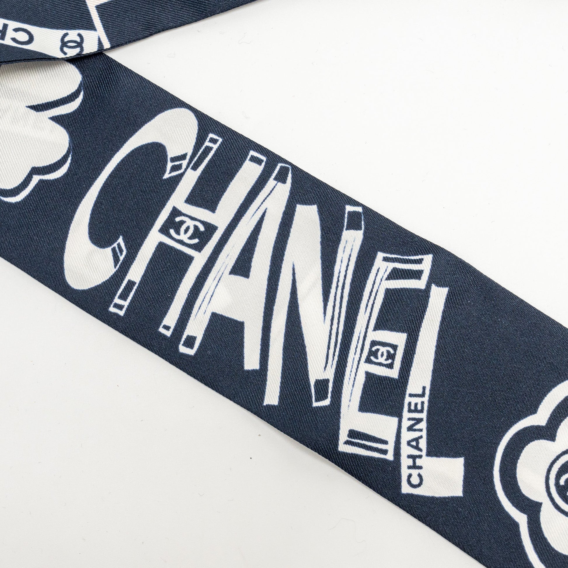 Chanel CC Logo/Letter Printed Twilly Silk Navy/White
