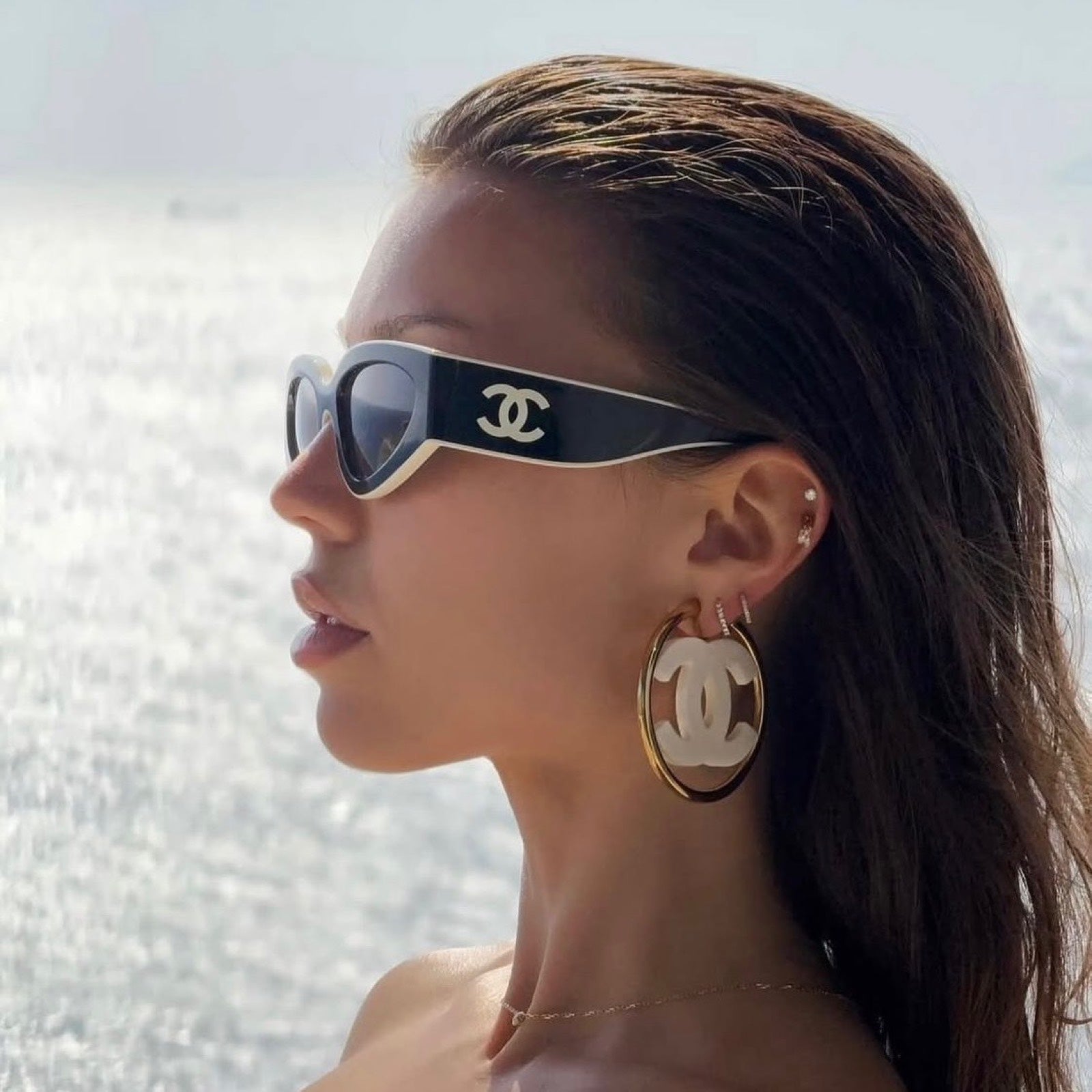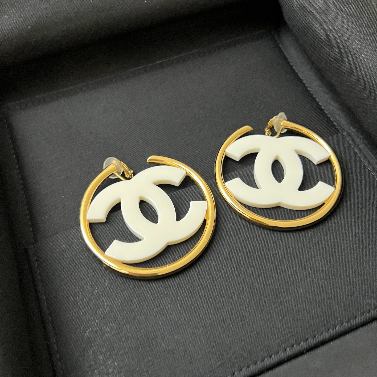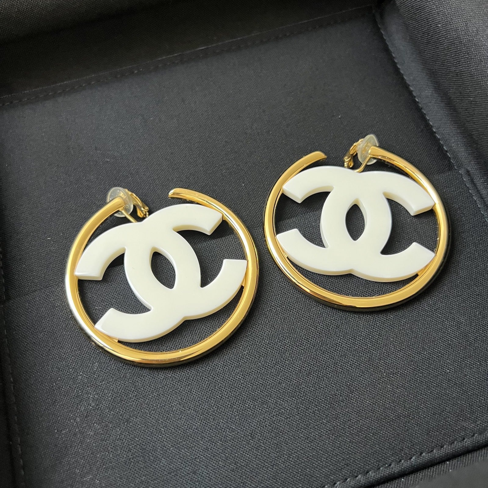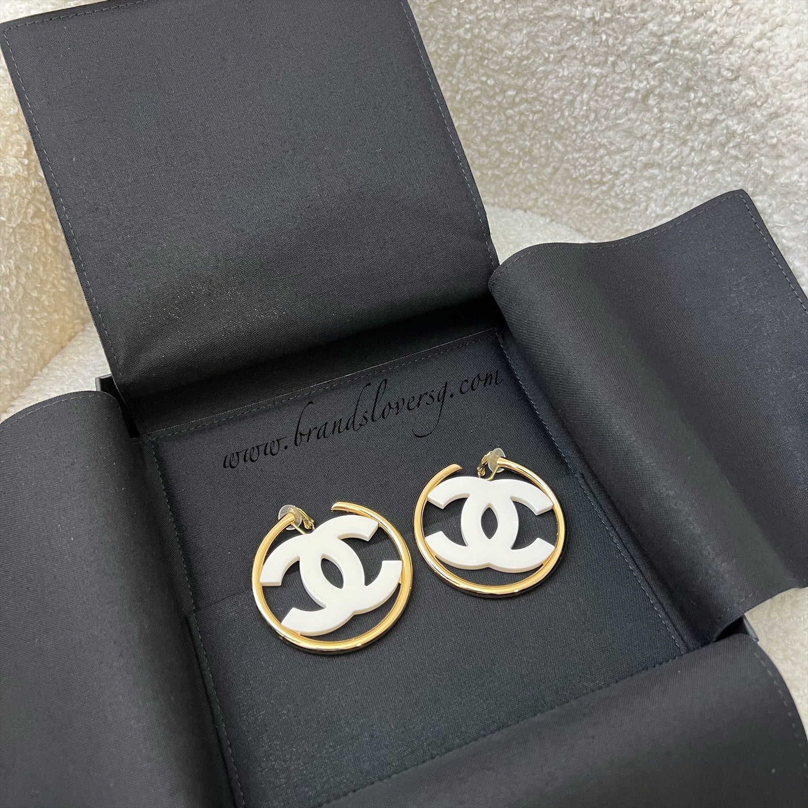 Chanel 24S Large CC Logo Hoop Clip-on Earrings with White Enamel in GHW