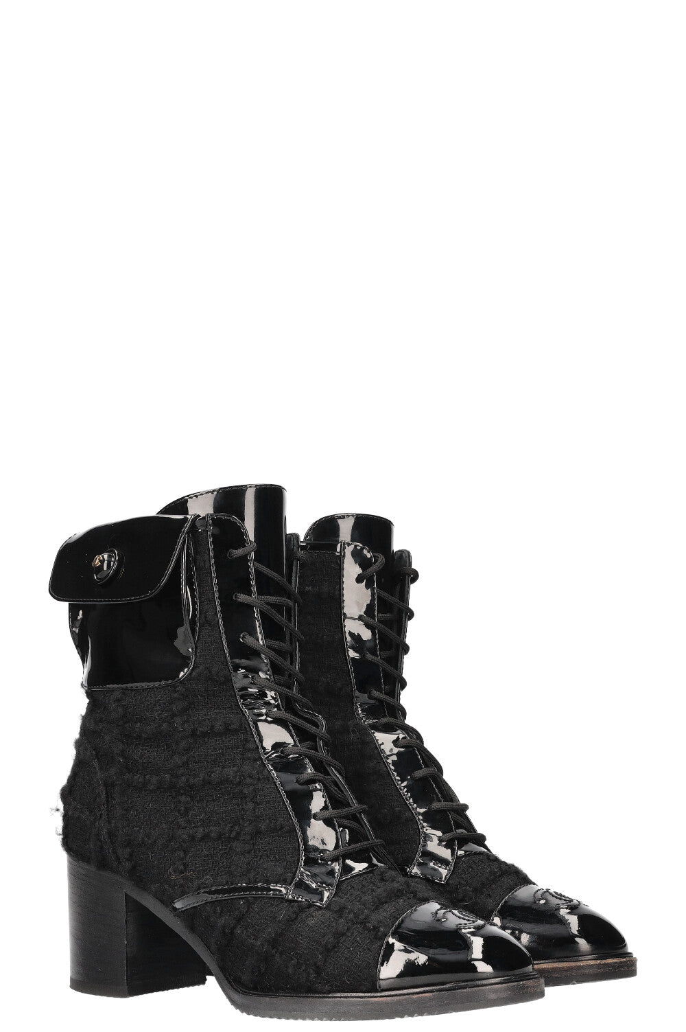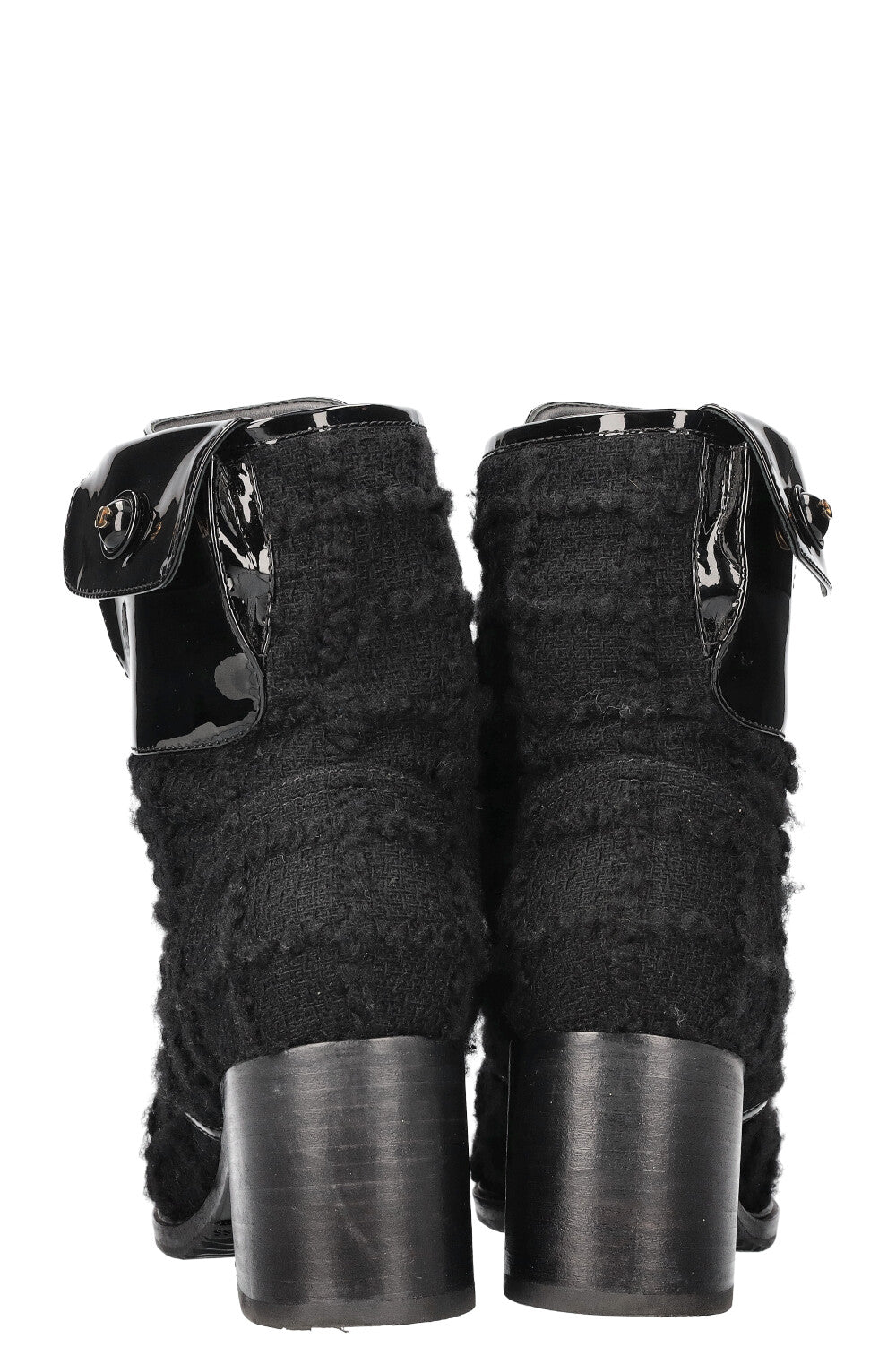 CHANEL Ankle Boots Tweed Patent Cap Black
