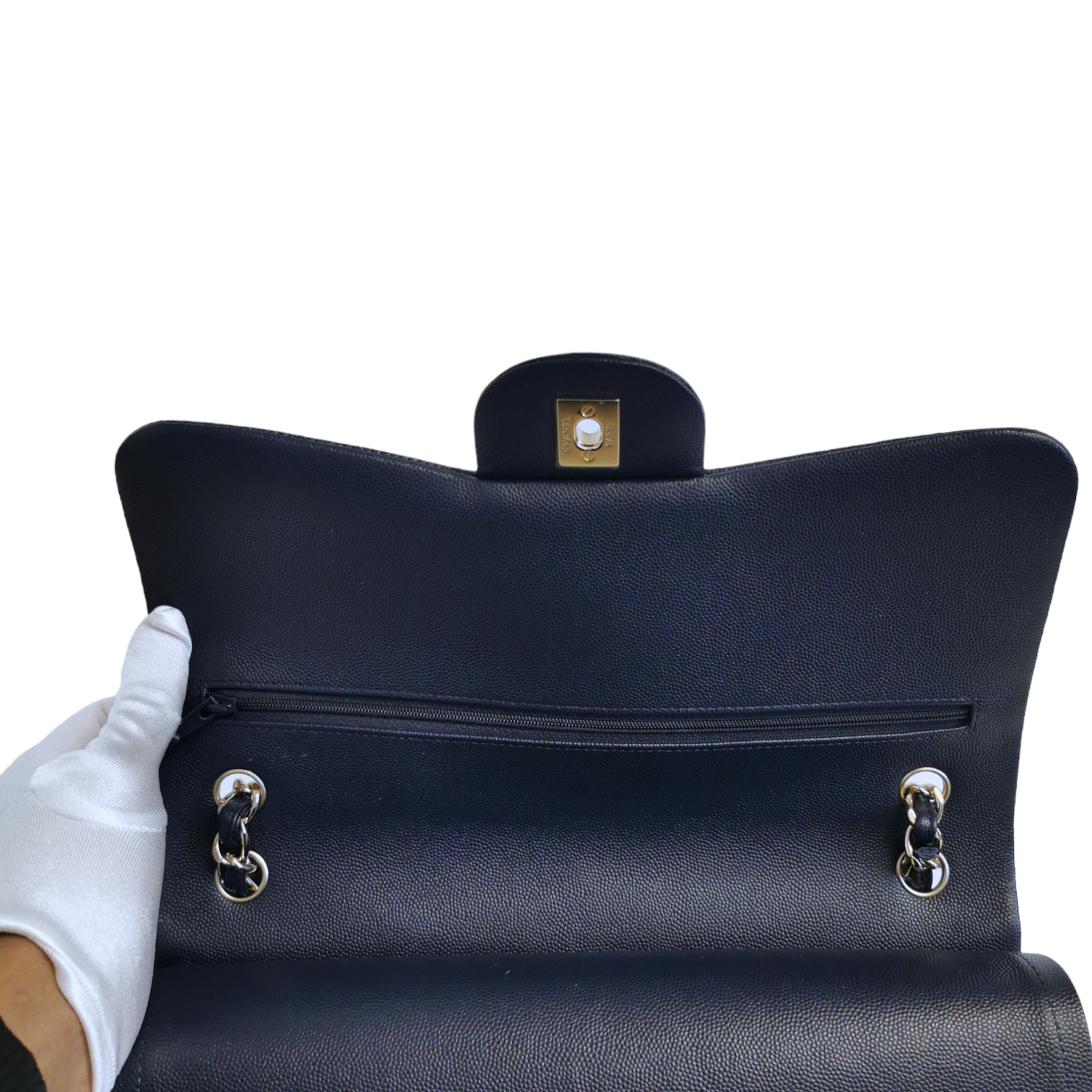 The Chanel Classic is arguably one of the most coveted bags in the world. With its elegant and timeless design, whose origins can be traced back to the 2.55 model from 1955. The iconic CC Lock however, was created later through the magic of Karl Lagerfeld. The black Caviar leather is beautifully complemented by the golden sheen of the hardware. On the back of the Bag is conveniently equipped with an open compartment. The interior is appropriately lined with black lambskin and has an open slip pocket and a zippered compartment.