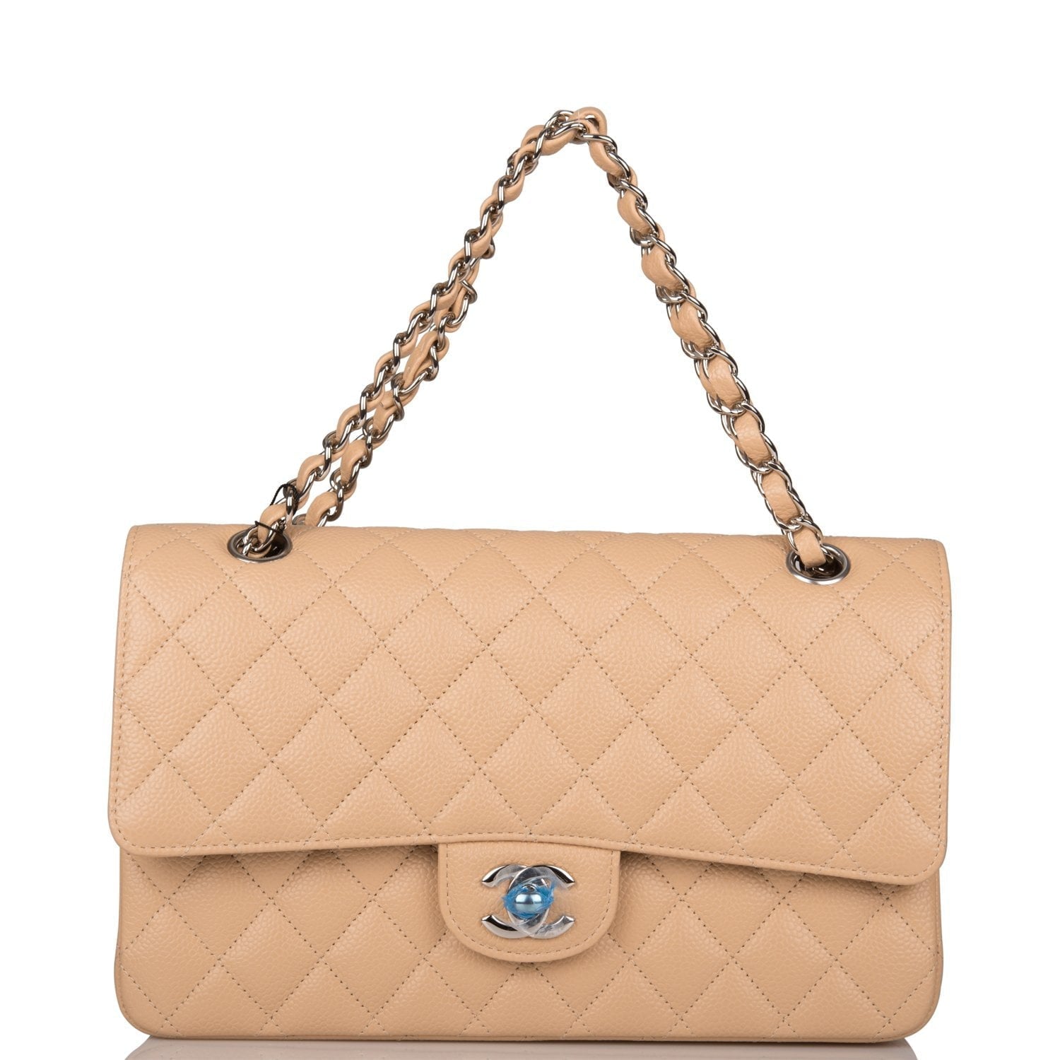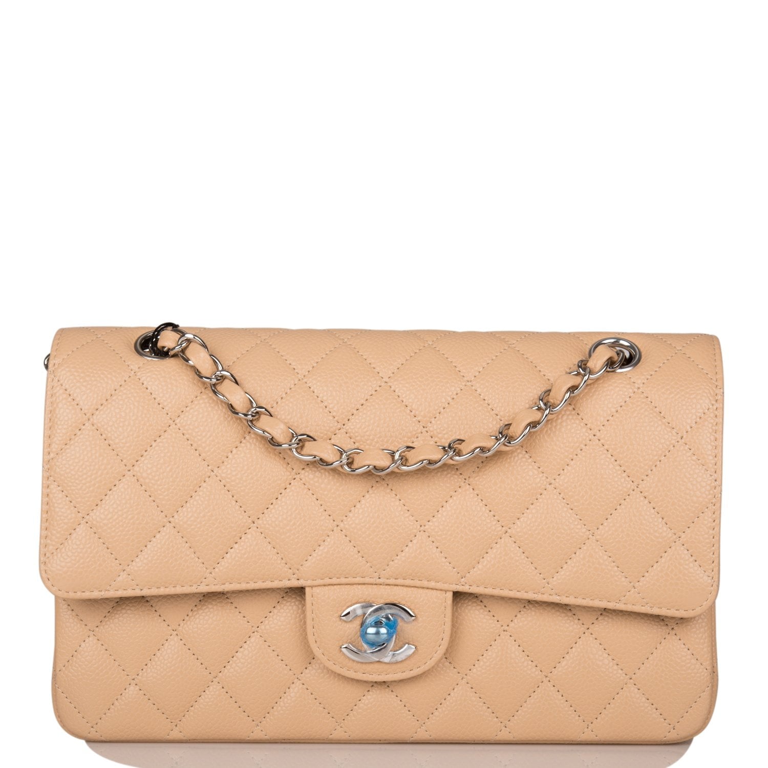 This Medium Classic Double Flap bag is in beige caviar leather with silver tone hardware and features a front flap with signature CC turnlock closure, half moon back pocket, and adjustable interwoven silver tone chain link and beige leather shoulder strap.