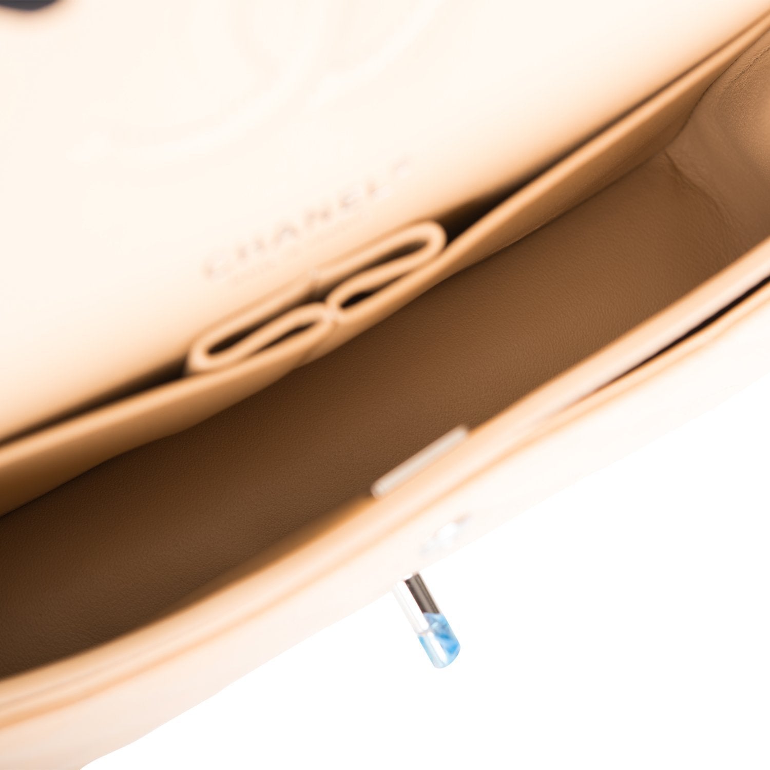 The interior is lined in beige leather with the 'love letter' zipper compartment underneath the first flap, an 'outer' slit pocket under the second flap, and an interior compartment with two open pockets separated by a 'lipstick' compartment.