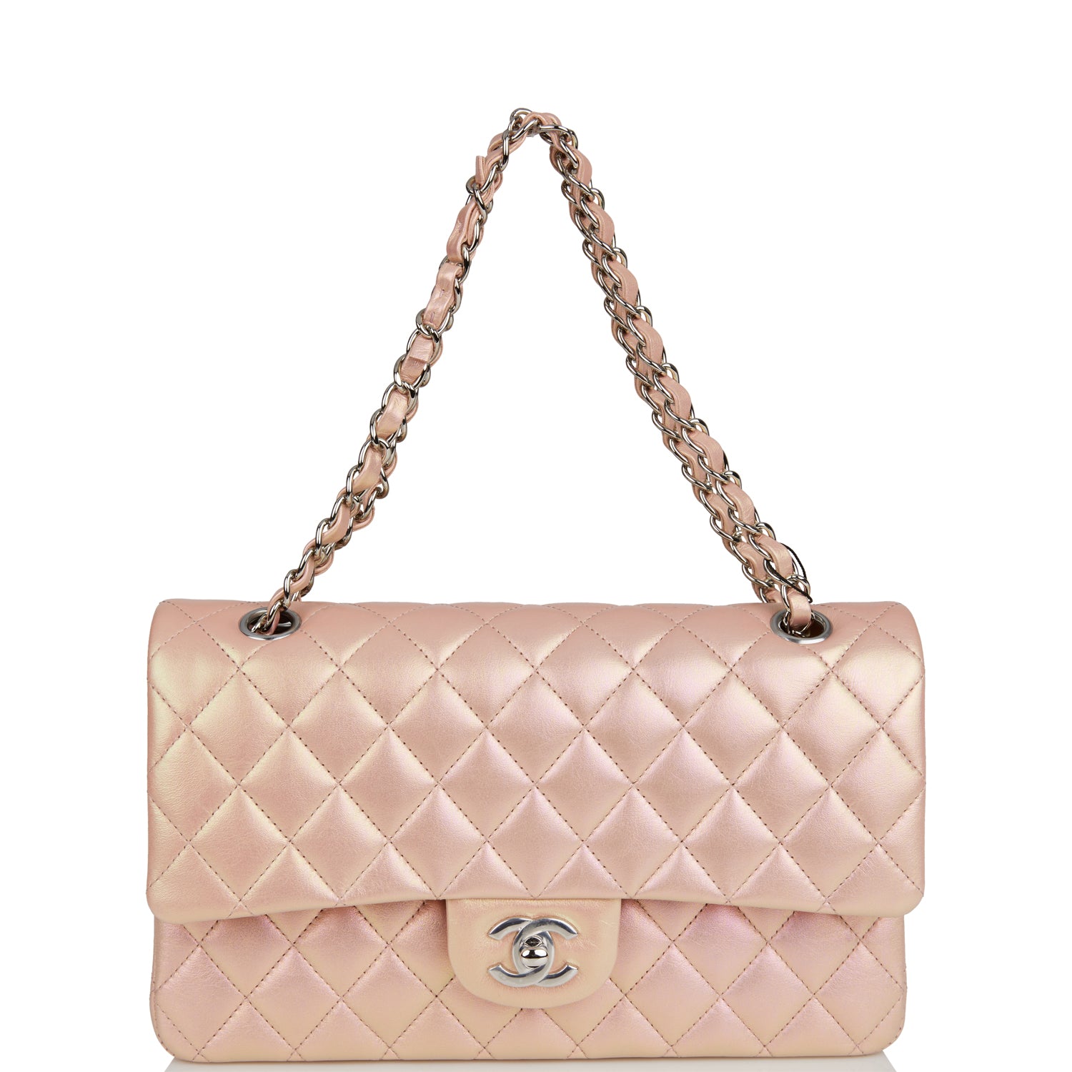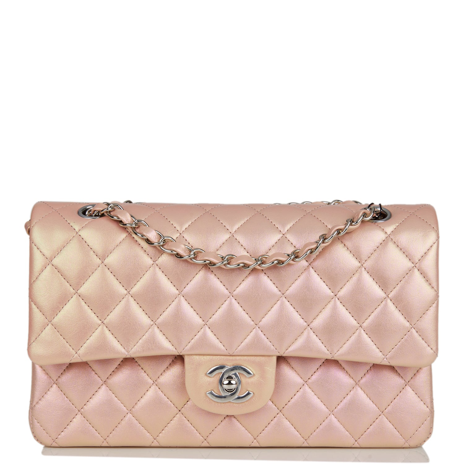 This Medium Classic Double Flap bag is in pink iridescent lambskin leather with silver tone hardware and features a front flap with signature CC turnlock closure, half moon back pocket, and adjustable interwoven silver tone chain link and pink leather shoulder strap.