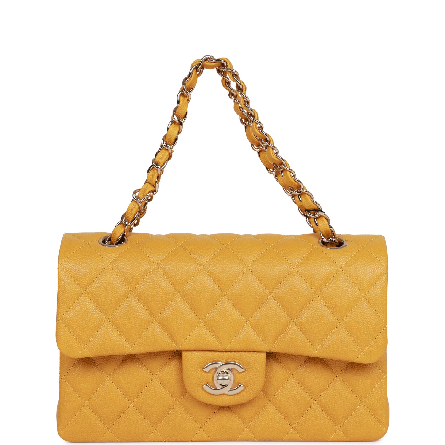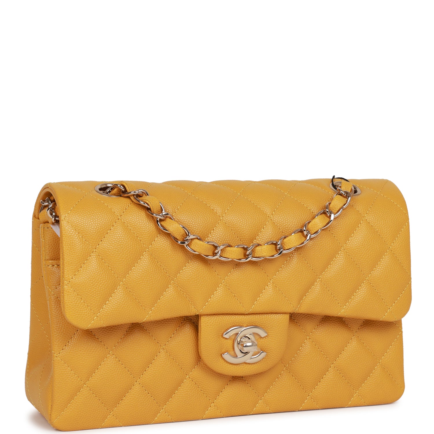 This Small Classic Double Flap bag is in yellow caviar leather with light gold tone hardware and features a front flap with signature CC turnlock closure, half moon back pocket, and adjustable interwoven light gold tone chain link and yellow leather shoulder strap.