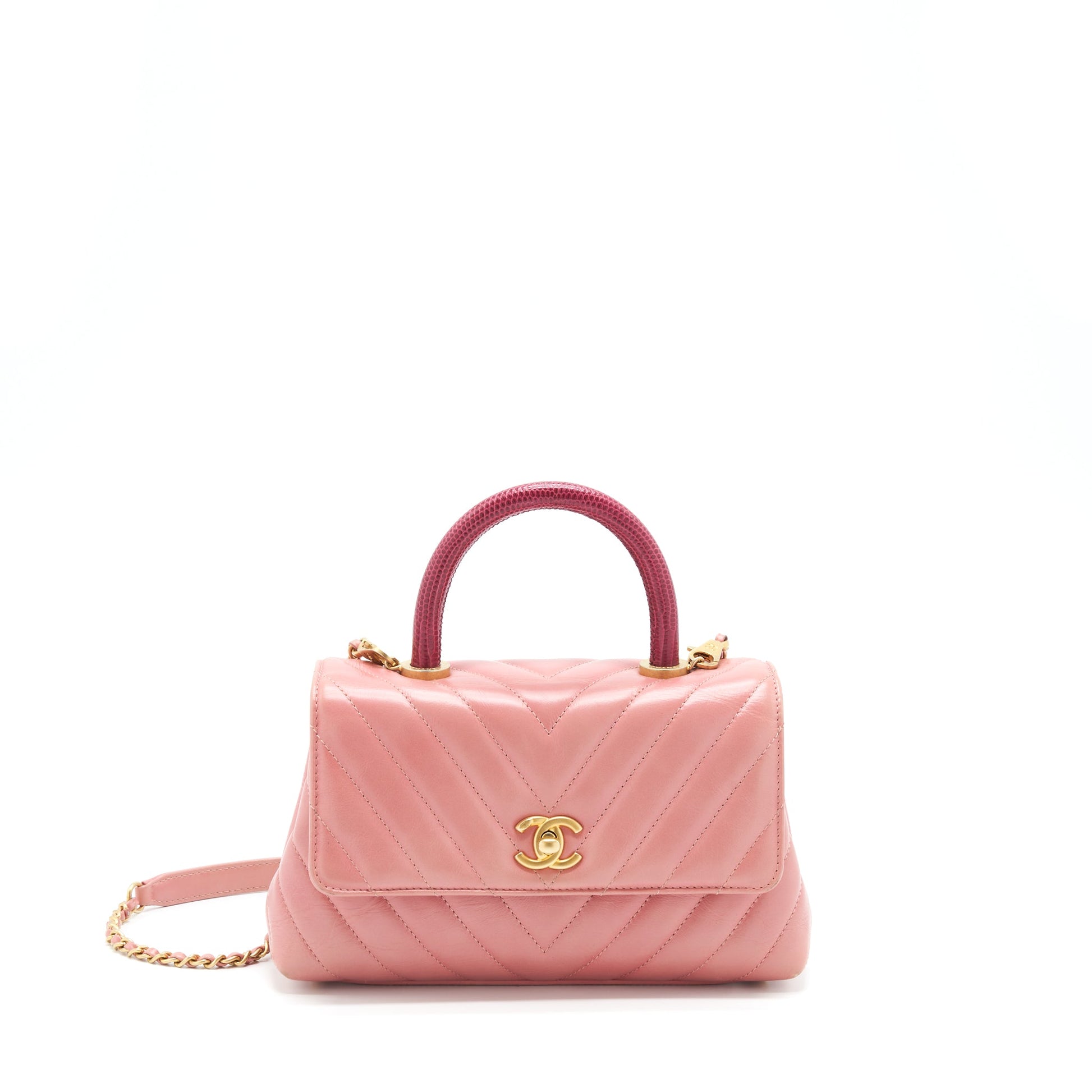 Chanel Small Coco Handle Chevron Calfskin With Lizard Handle Pink GHW
