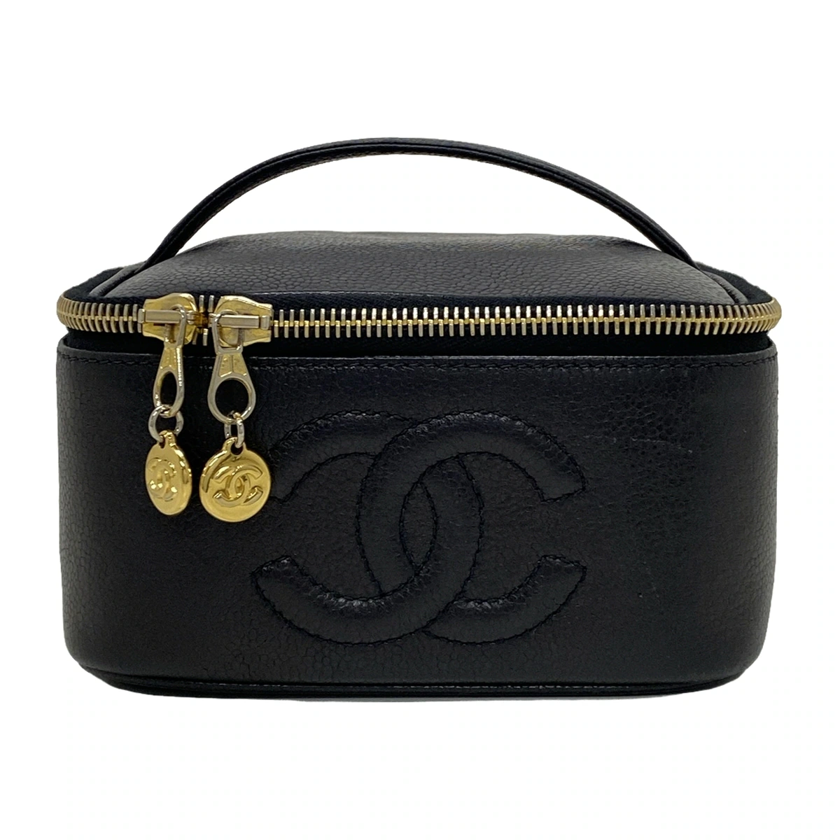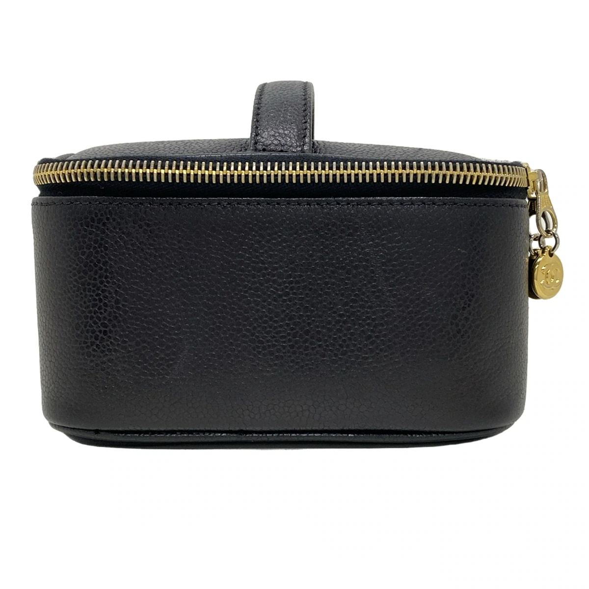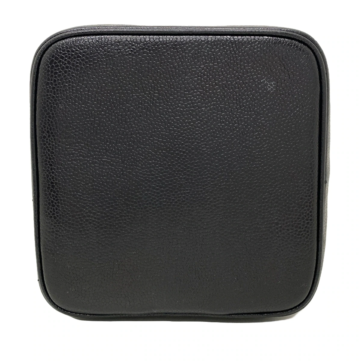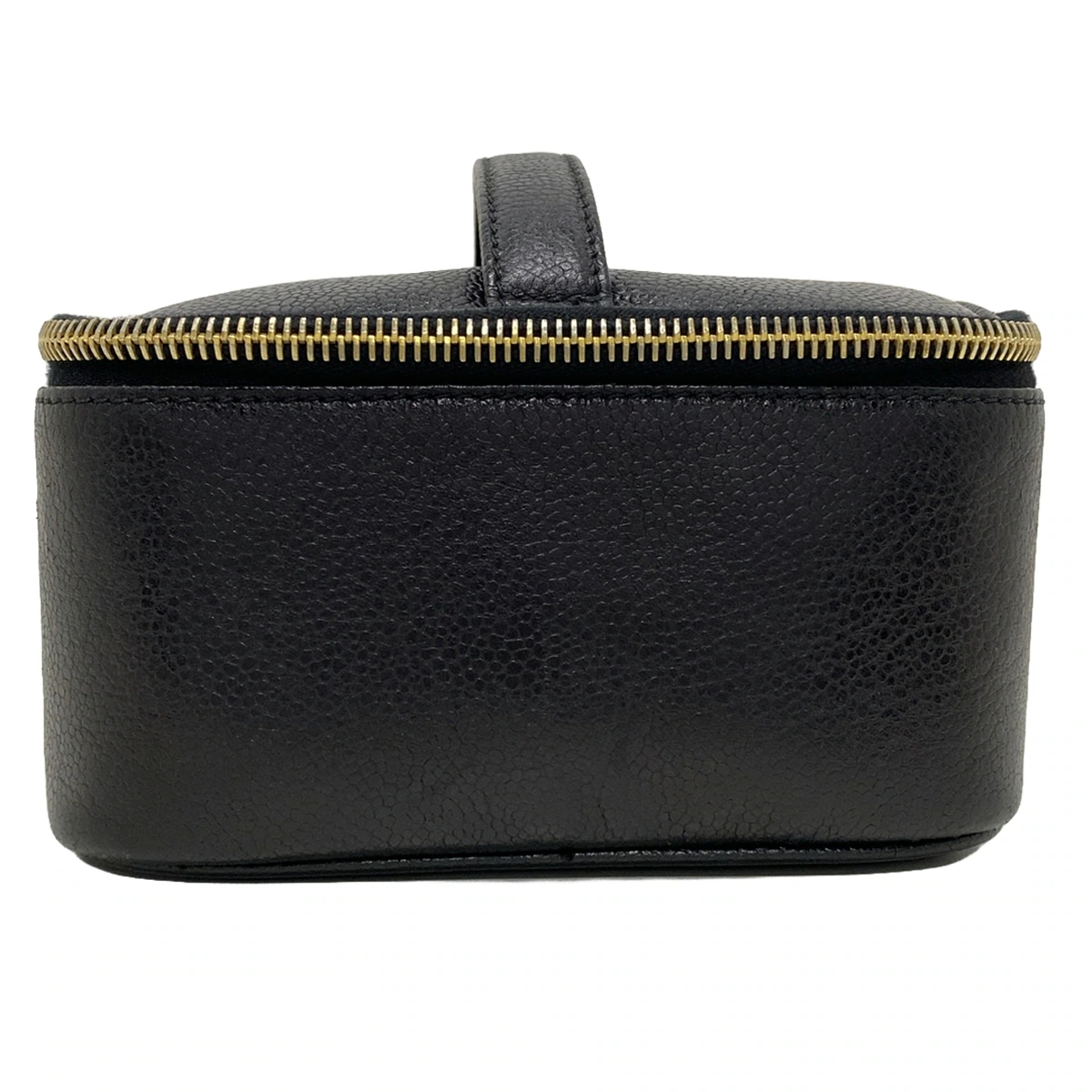 Discover the luxurious CHANEL Vanity Bag in sleek black caviar skin. This portable bag features a spacious inside compartment and durable exterior with minimal signs of wear. Perfect for carrying your essentials with style and sophistication. Elevate your accessory game with this iconic piece. Measurements Height : 3.54 inch (9 cm) Width : 6.69 inch (17 cm) Depth : 6.3 inch