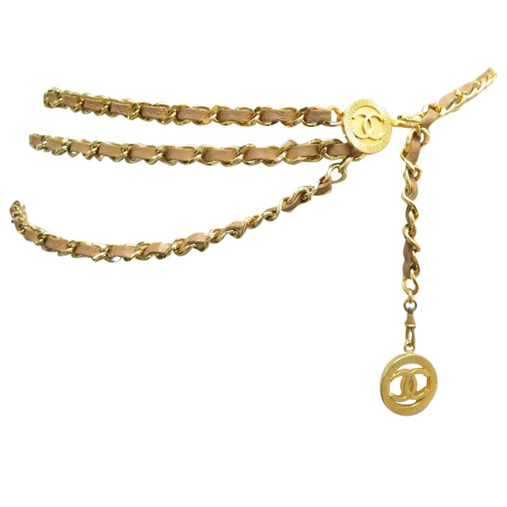 Chanel Vintage Coco Mark Gold Plated & Beige Leather Chain Belt