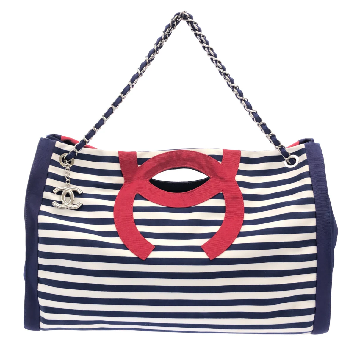 This CHANEL shoulder bag features a unique design in white, navy, and red nylon. Perfect for adding a pop of color to your outfit.