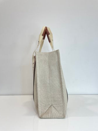 - Material: Reddish Canvas with Brown Calfskin Strips Trim