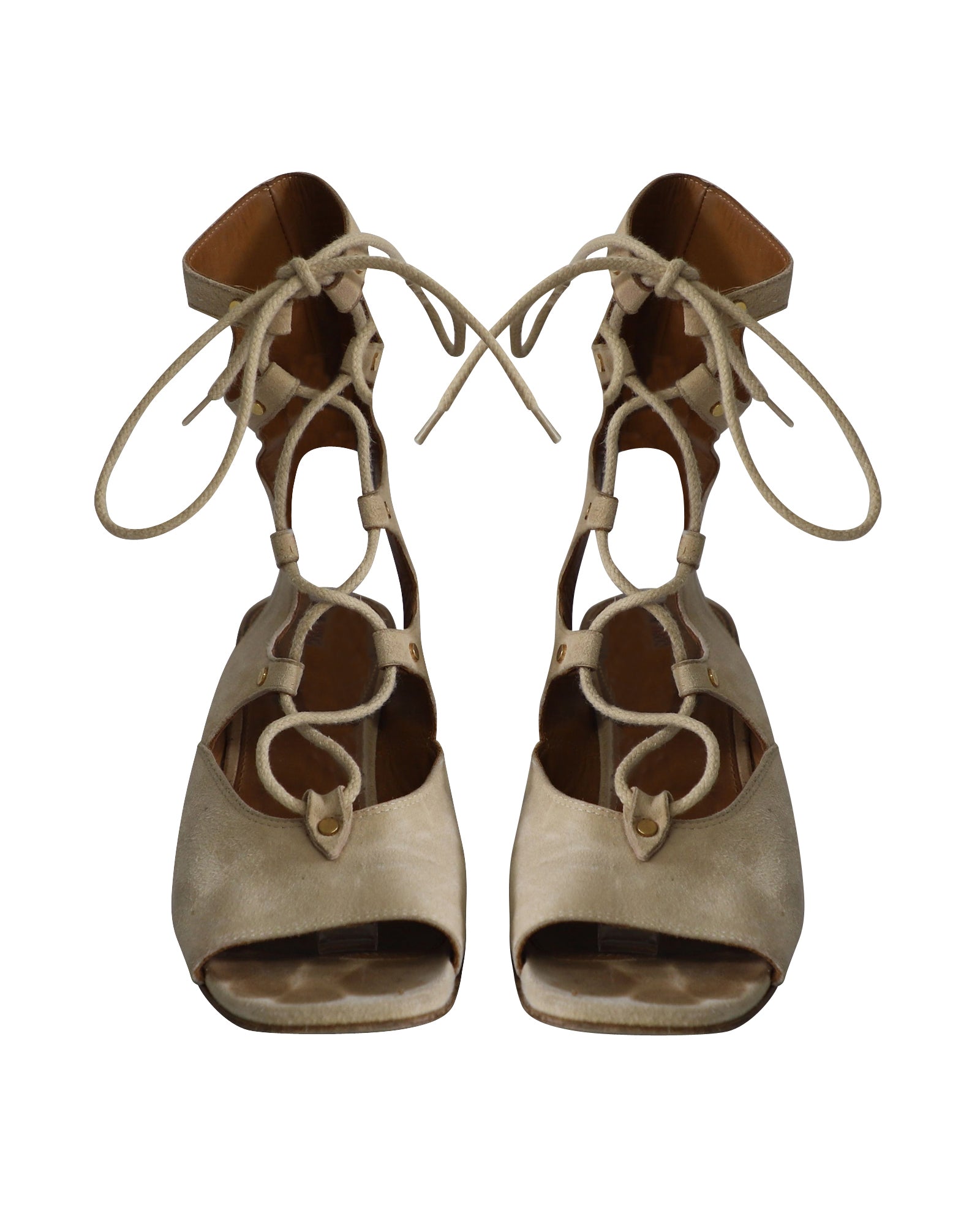 A perfect mix of elegant fashion and comfortable style, these Chloe sandals come crafted from suede and detailed with lace-ups and open counters. They're visually stunning and they stand tall on wedge heels.Chloe Foster Lace-Up Wedge Sandals in Nude SuedeMaterial - SuedeColor - NudeSize - EU39/US9/UK6Condition - GoodSign of wear - Moderate wear on soles; Multiple small marks on suede exterior; Foot mark on insoles; Comes with dust bagSKU - 181989