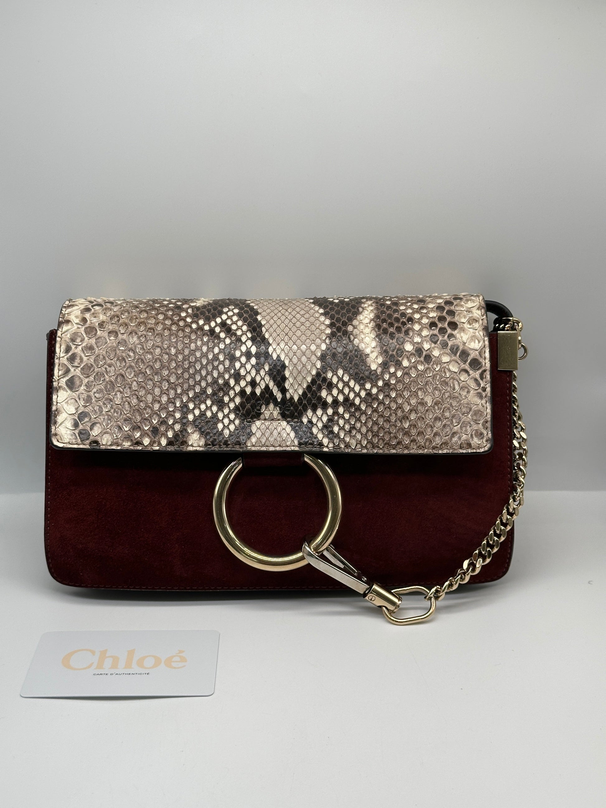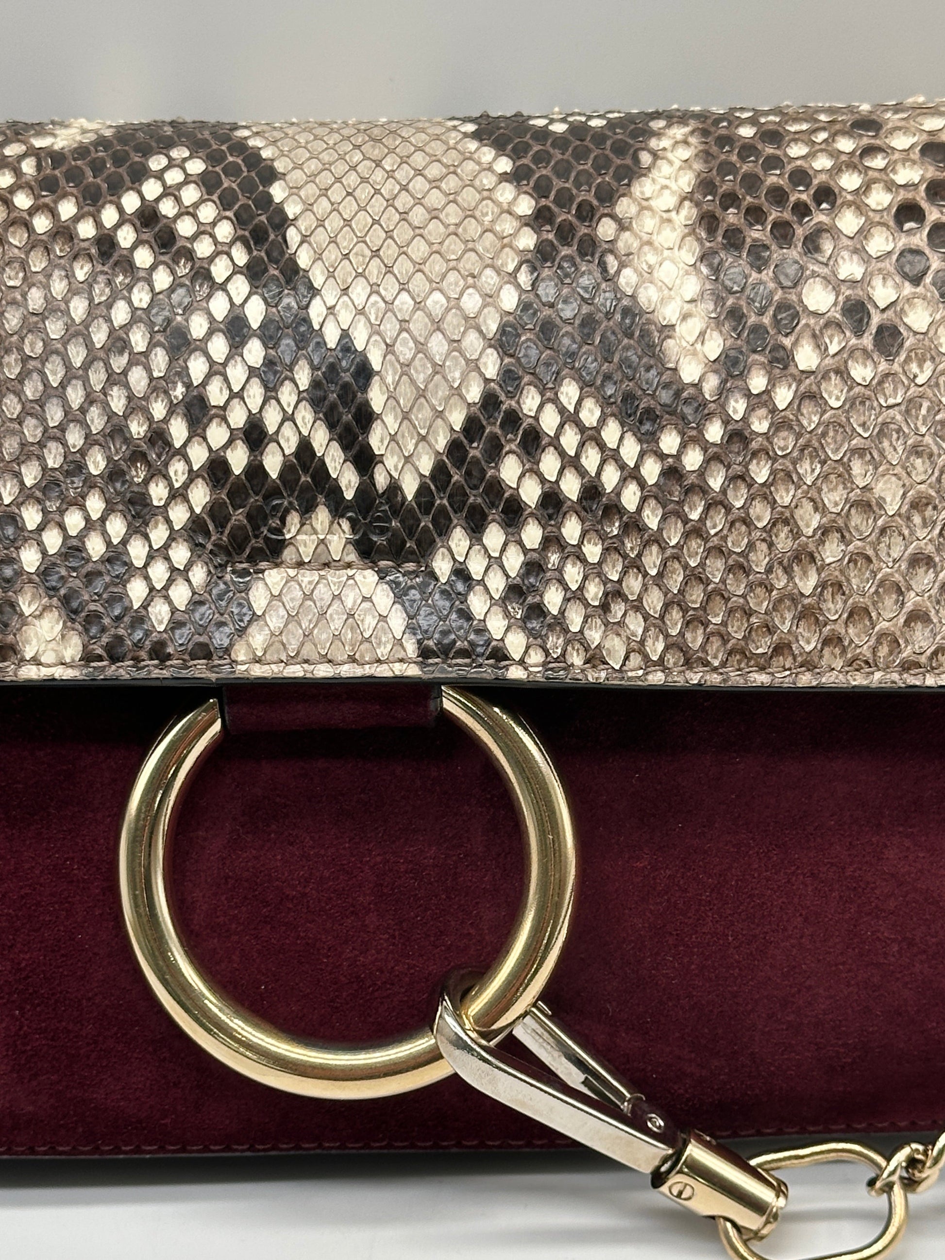 Chloé Faye bag in burgundy suede with snake‑print accents: