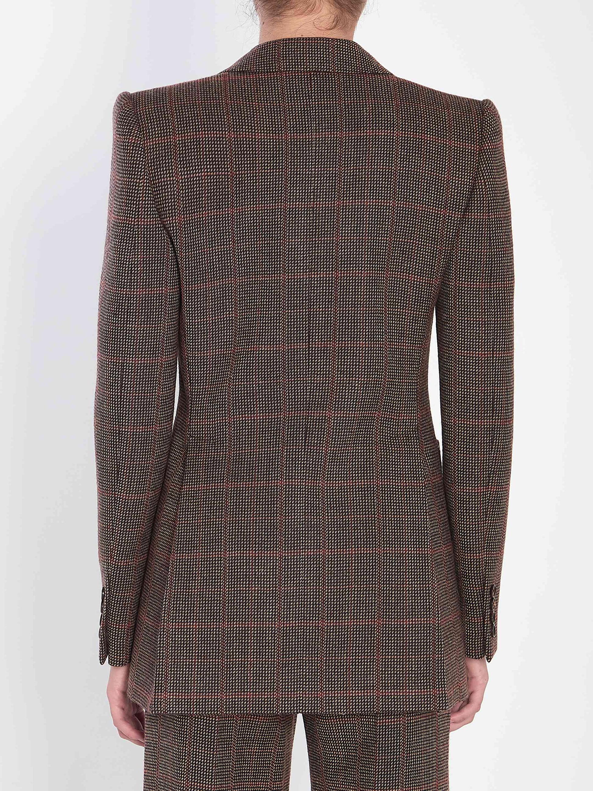 Single-breasted checked wool tailored jacket in brown. Features oversized patch front pockets, engraved horn buttons on the front and cuffs, and peak lapels. Tailored fit.
