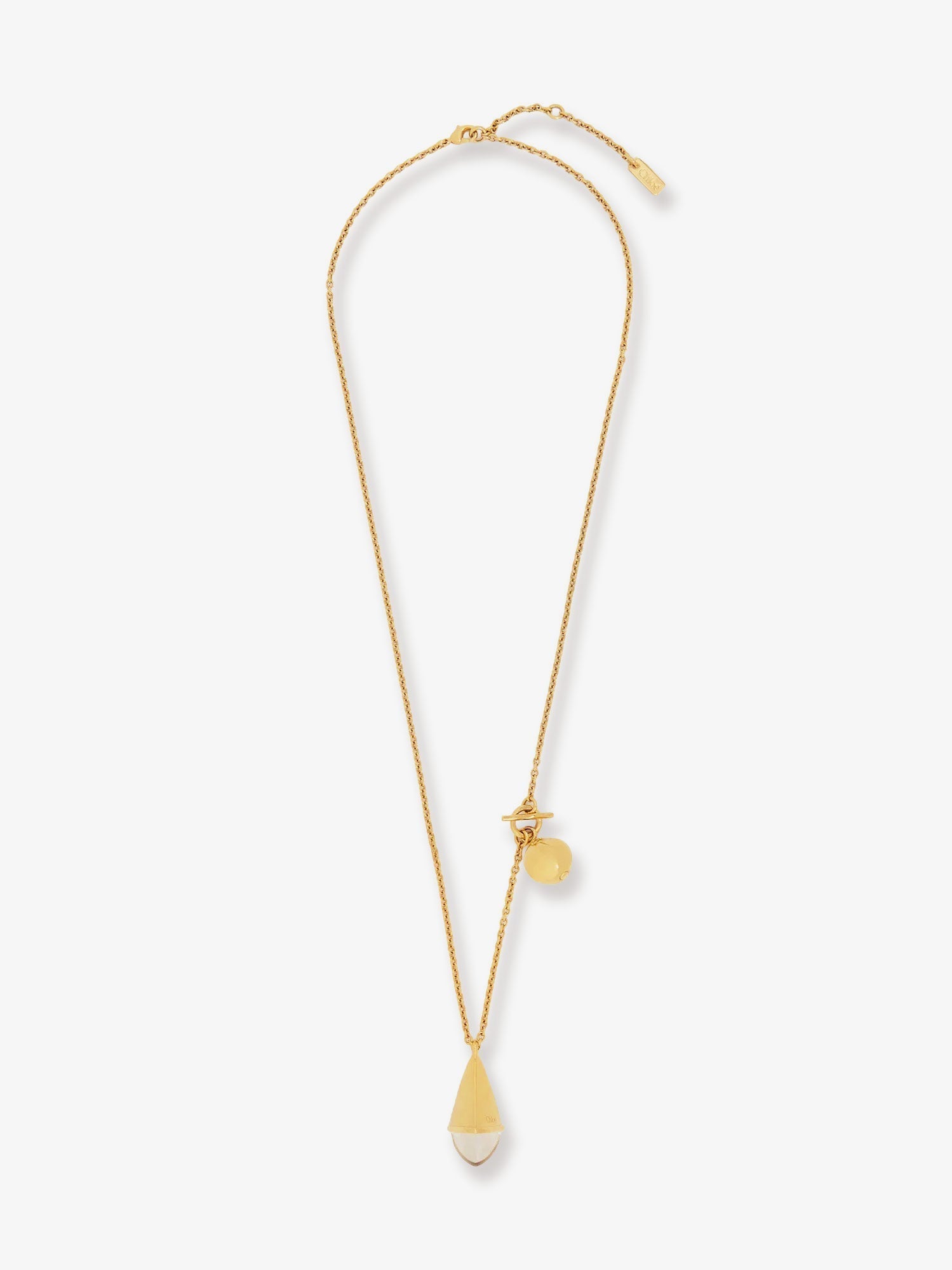 • Adjustable metal clasp closure One sliding prism pendant One fixed round pendant Made in Italy Brass SKU: CH25AJN56RSB7ZM