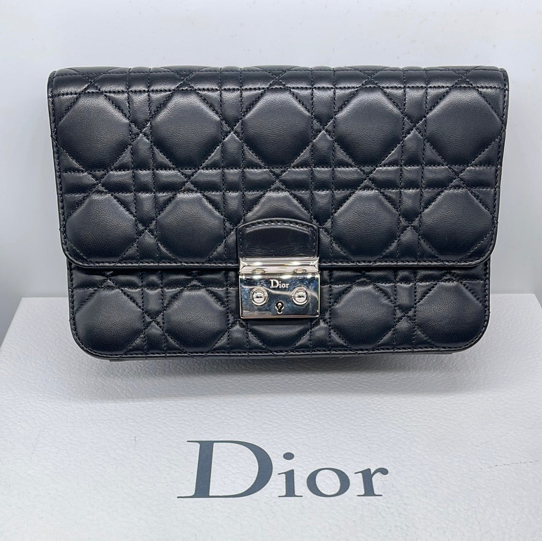 Christian Dior Miss Dior Promenade Cannage crossbody bag in black Lambskin featuring Silver-tone hardware. This Dior flap bag features the signature Cannage quilted exterior, a back slip pocket and a detachable Silver-toned chain strap.