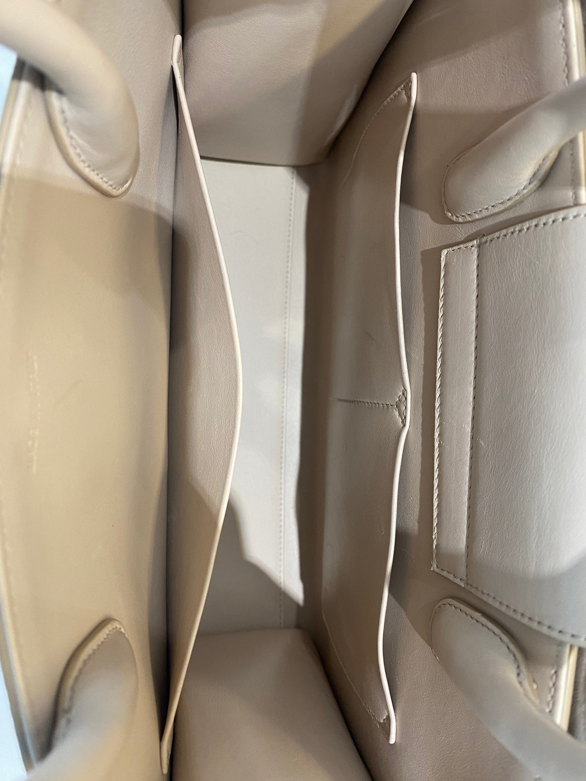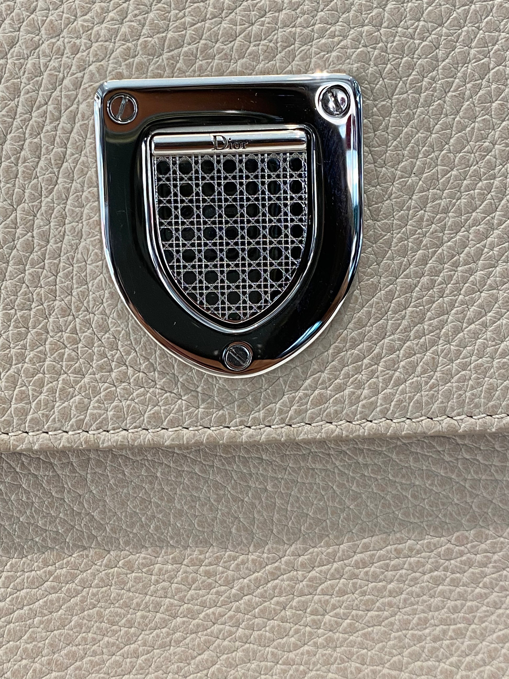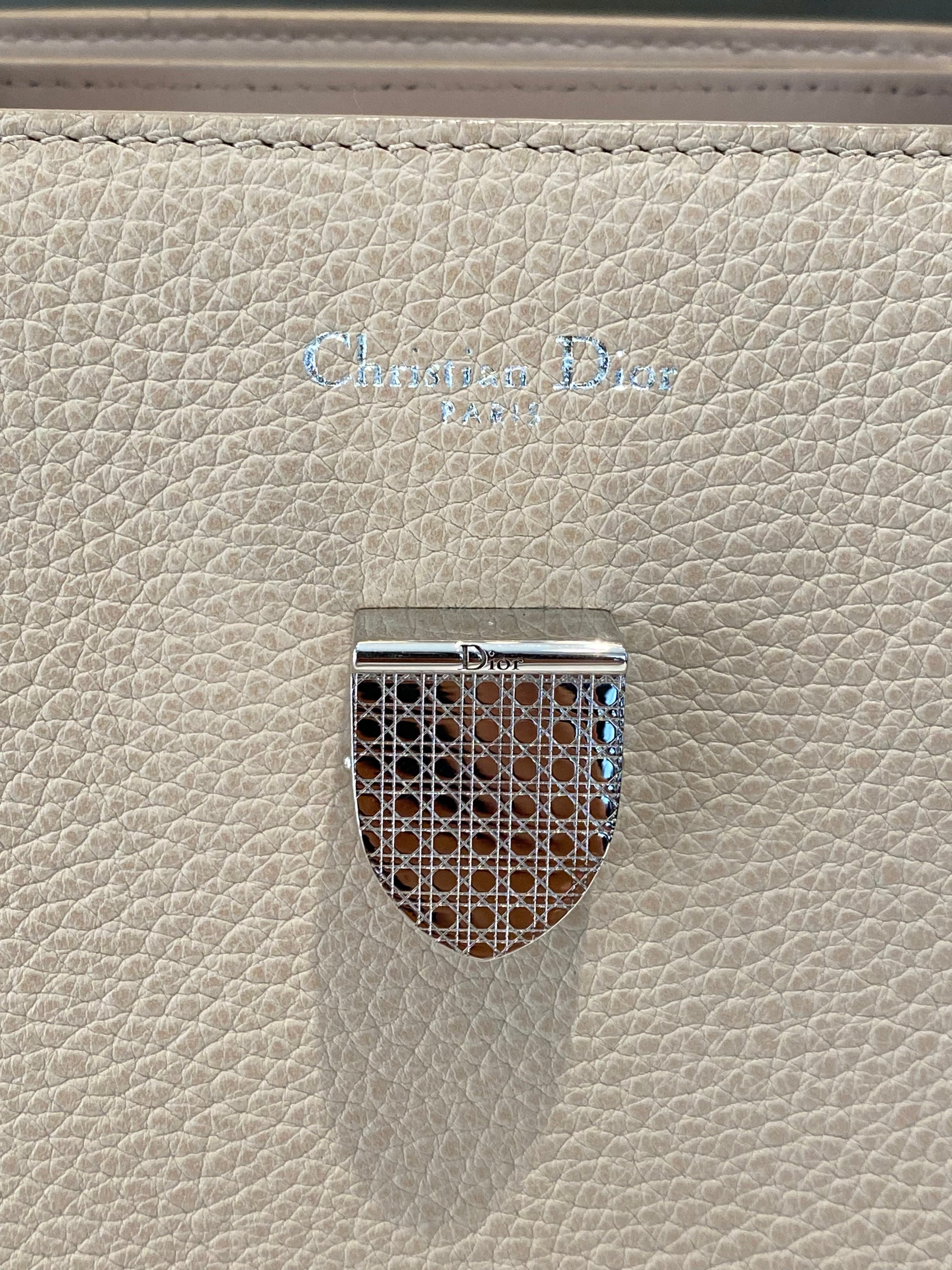 Dior cream leather large Diorever bag. Crafted from grained leather to create a structured finish. Features a silver-tone crested clasp, two top handles, and a detachable and adjustable shoulder strap. The reversible flap leads to a leather interior which has a large compartment with two side slip pockets and a smaller slip compartment at the back.