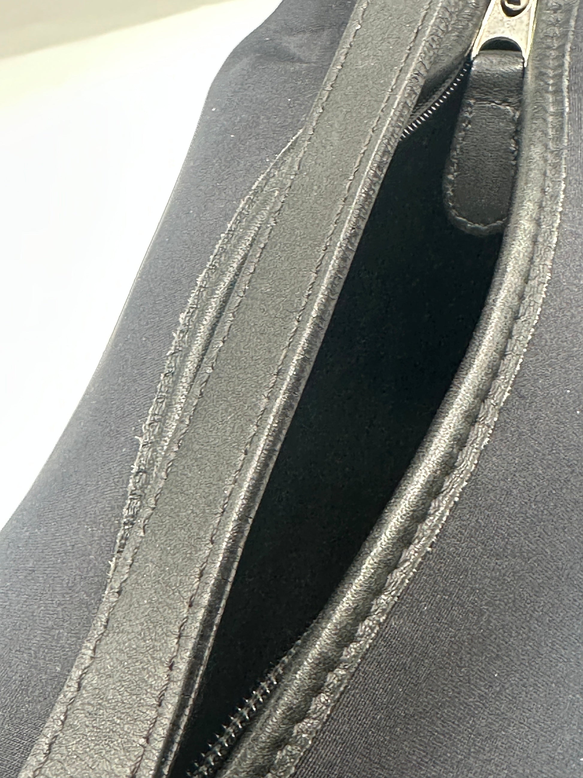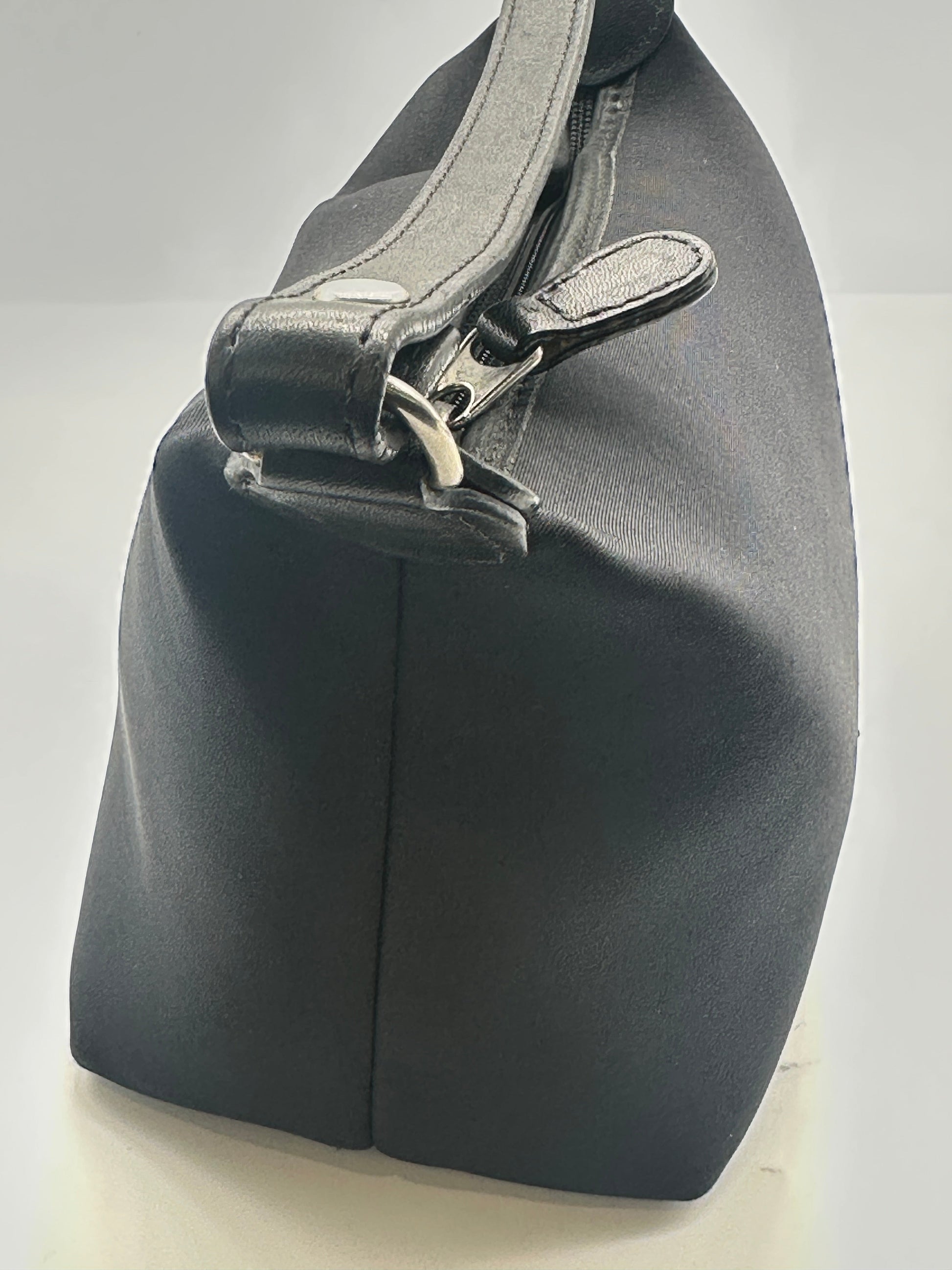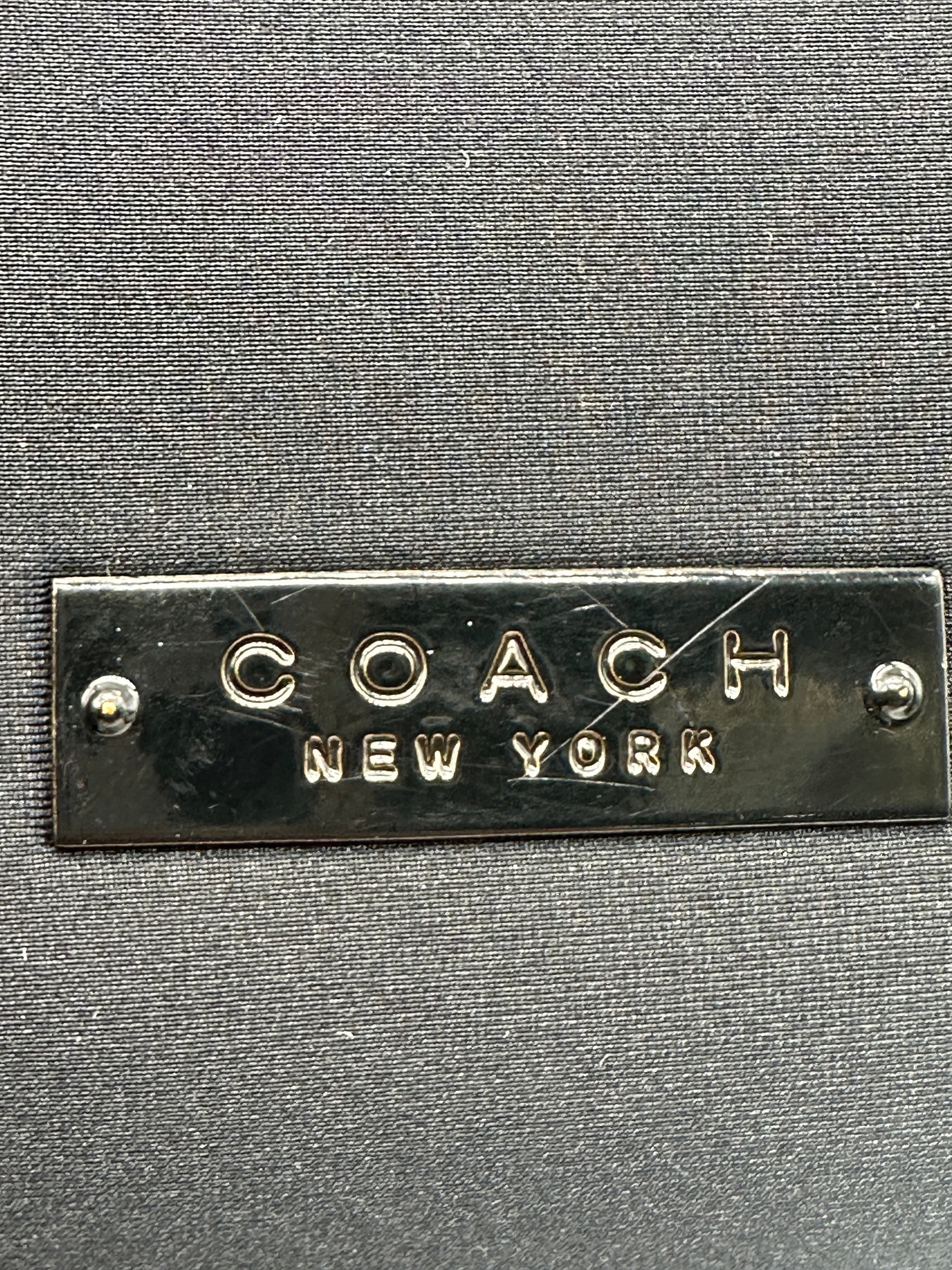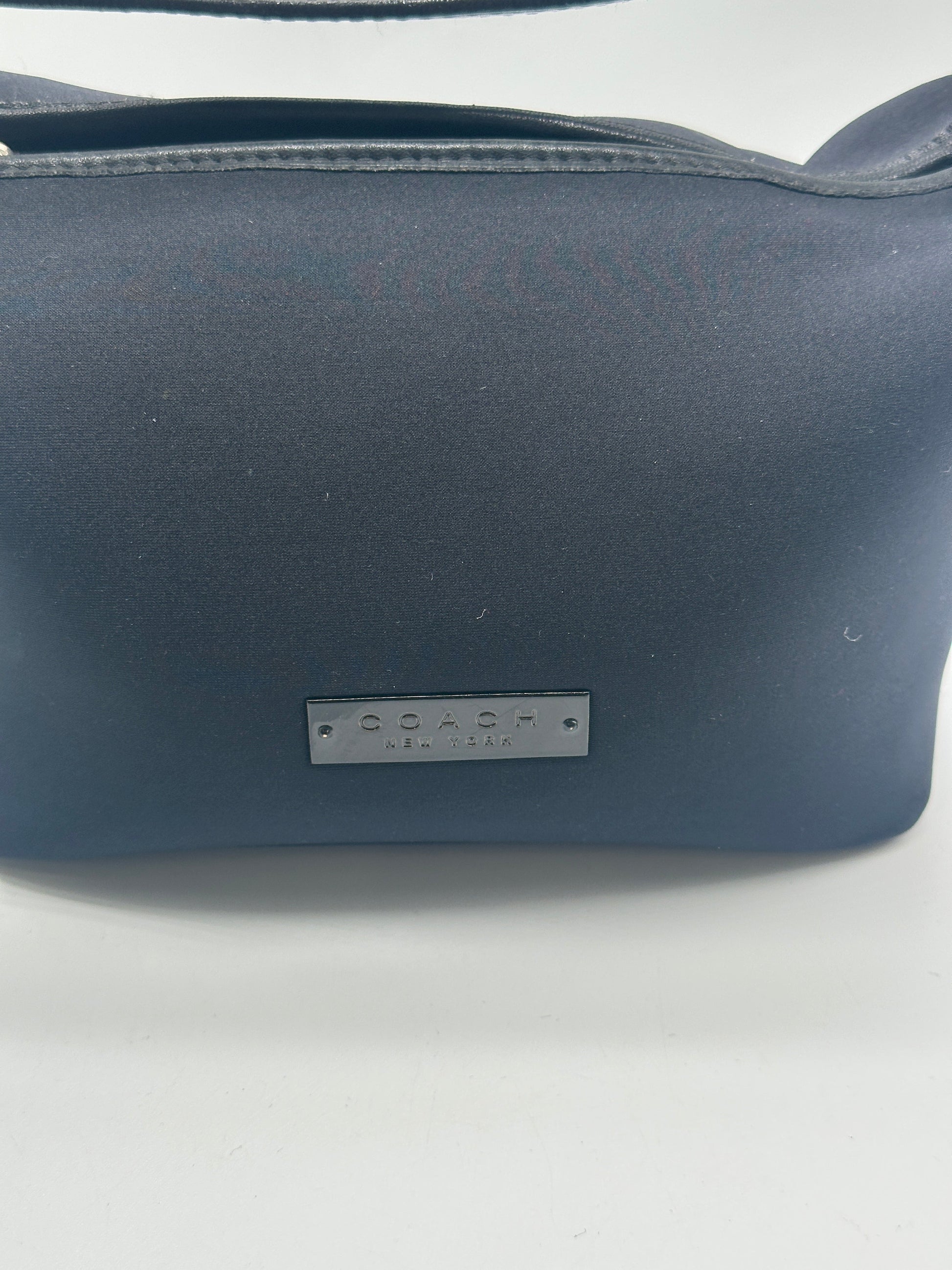 This vintage Coach mini handbag showcases a sleek black neoprene exterior, complemented by leather trim for a touch of sophistication. The bag features a top snap closure, ensuring your essentials are securely stored. Inside, you'll find a convenient zipper pocket for additional organisation. With approximate measurements of 9.5 inches in length, 6 inches in height, and 3 inches in width, and handle drops of 5 inches, this compact accessory is both stylish and functional.