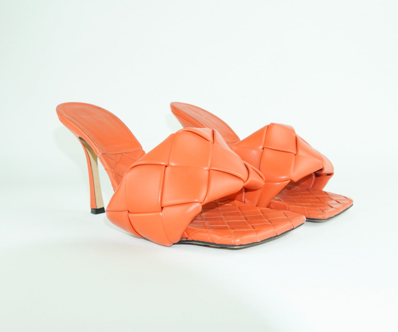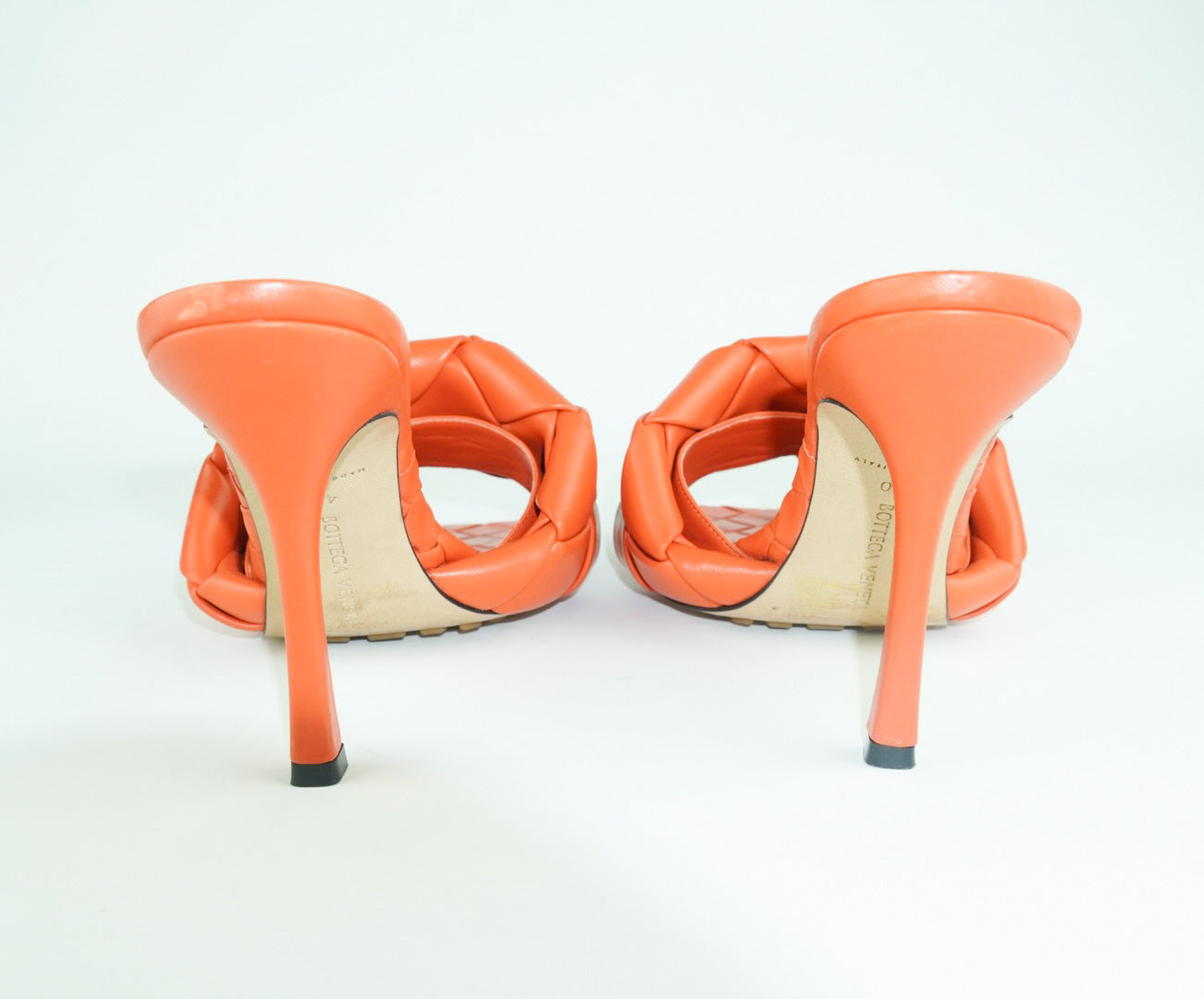 Bottega Veneta Quilted High Heel Slide Sandals in size 40 or . The color of this item is Paprika which is an orange-Red Color. This Product is in New Condition with box and dust bag.
