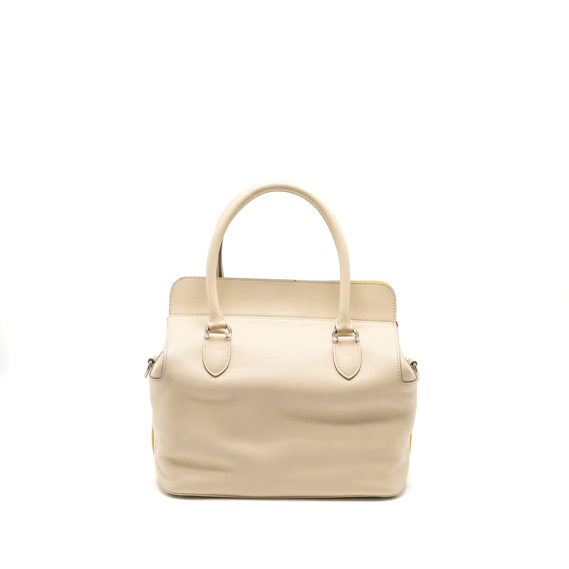 Details: Condition: 9.5/10 Well New (This item is in New condition with minor rubbing on corners, slight scratches on hardware, obvious rubbing on one handle, sign of use on shoulder strap.) Colour: Craie / Jaune Poussin Hardware: Silver Tone Measurement: Length: 26 cm Height: 24.5 cm Depth: 18 cm Handle: ~ 19.5 cm Strap Length: 79.5 cm Material : Clemence Leather Stamp: Square Q Origin : France Inclusion: Dust Bag