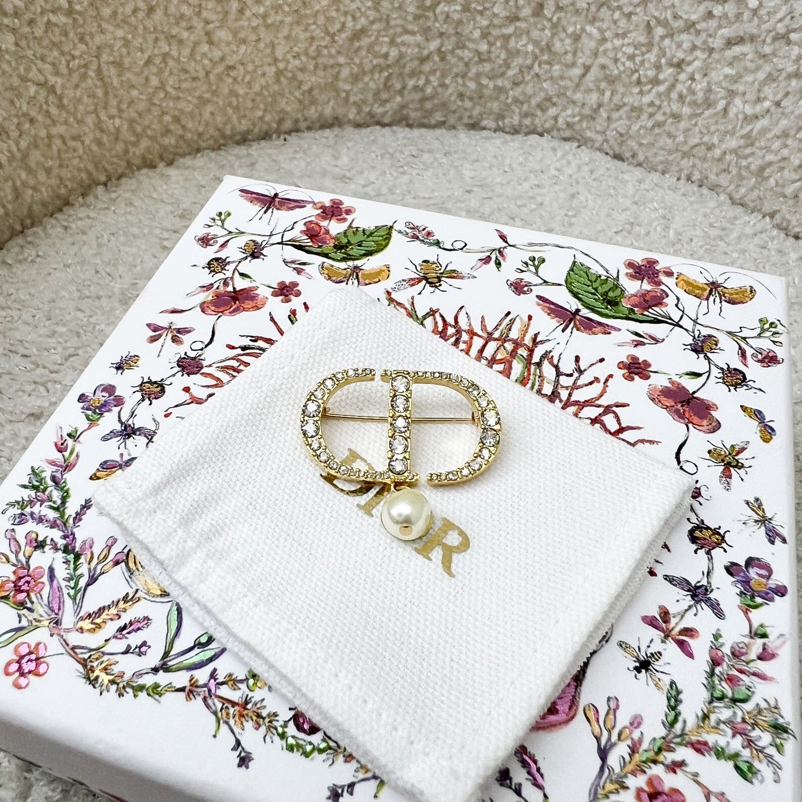 Dior Petit CD Brooch studded with Crystals and Dangling Pearl in Gold Tone HW