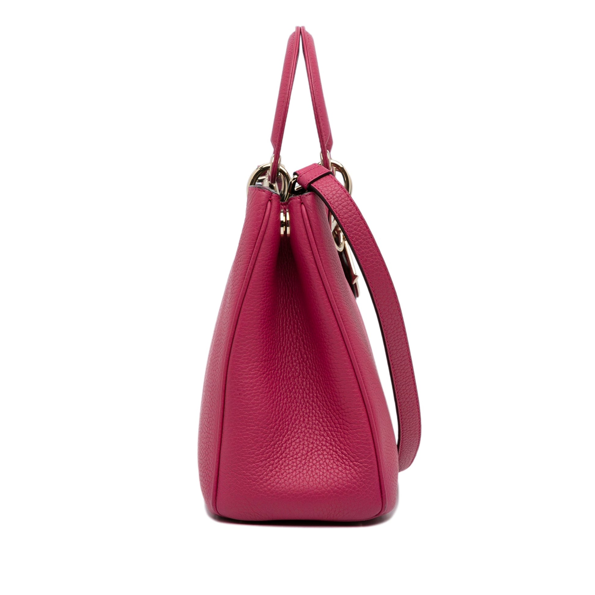 - The golden hardware adds a touch of luxury to the pink leather fabrication.