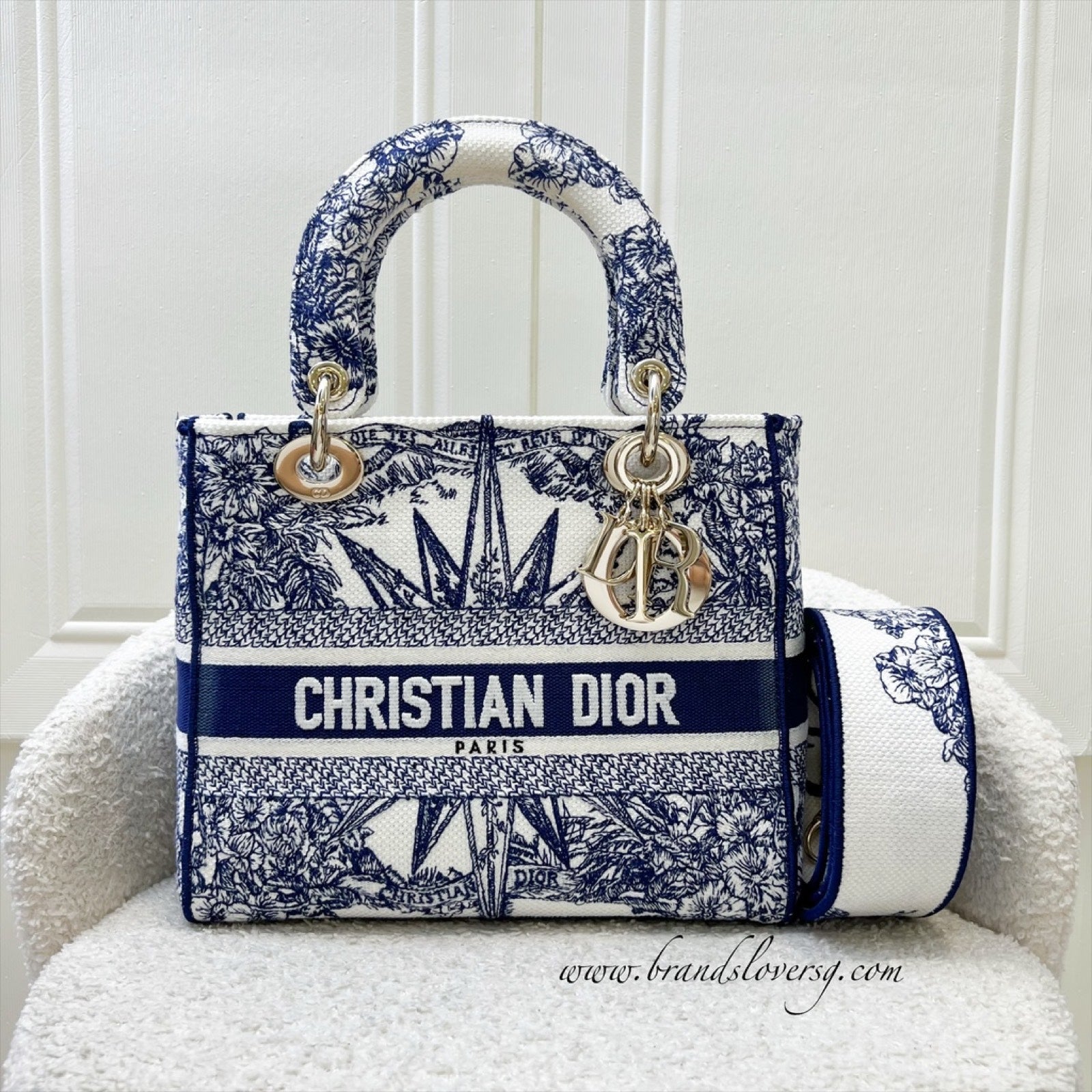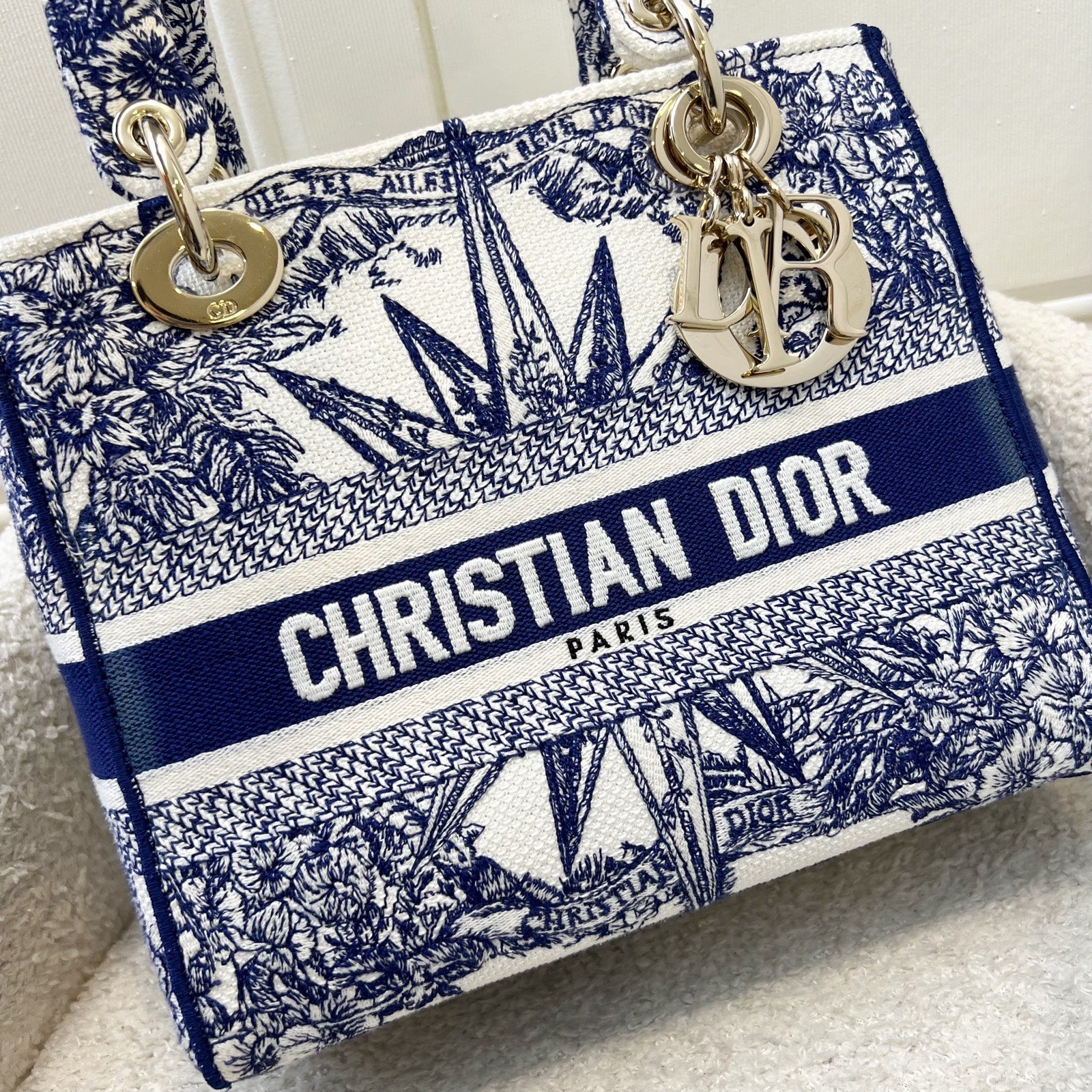 Dior Medium Lady D-lite Bag in White and Blue Toile de Jouy Embroidery and LGHW