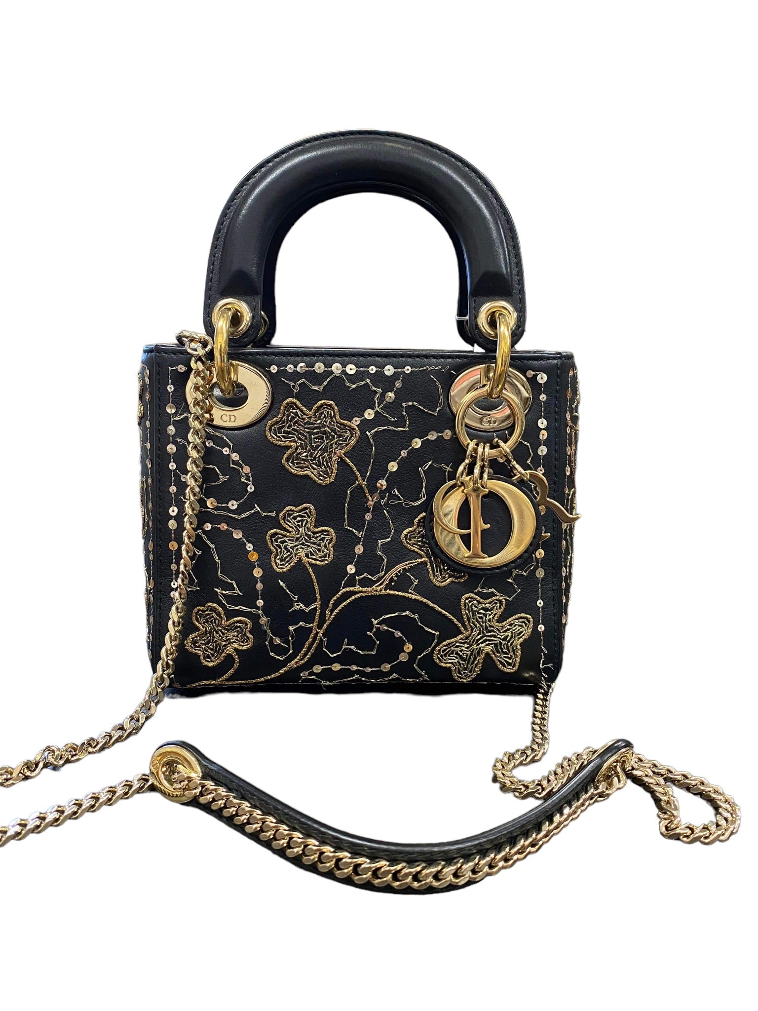 This DIOR Mini Lady Dior handbag is elegantly crafted with embroidered flowers and accented with gold toned hardware. The delicate embroidery adds a touch of femininity, making it the perfect statement piece for any occasion. Its smaller size allows for convenient, yet stylish, carrying.