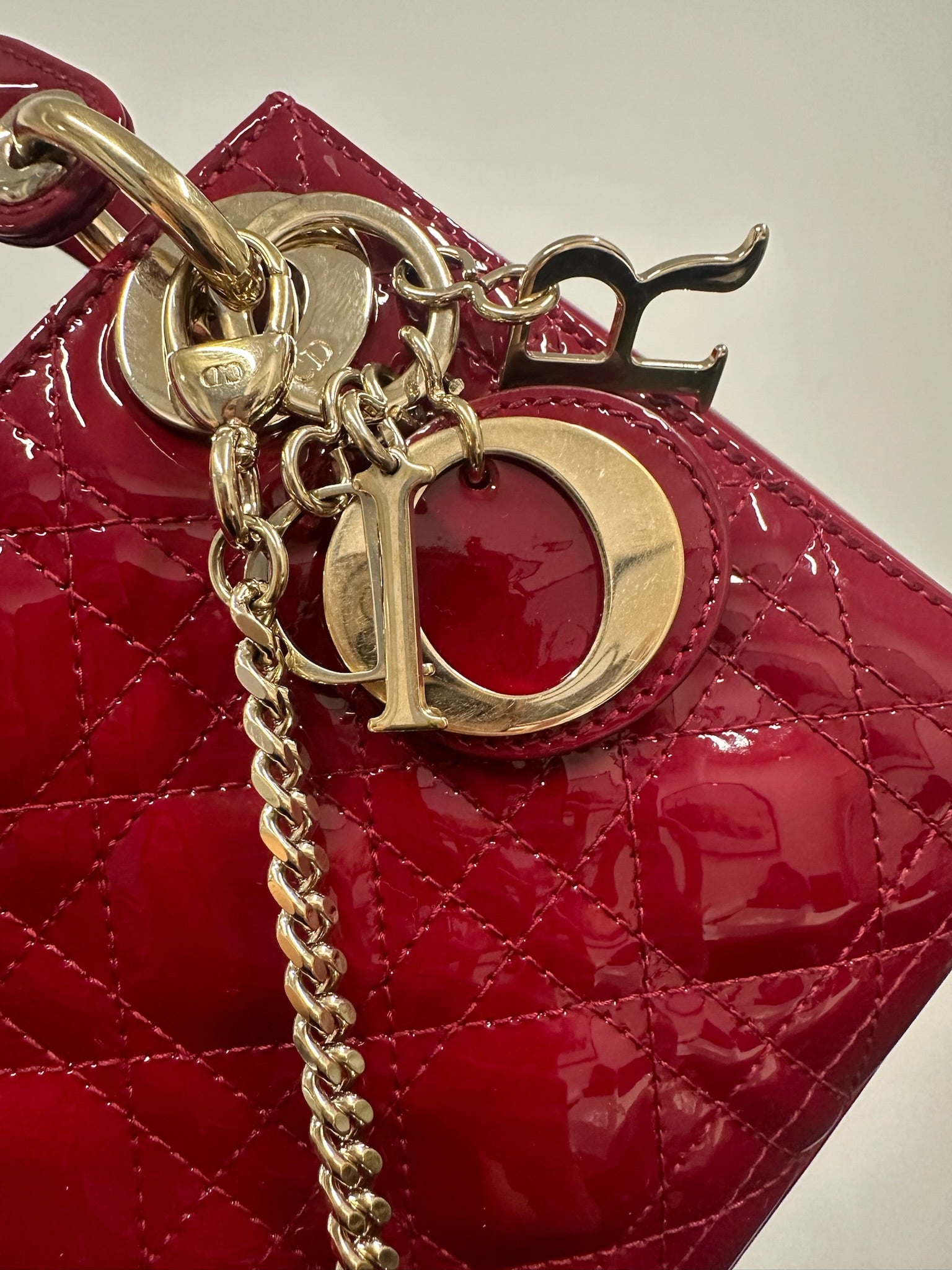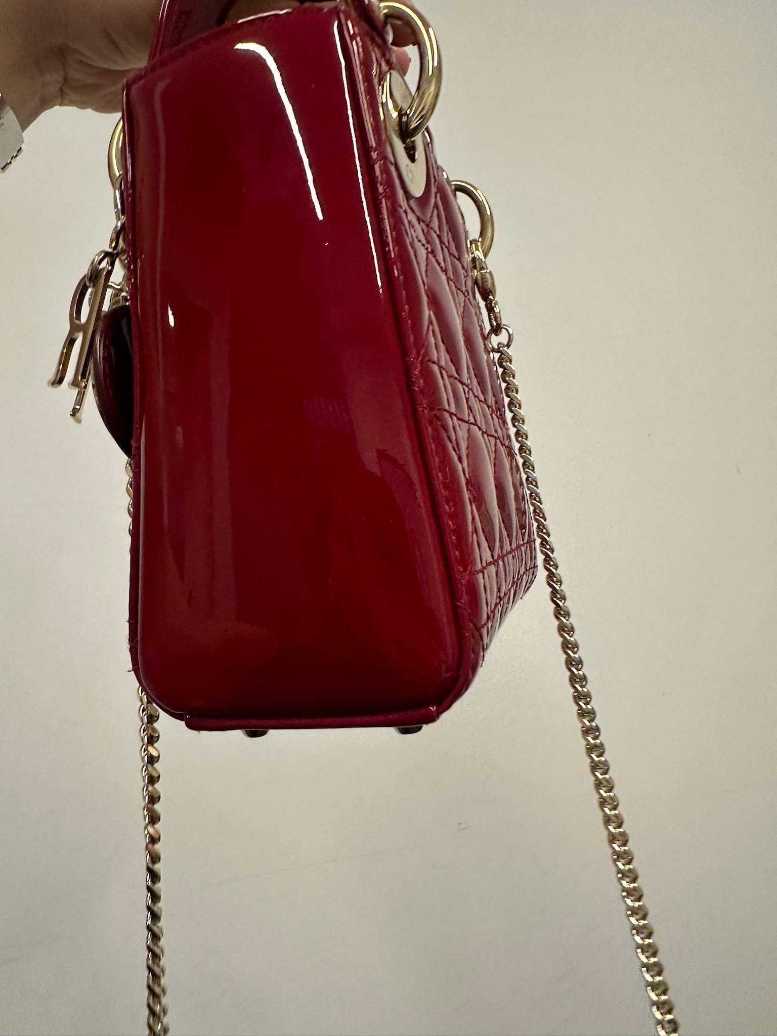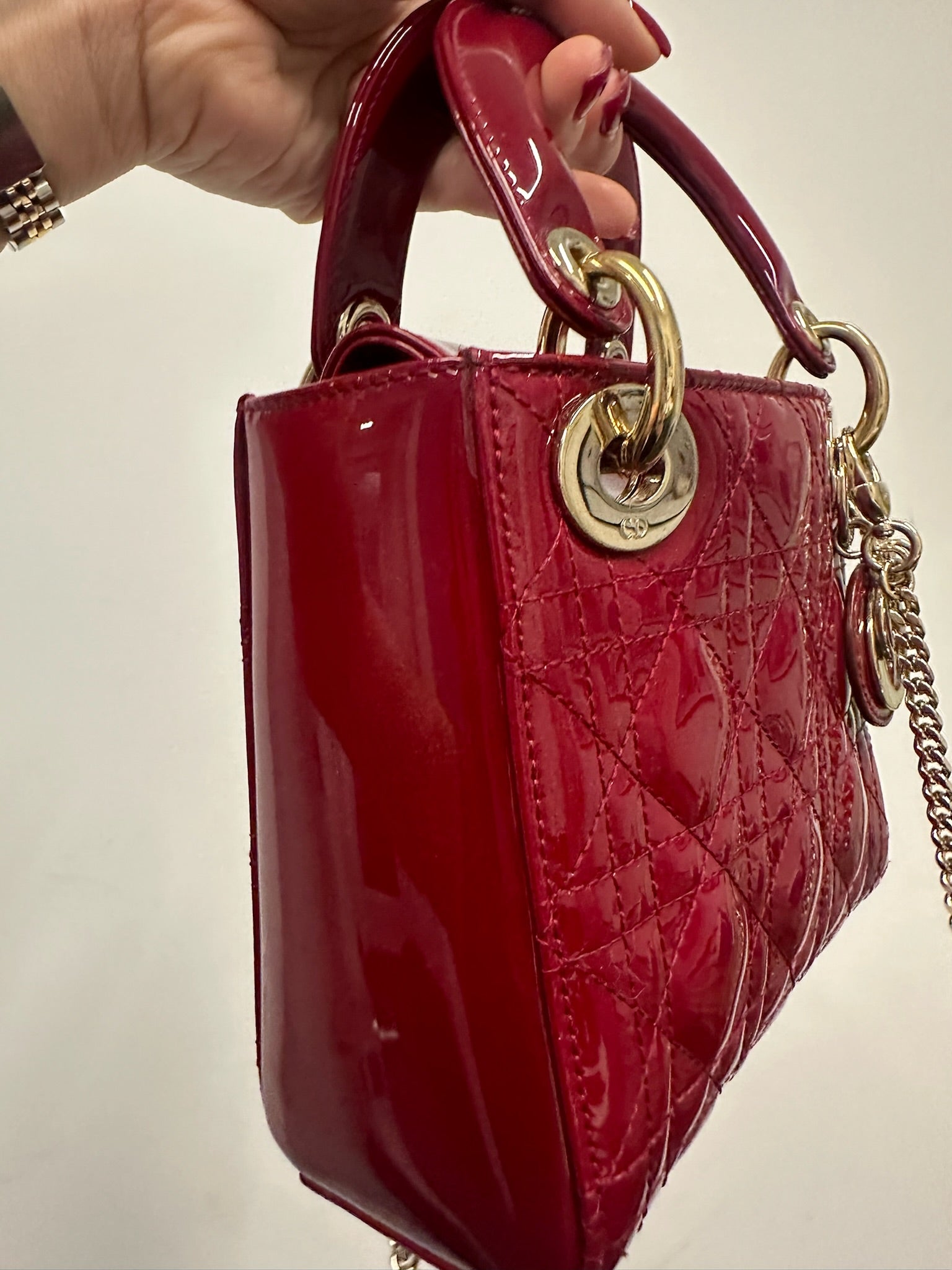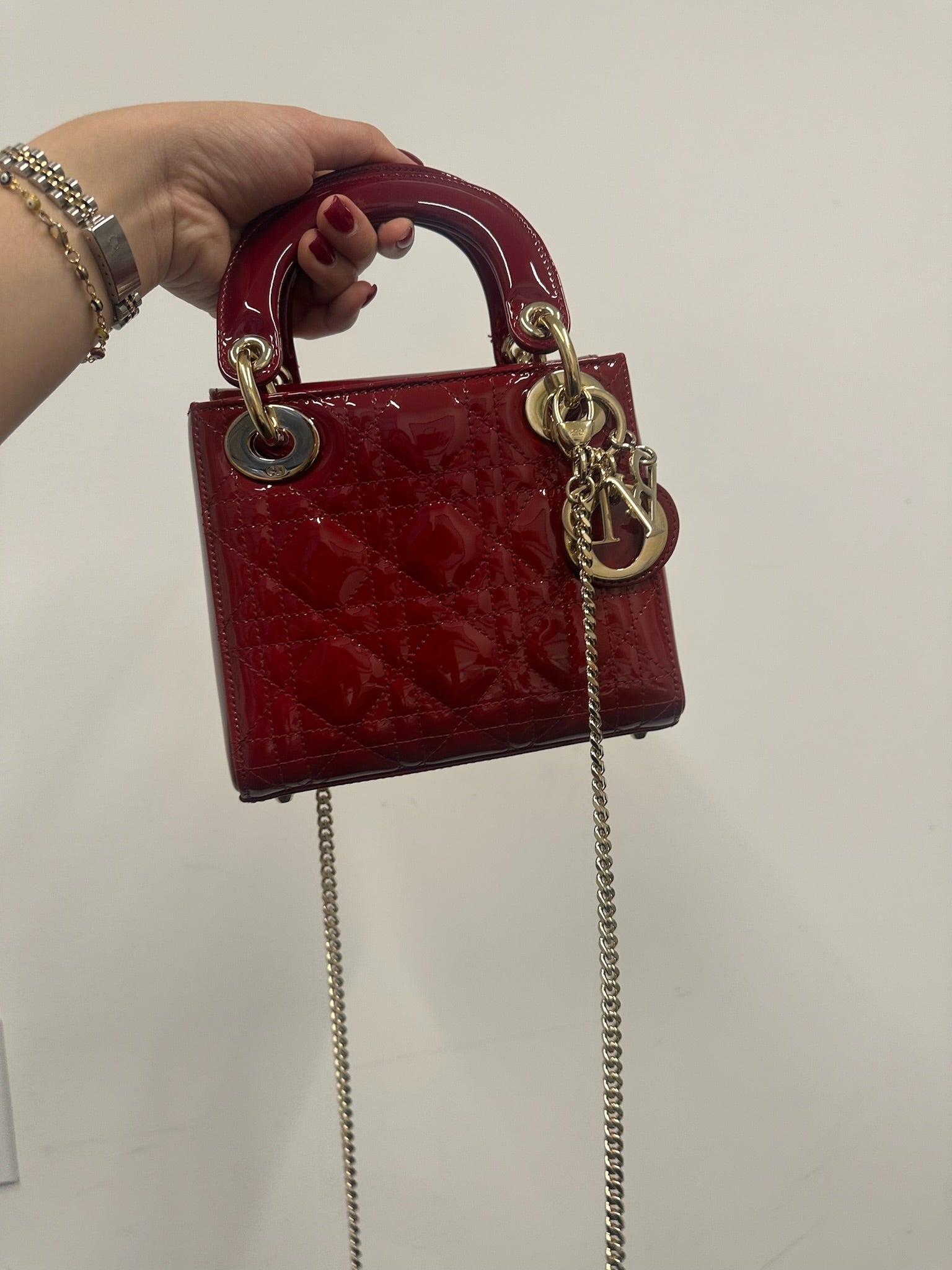 Experience luxury with the DIOR Mini Lady Dior in Red. The iconic bag features golden toned hardware, adding a touch of elegance to any outfit. A statement piece that will elevate your look and make you stand out in a crowd!