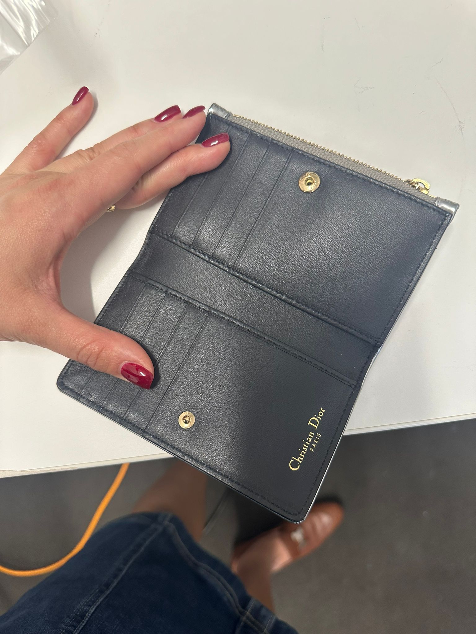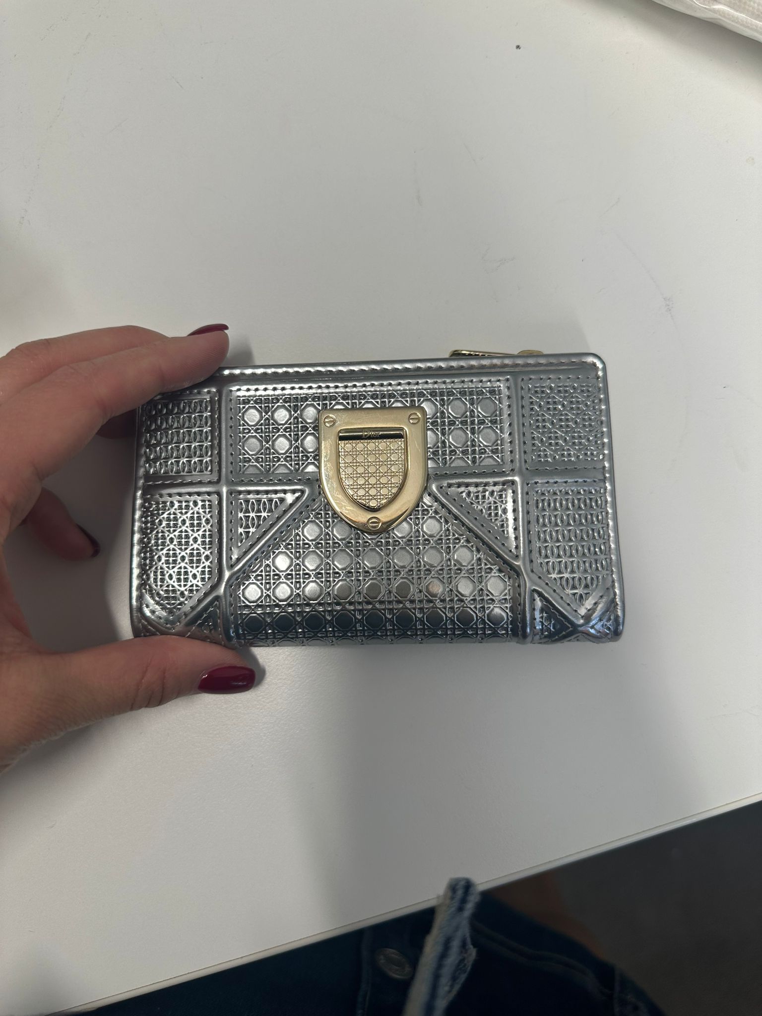 The DIOR Silver Micro Cannage Patent Leather Diorama Wallet is a stylish accessory with the following specifications: