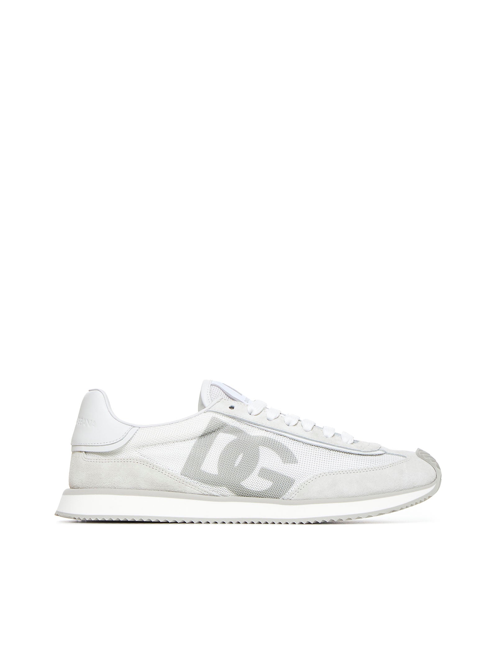Dolce & Gabbana's Aria low-top sneakers in mesh, suede and leather in shades of white and light grey featuring a rounded almond toe, front laces, logo label on the tongue, side DG logo, logo lettering embossed on the heel patch and rubber sole.