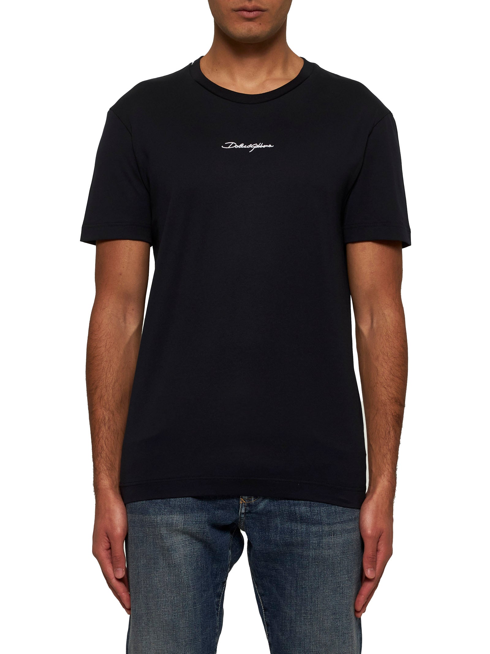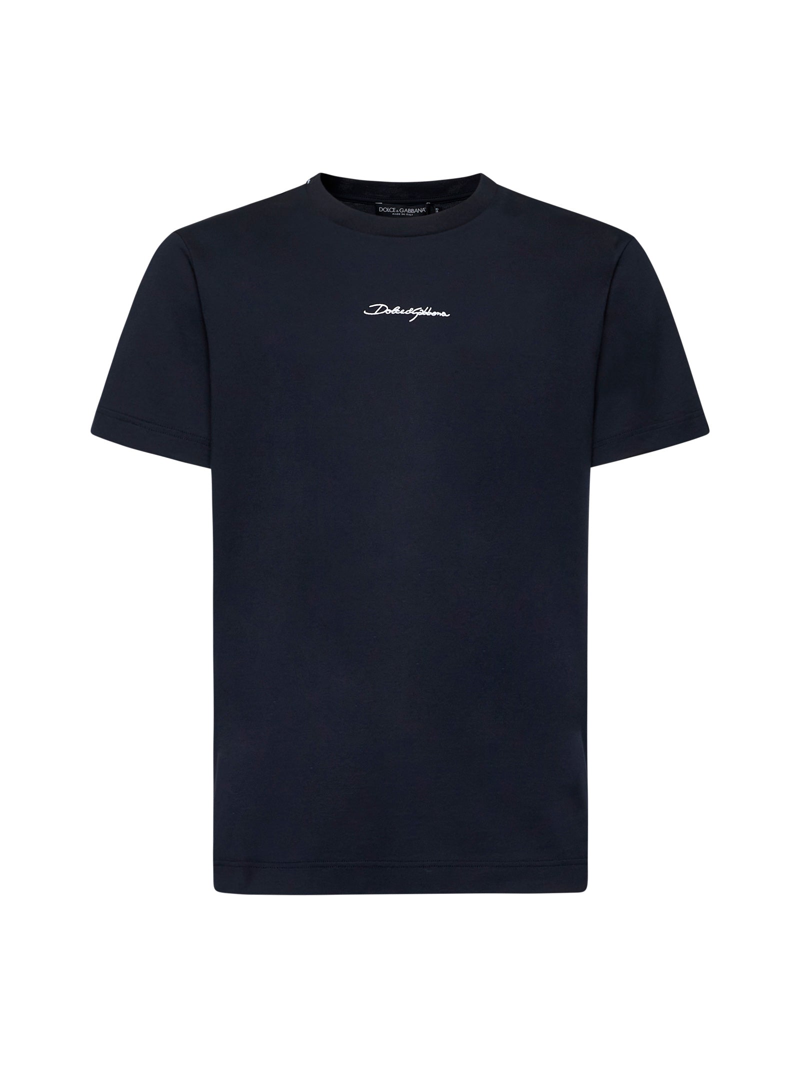 •Ribbed crewneck; stick logo label at neck•Short sleeves•Contrasting Dolce&Gabbana embroidery at front•Regular fit•Blue color•100% Cotton•Made in Italy