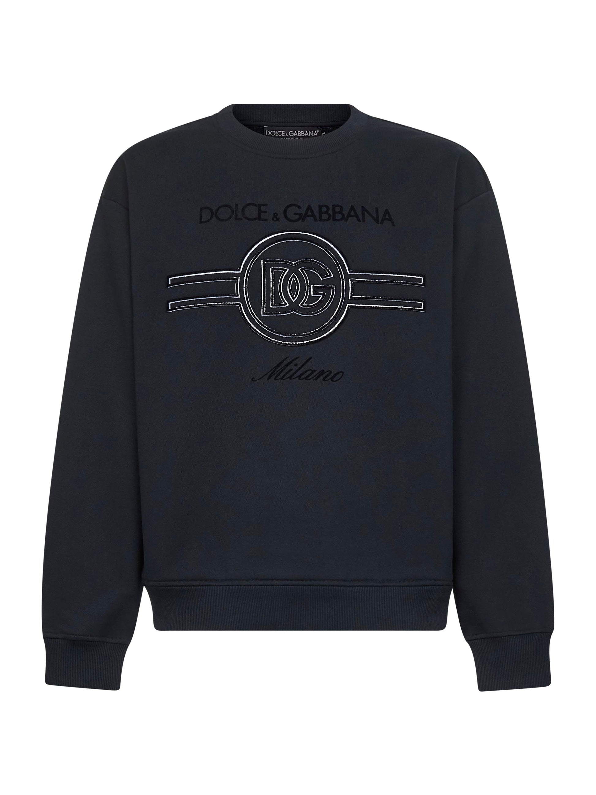 •Ribbed crewneck •Long sleeves, dropped shoulders •Tone-on-tone DOLCE & GABBANA Milano flocked lettering at front; DG artwork embroidered at front •Ribbed cuffs and bottom band •Regular fit •Blue color •100% Cotton •Made in Italy