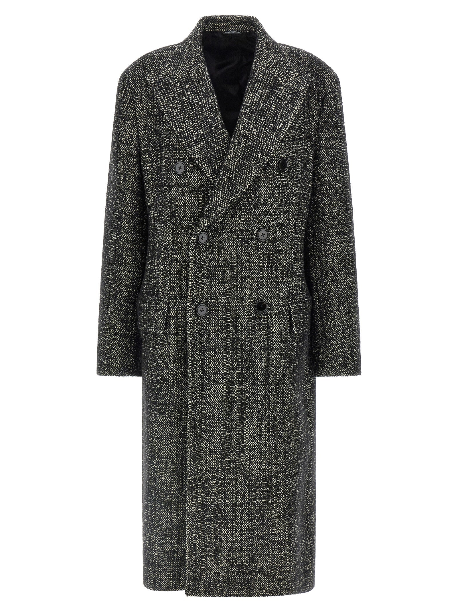 Two-breasted long coat in wool and cashmere bouclé with front button closure, lapel collar, breast pocket, flap pockets, structured shoulder strap, long sleeves, cuffs with open buttonholes, back split, viscose lining.