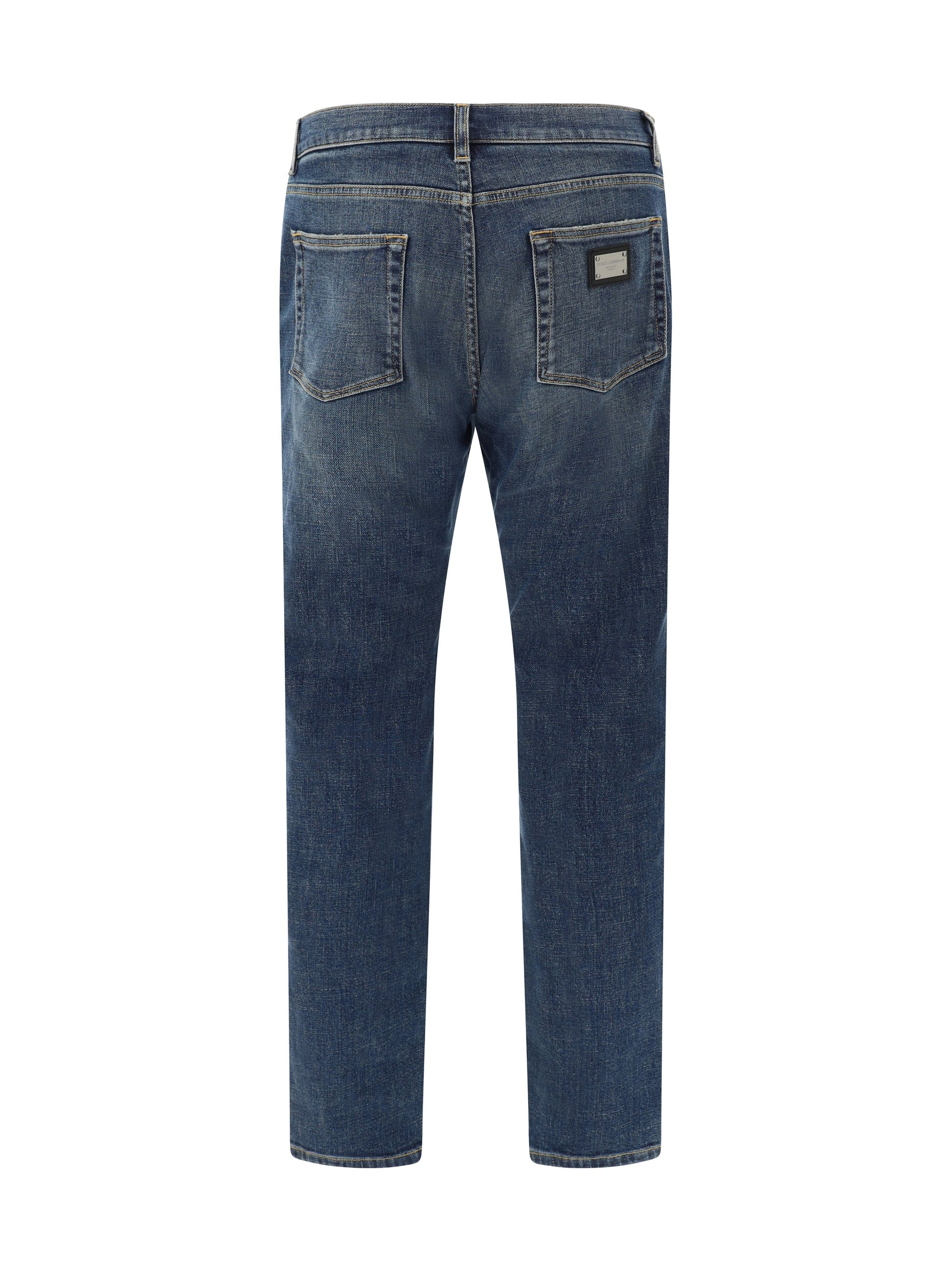 Cotton Jeans by Dolce&Gabbana, five-pocket straight style, front button and zipper closure, belt loops for waistband, metal plaque with the brand's iconic D&G monogram engraved and applied on the back.