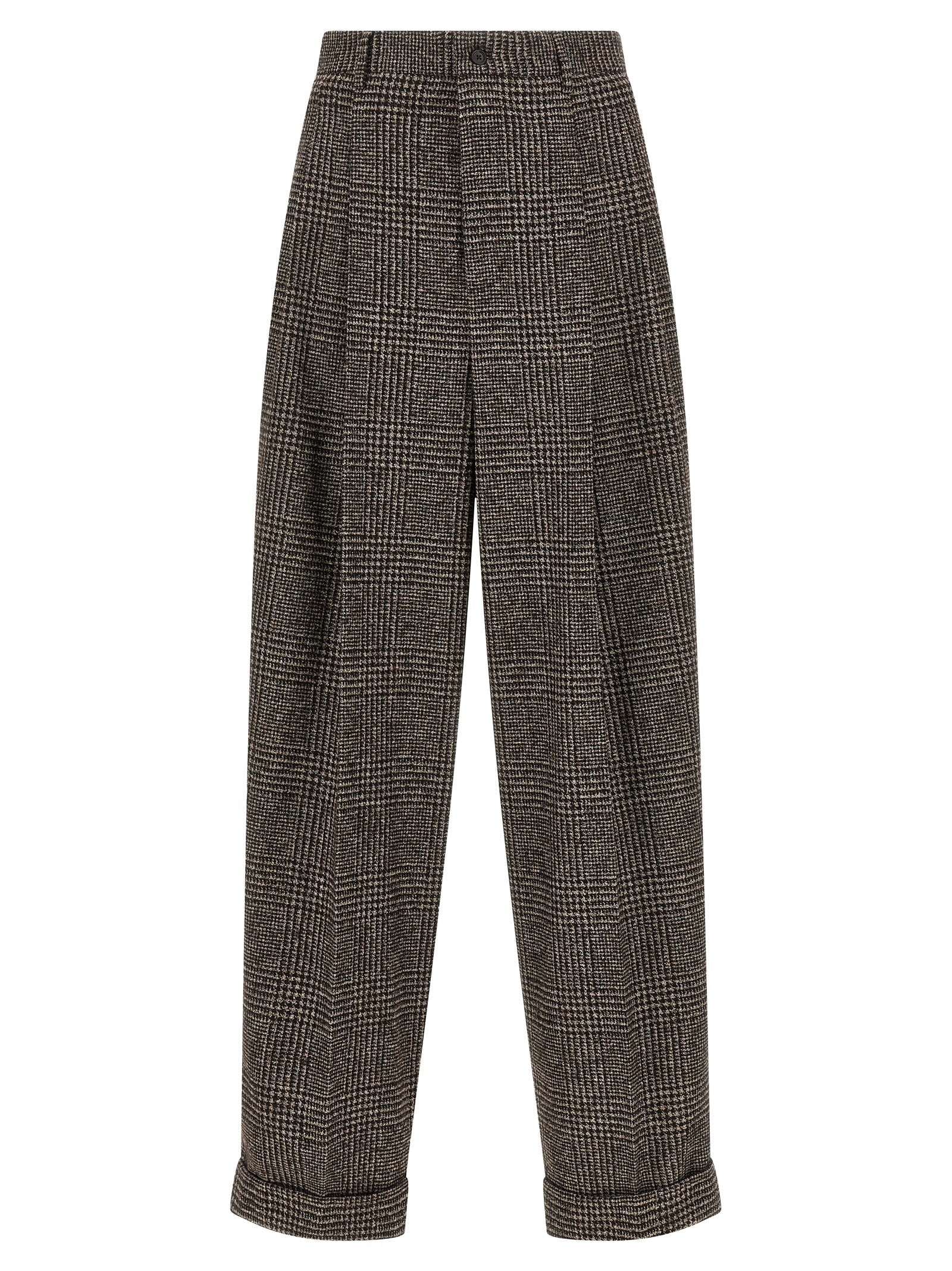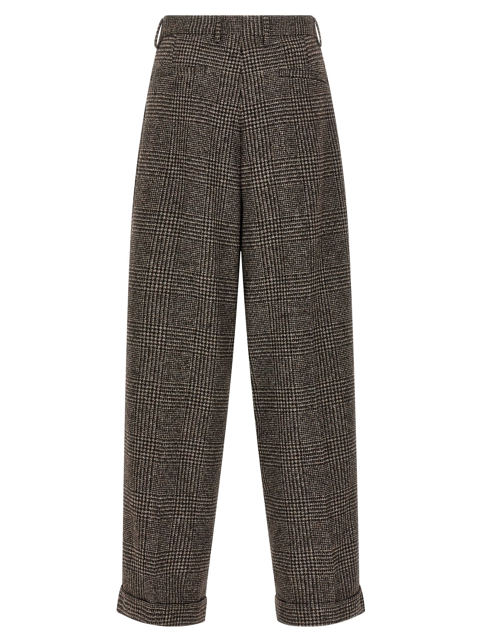 Prince of Wales alpaca blend, wool and cotton pants, pleats, expanded pleat, hook and front button zip closure, wide and straight leg, pockets, turn-up on the leg bottom.