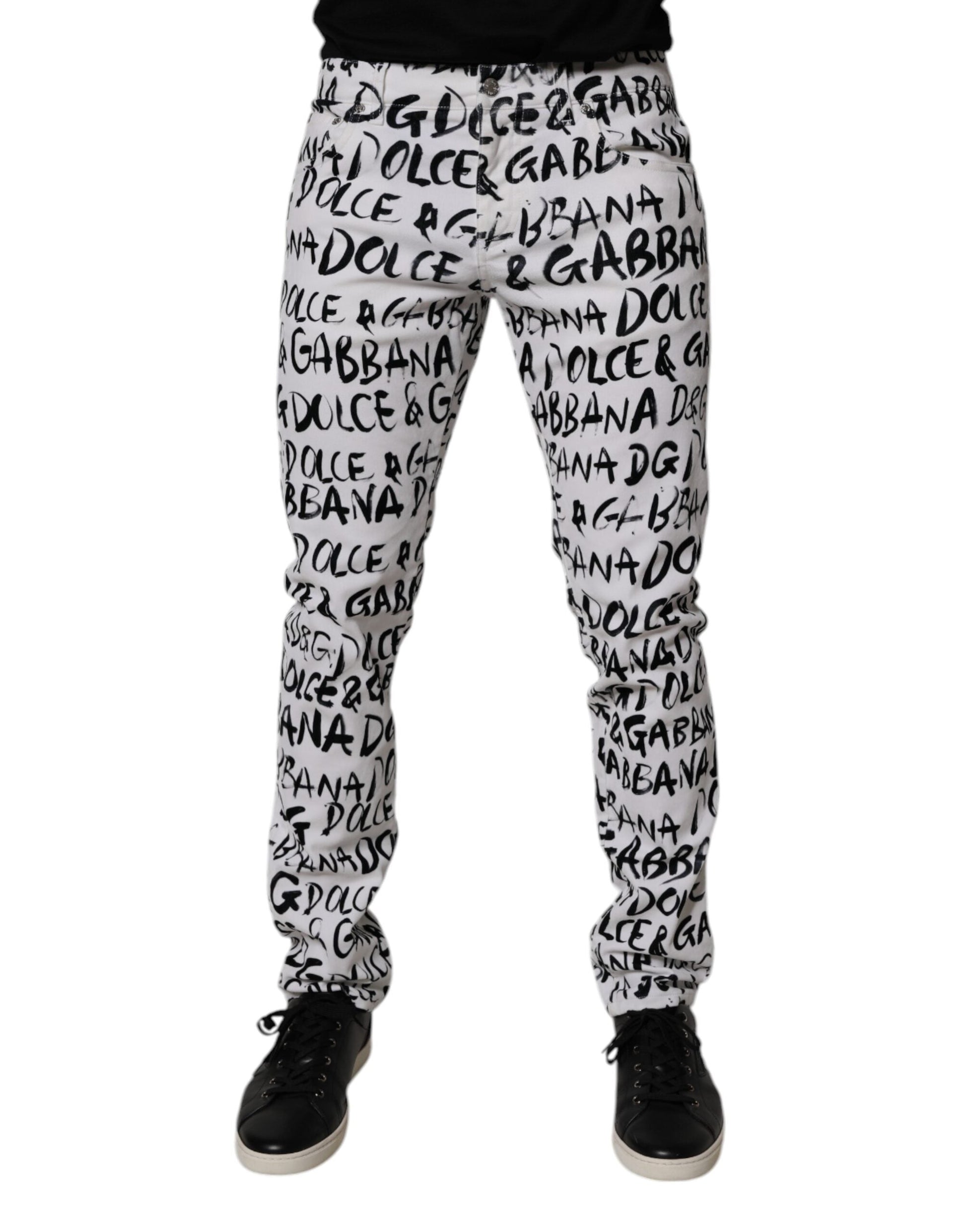 Dolce & Gabbana White Cotton Logo Print Skinny Denim Men's Jeans