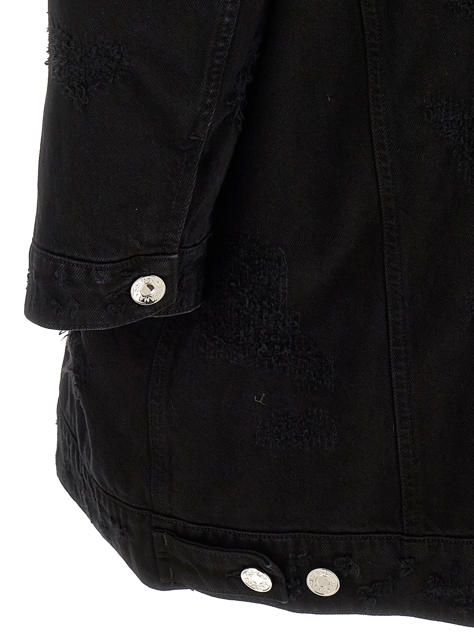 Long jacket in slightly padded used-effect denim lined with leopard-print stretch satin, metal logo plaque on the back, button closure, pockets, long cuffed sleeves.
