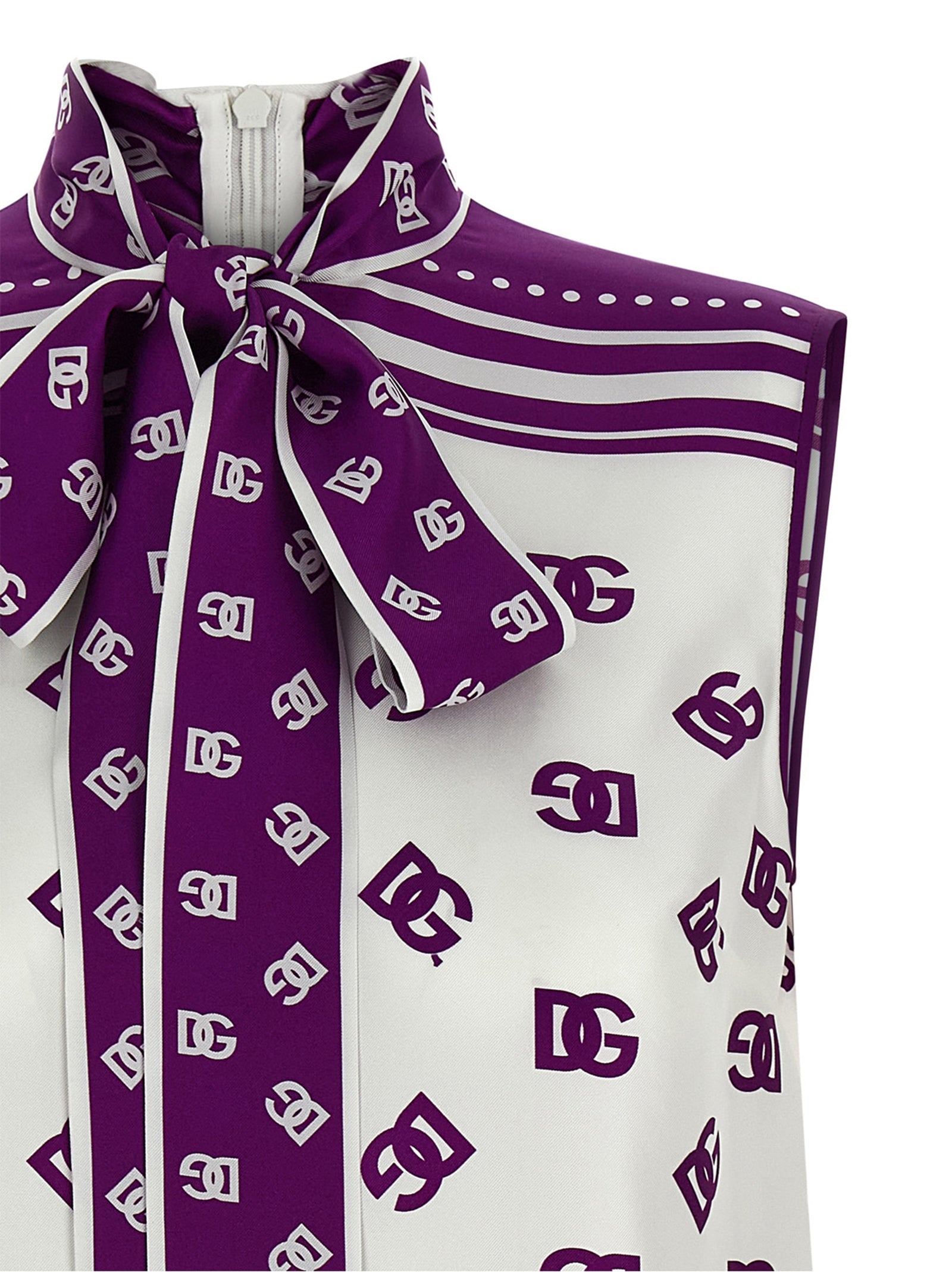 Top in all-over DG print silk twill, lavallière collar, back zip closure.
