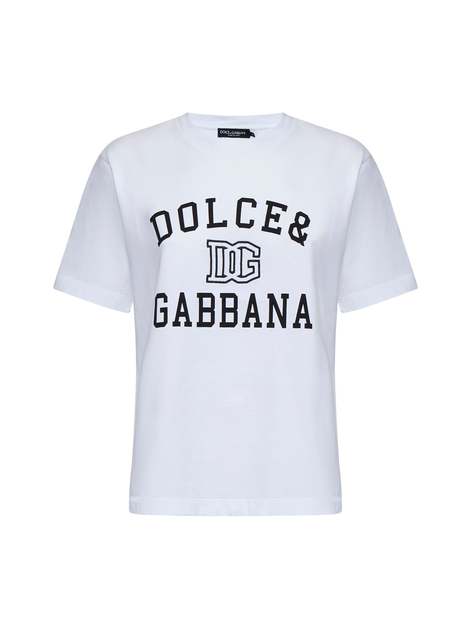 Dolce & Gabbana's white cotton t-shirt featuring a crew neck, printed lettering logo + embroidered DG logo on the front.