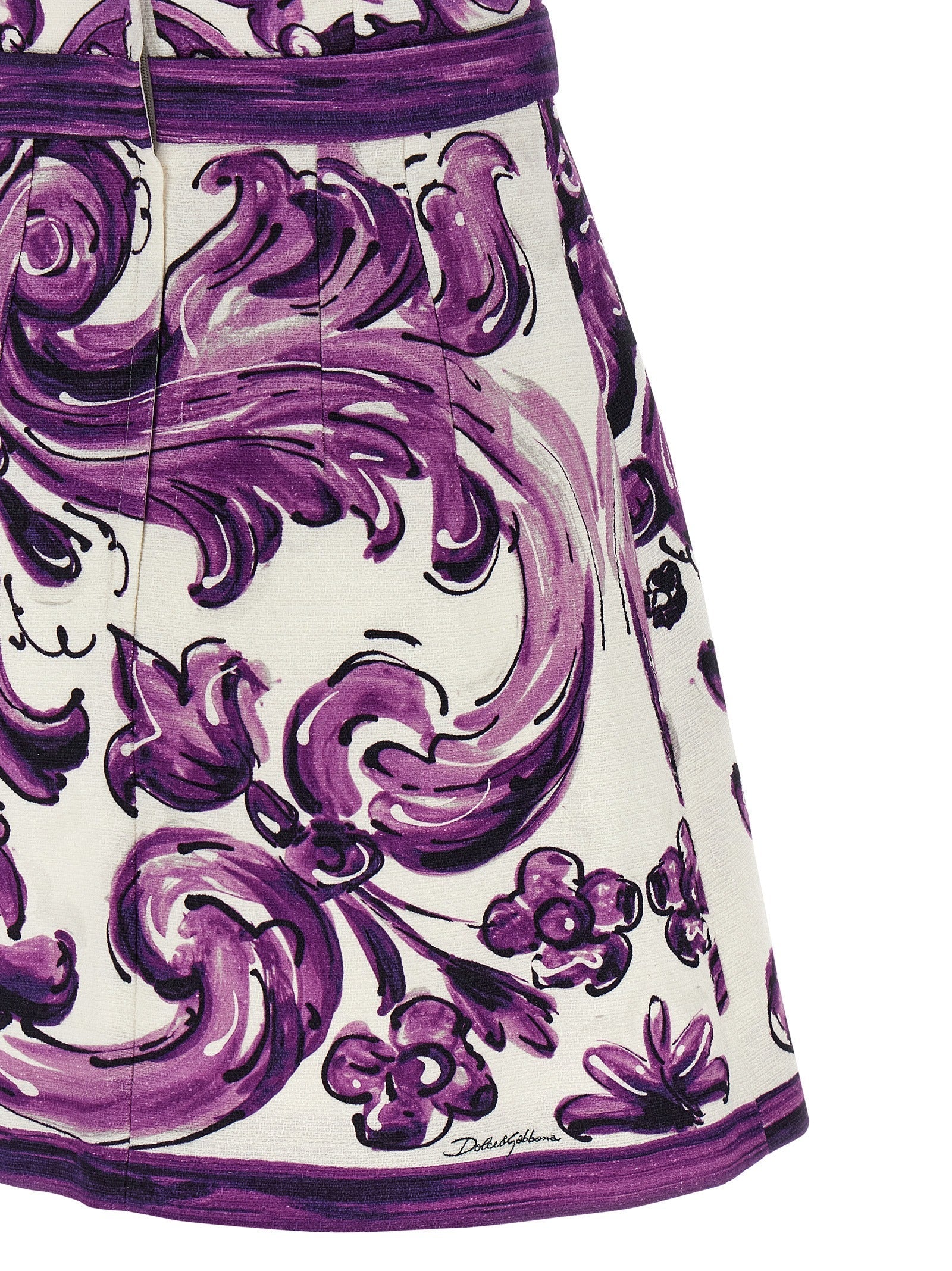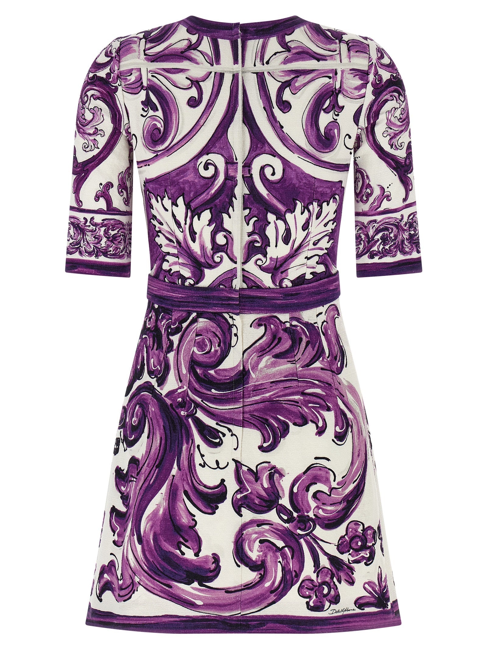 Linen blend dress, maiolica print, crew neck, belt stitched at the waist, back zip and hook closure, short sleeves.