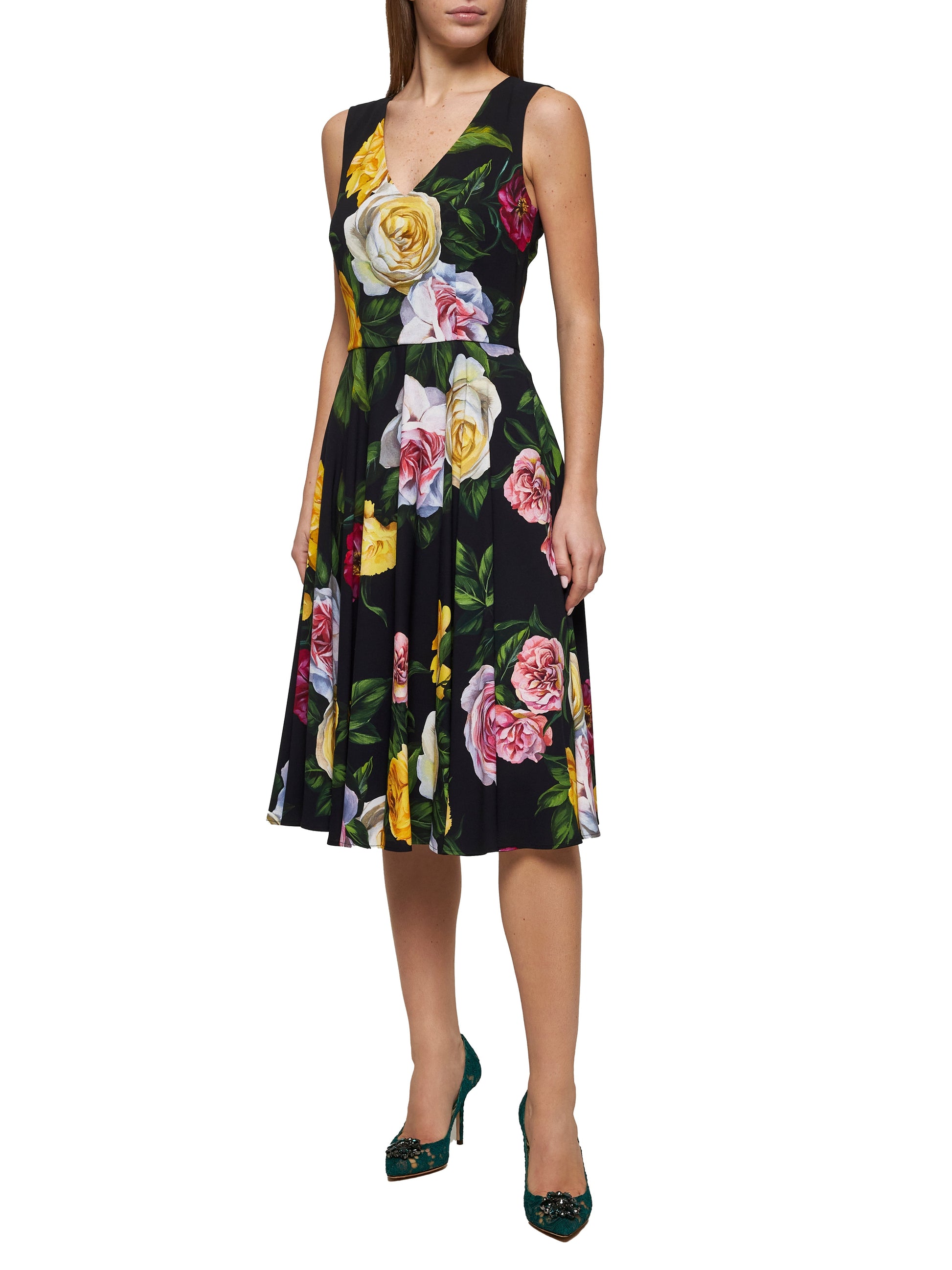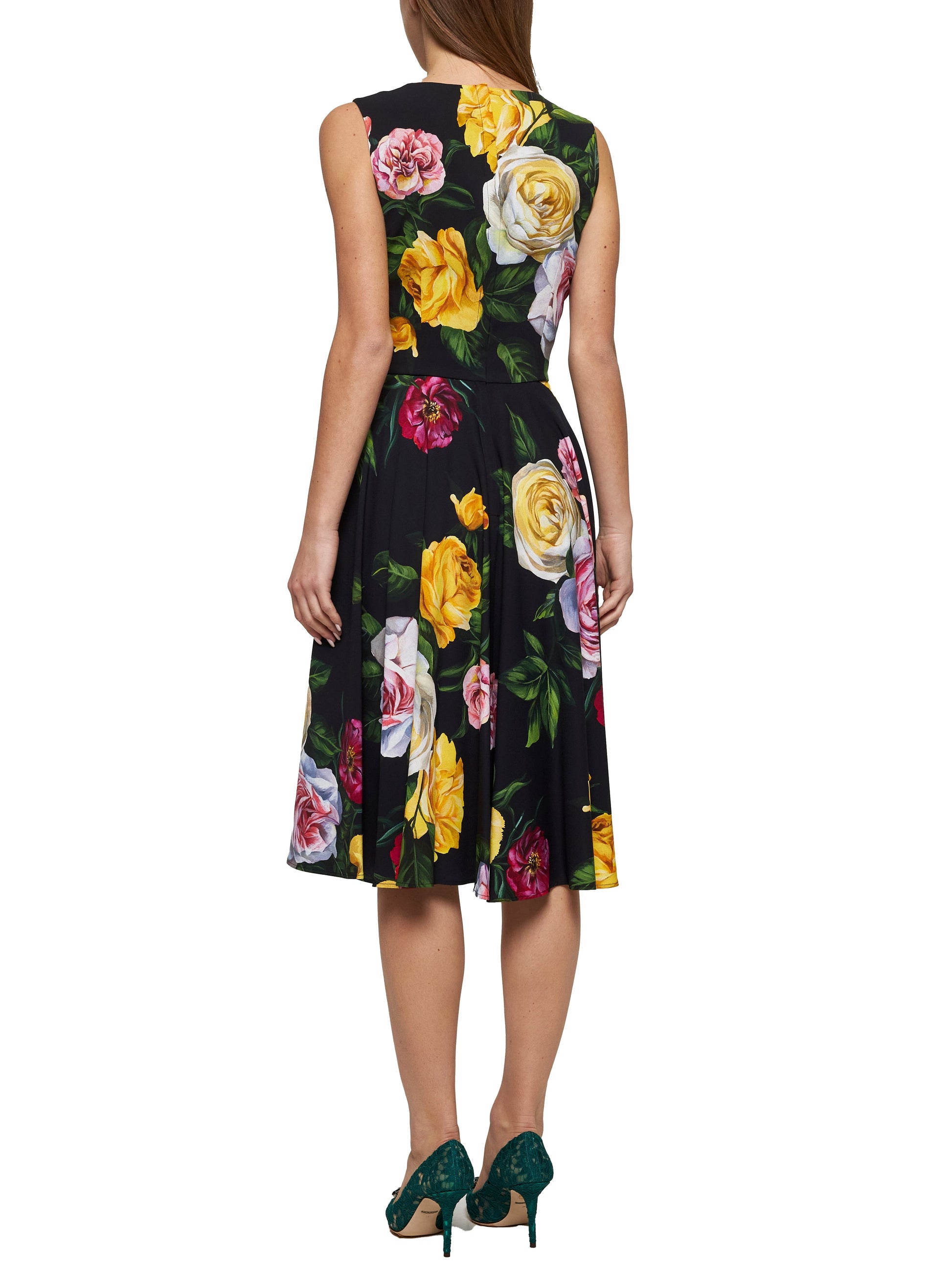 •Back concealed zip closure•V-neck•Sleeveless•Waist cut•Side pockets•Full skirt•All-over multicolor Peony and Rose print•Partially lined in stretch silk crepe de chine•Stretch cady design•Color: multicolor•97% Viscose, 3% Elastane•Made in Italy